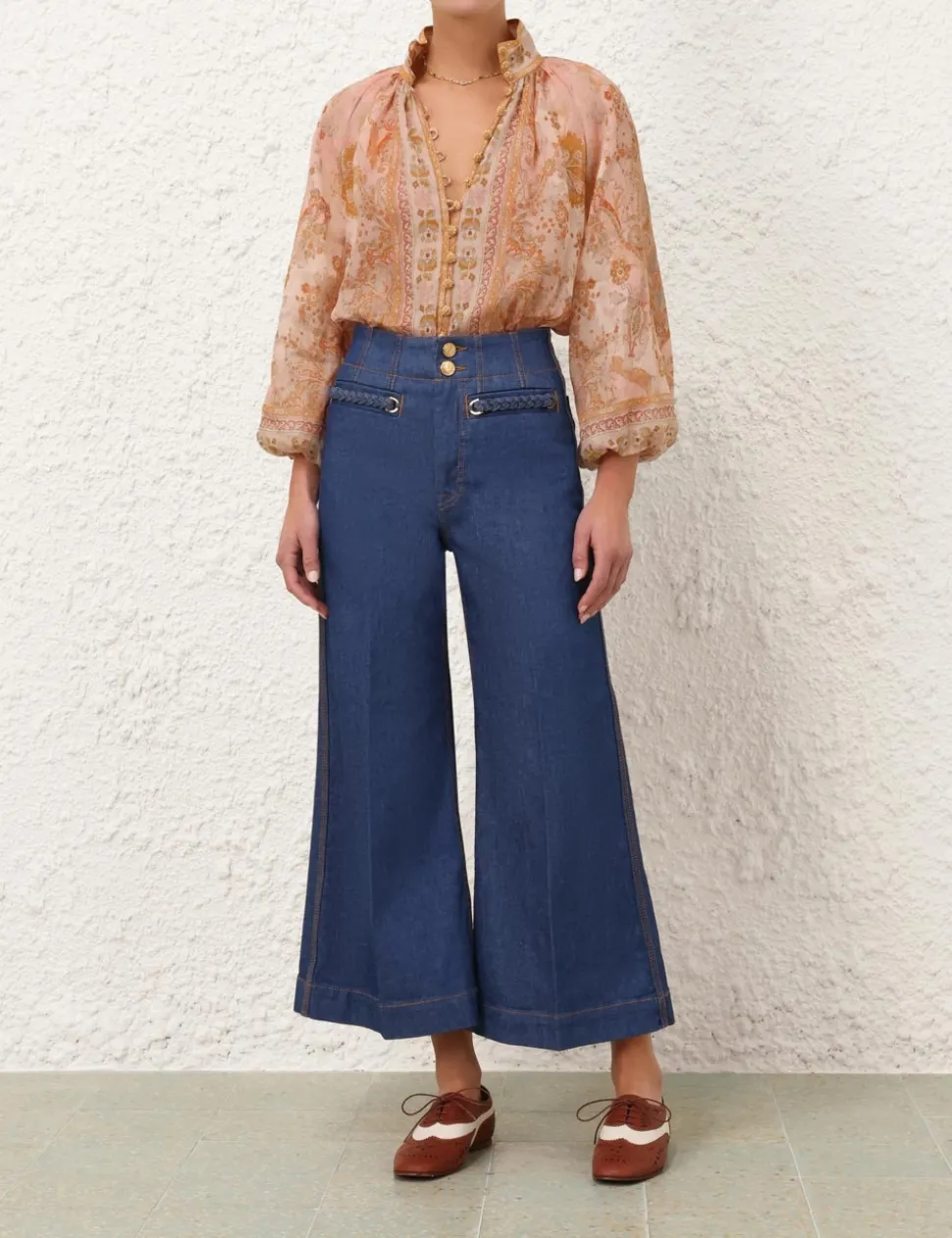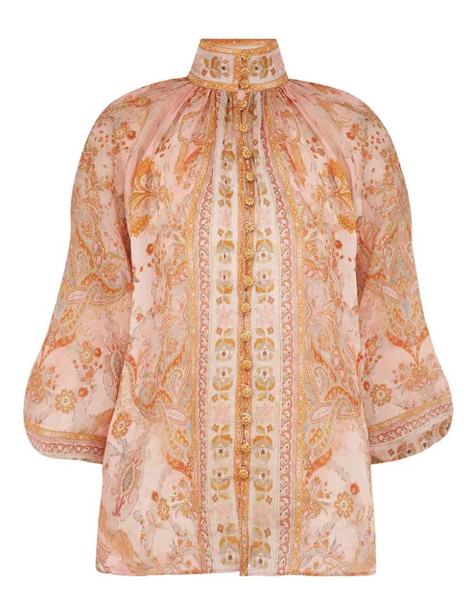 The Acacia Billow Blouse in Cream/Pink Multi from our Resort Swim 2025 Collection. A ramie placement print blouse featuring rouleau loops and buttons down the centre front.