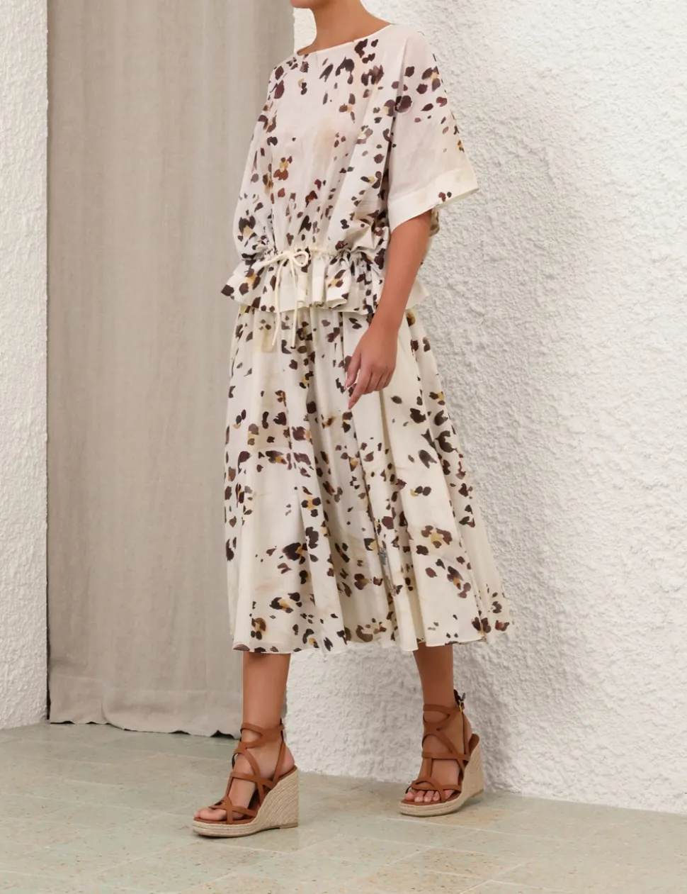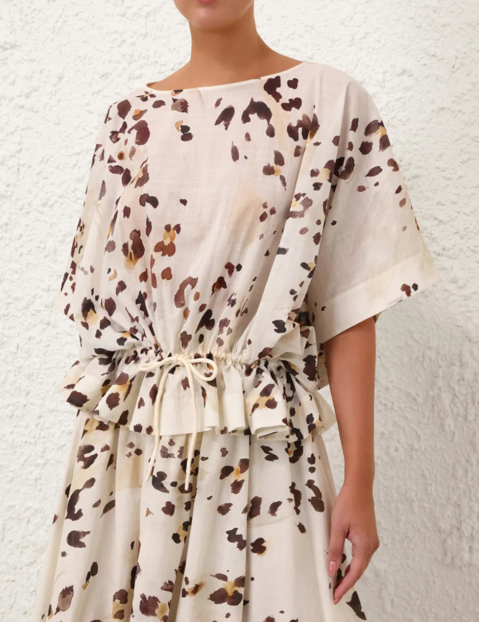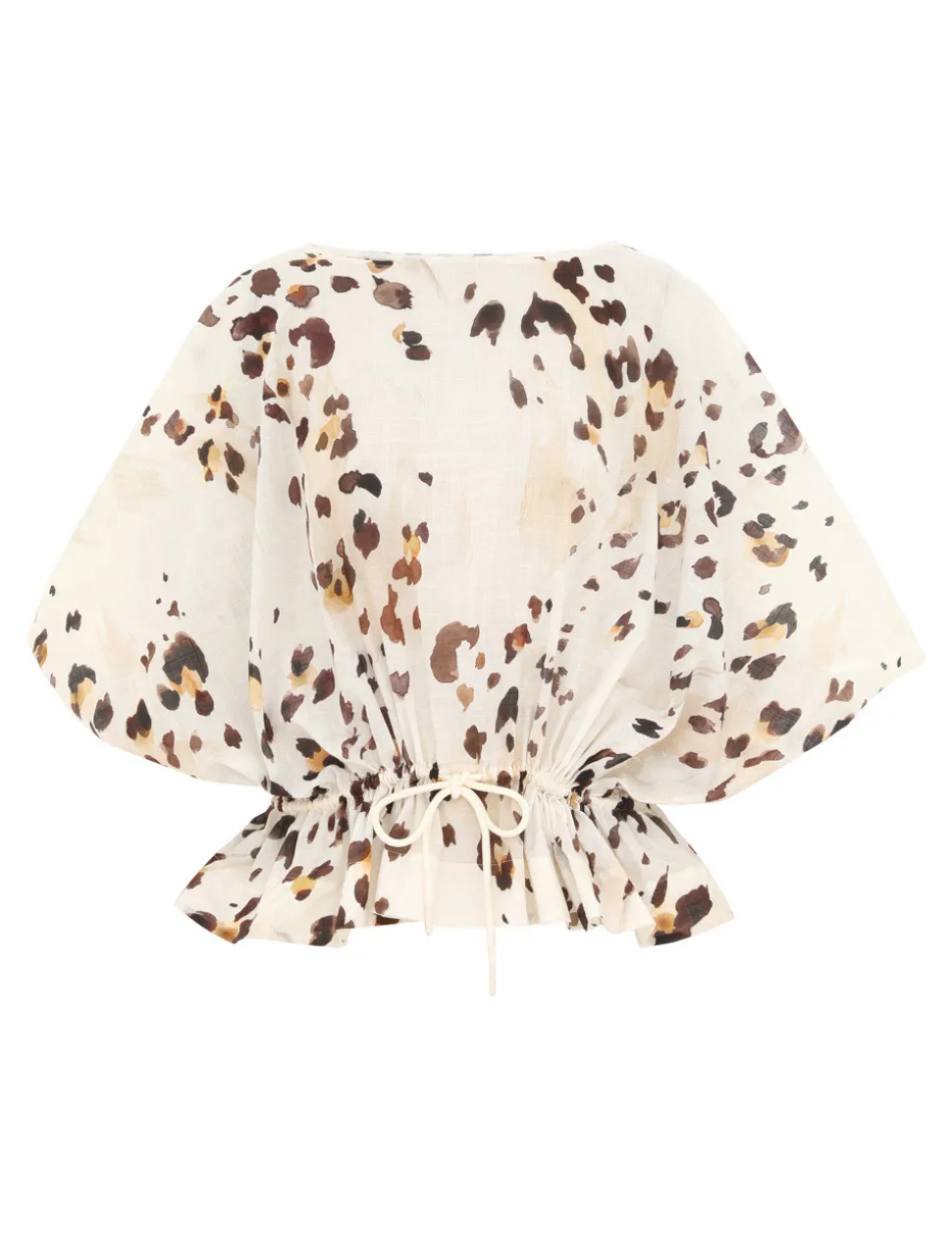 The Acacia Draw Waist Top in Watercolour Leopard from our Resort Swim 2025 Collection. A cotton shirt featuring wide short sleeves, boat neckline and drawstring waistband with rope ties.