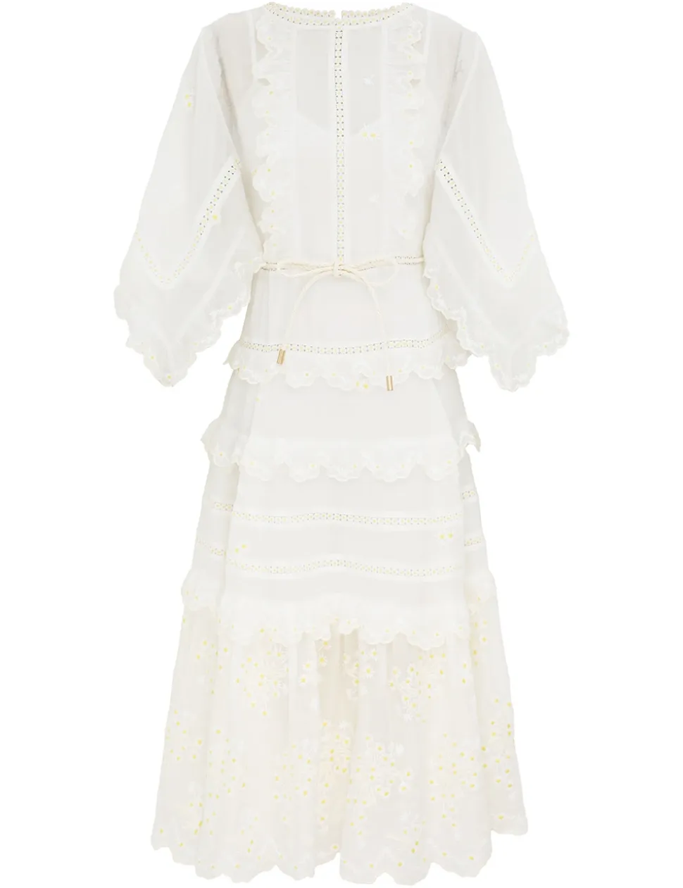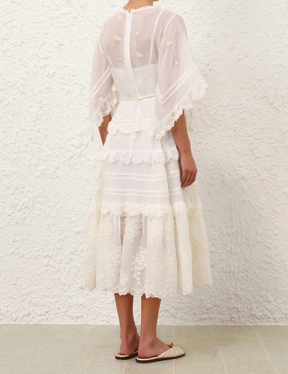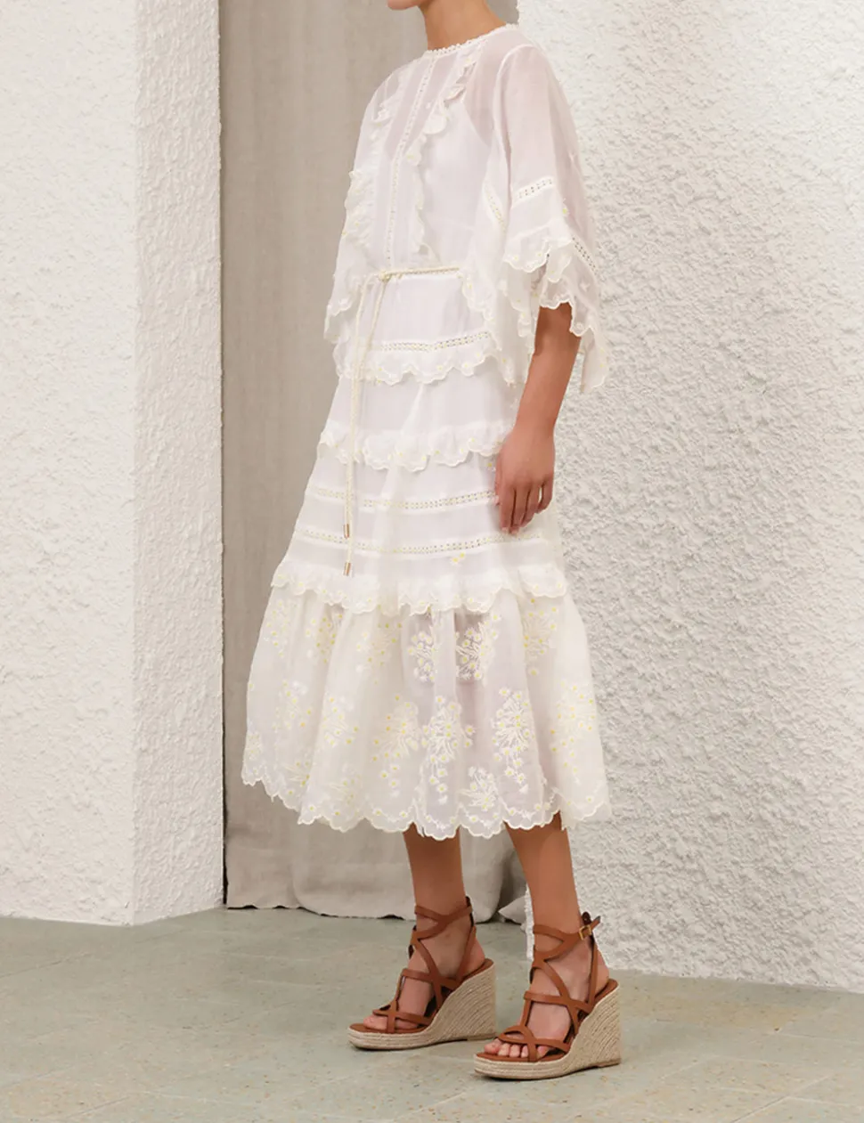 The Acacia Embroidered Midi Dress in Ivory from our Resort Swim 2025 Collection. A ramie midi dress featuring embroidered detail, scallop hem frills throughout finished with wide square sleeves.