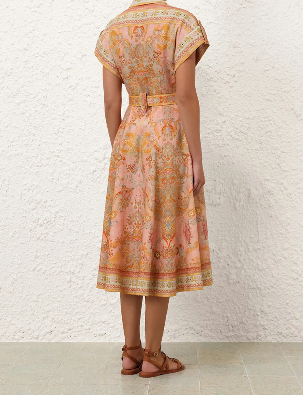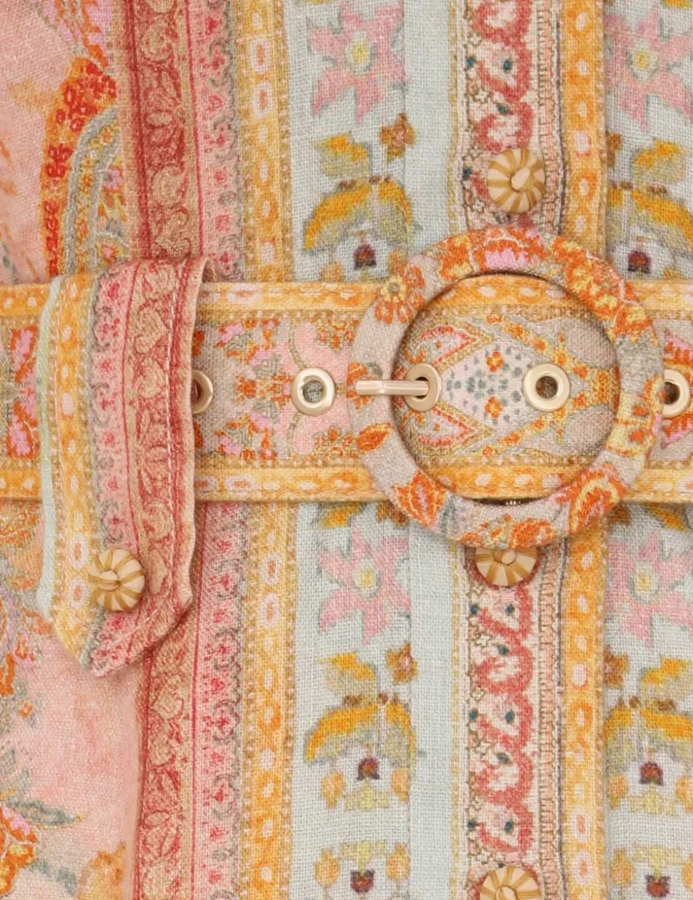 The Acacia Midi Shirt Dress in Pink Multi from our Resort Swim 2025 Collection. A linen midi dress featuring a deep V-neckline, rolled sleeves and buttons down the centre front; finished with a removable self covered belt.