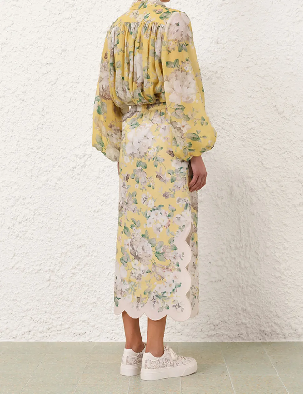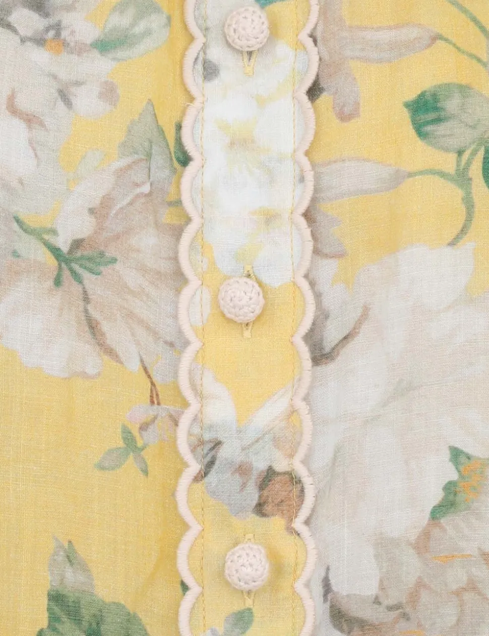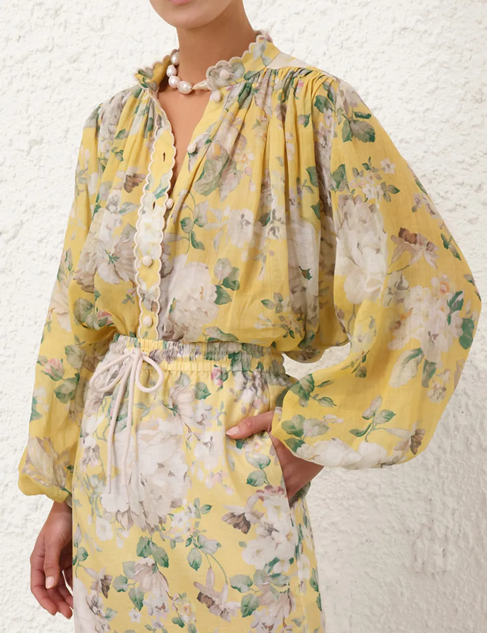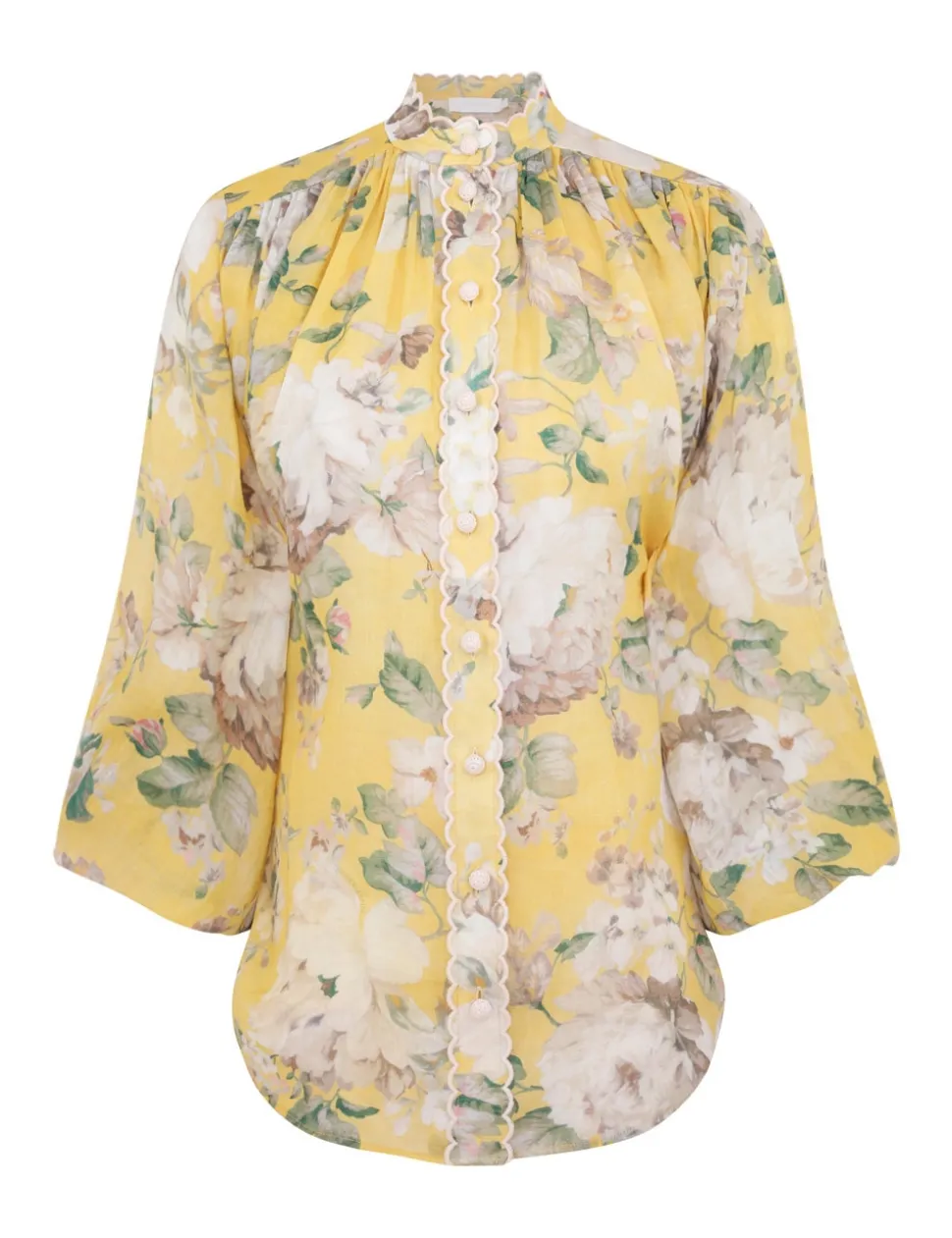 The Acacia Scallop Blouse in Yellow Floral from our Resort Swim 2025 Collection. A ramie blouse featuring long batwing sleeves with elasticated cuffs, scallop trim down the centre front and a mandarin collar.