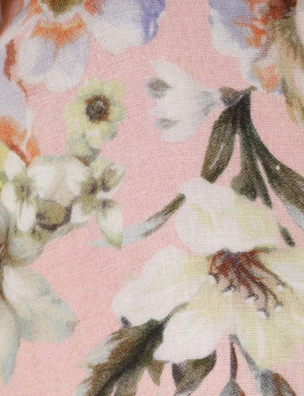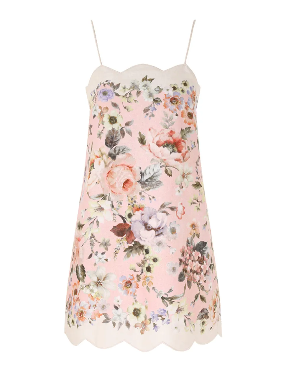 The Acacia Scallop Mini Dress in Pink Floral from our Resort Swim 2025 Collection. A linen mini dress featuring a contrast scalloped hem and self tie shoulder straps.
