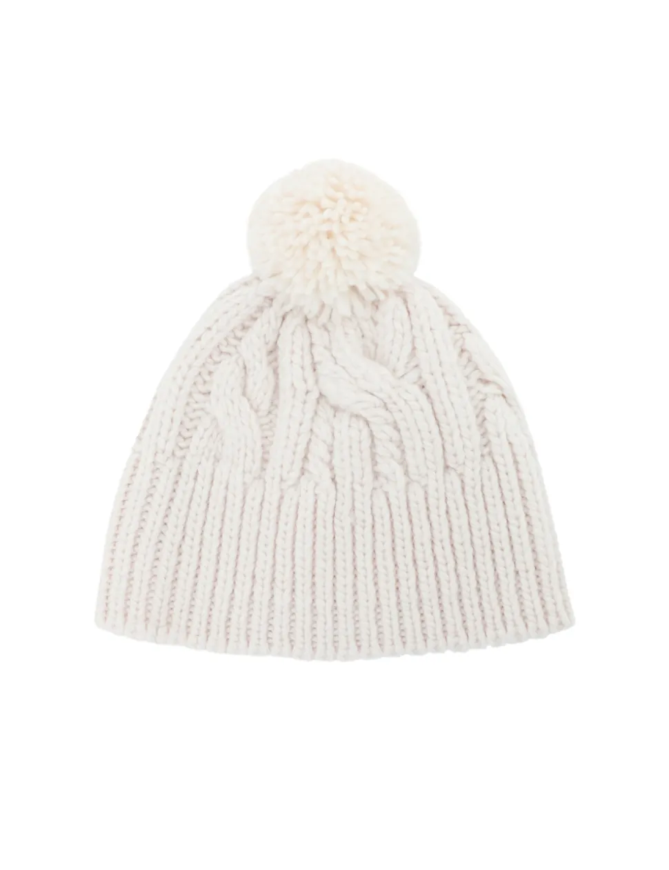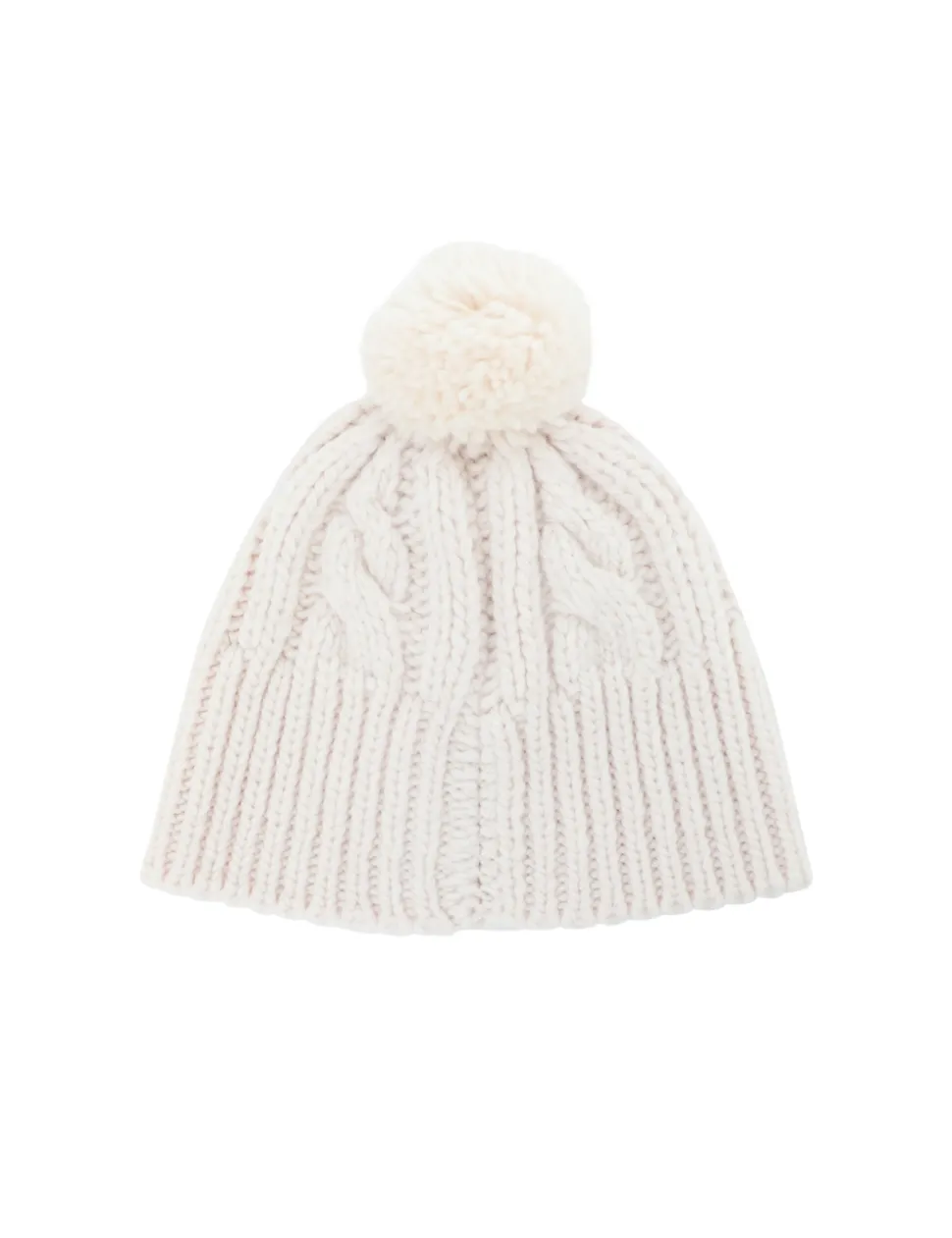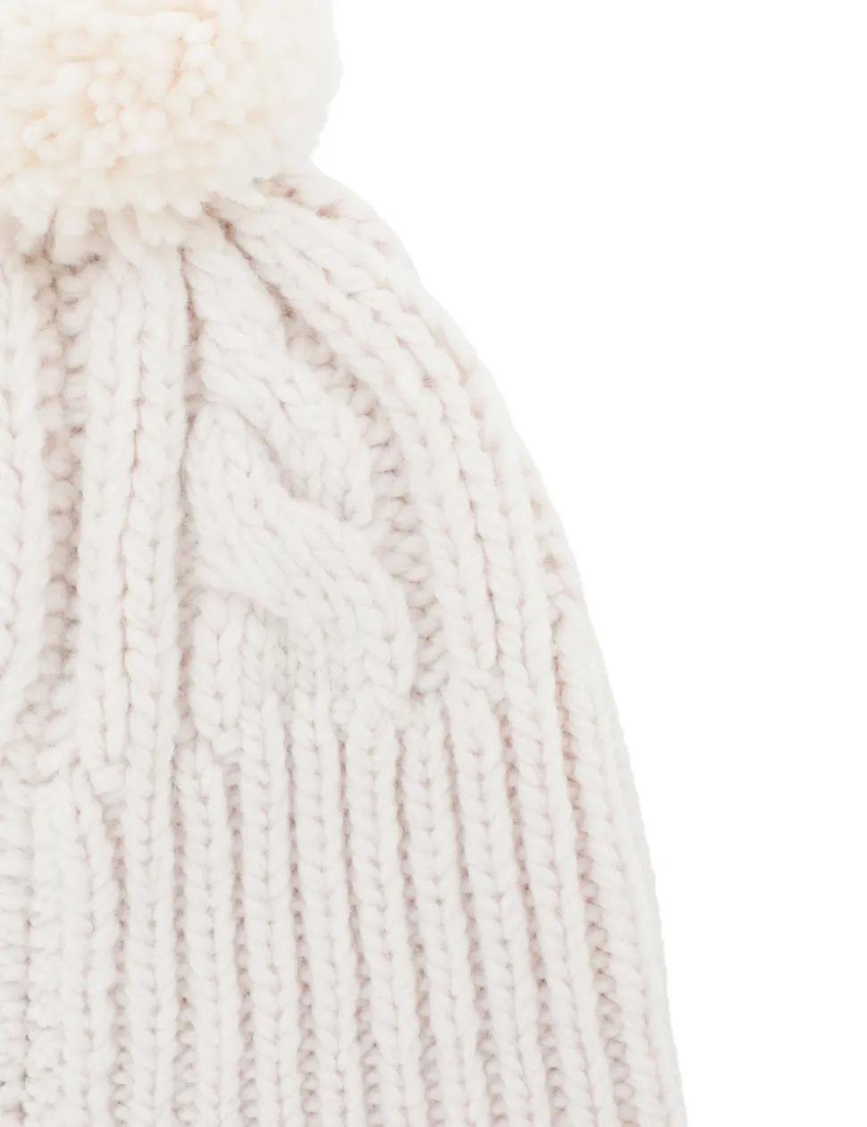 The Cable Knit Beanie in Cream from our Fall 2024 Collection, In Illustration. A cable knit beanie featuring a fluffy pom-pom detailing.