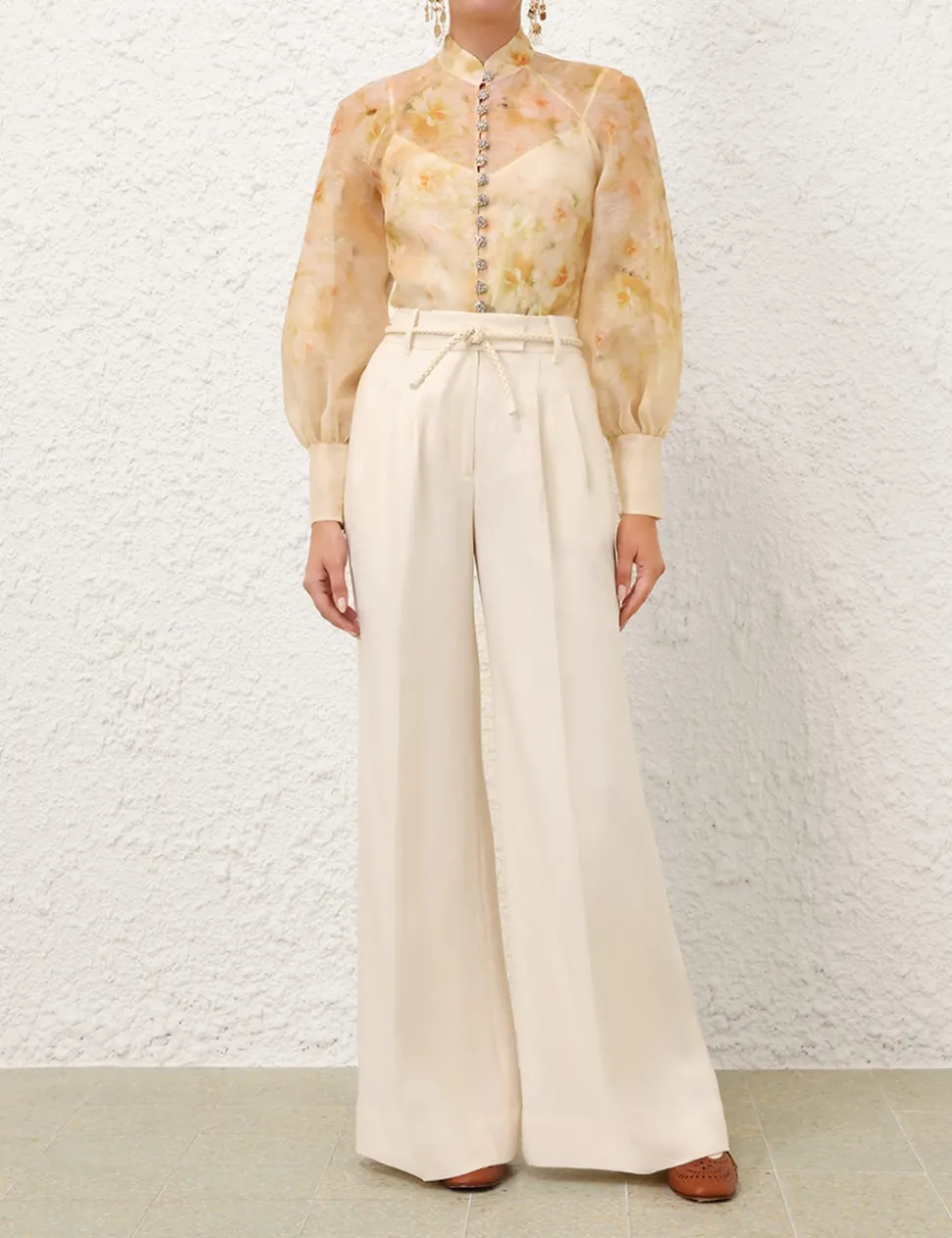 The Crush Buttoned Blouse in Yellow Floral from our Resort 2025 Collection, Crush. A silk linen blouse featuring a stand collar, elongated blouson sleeves and crystal buttons down the centre front.