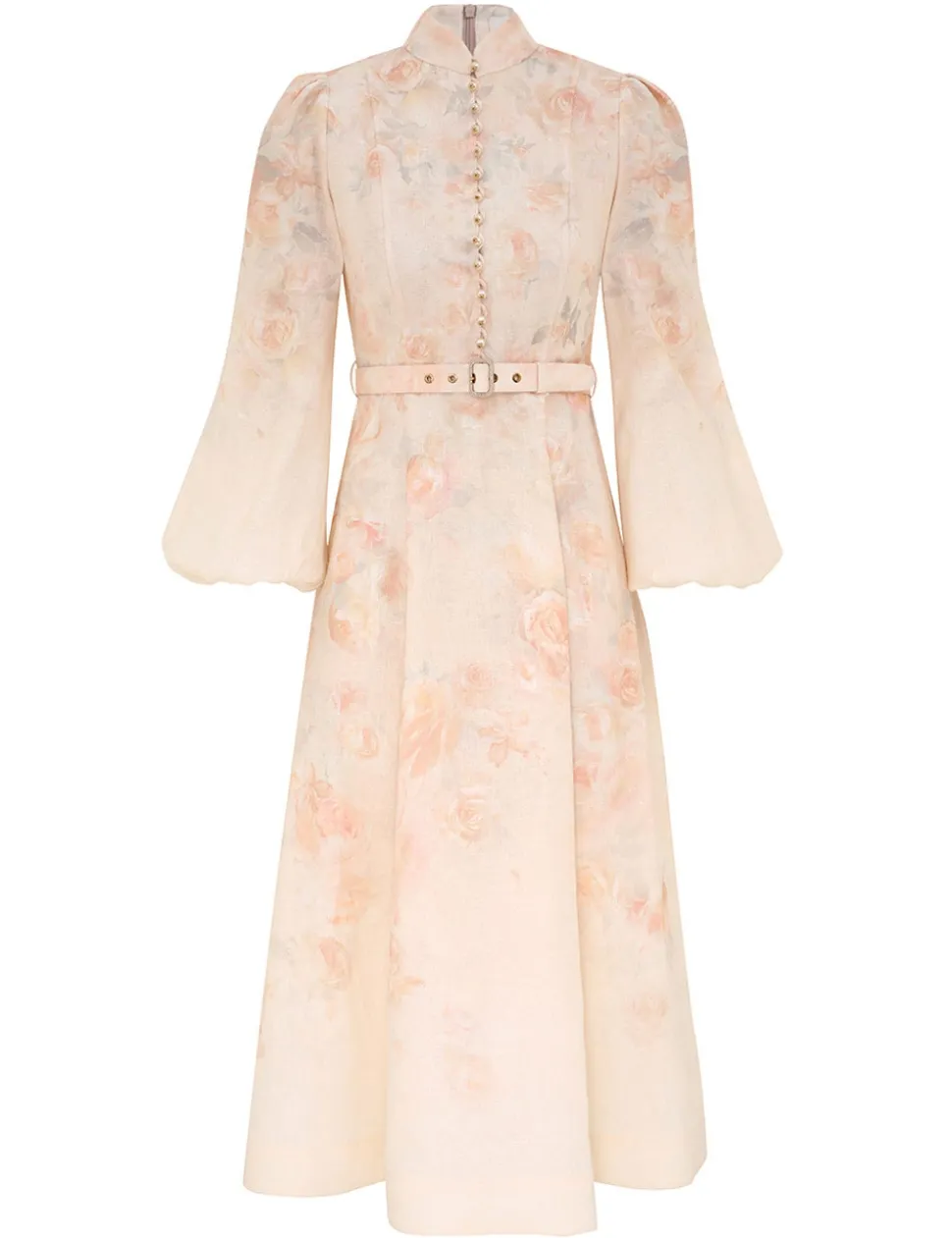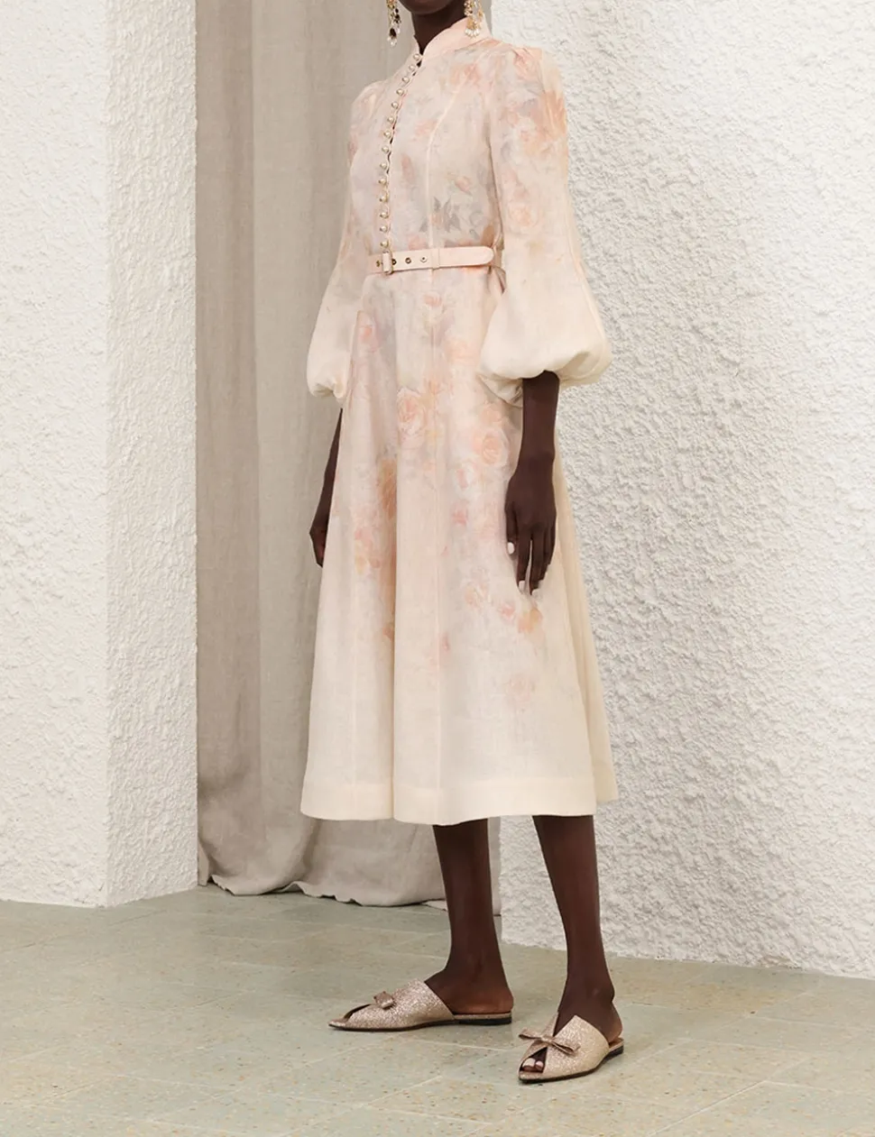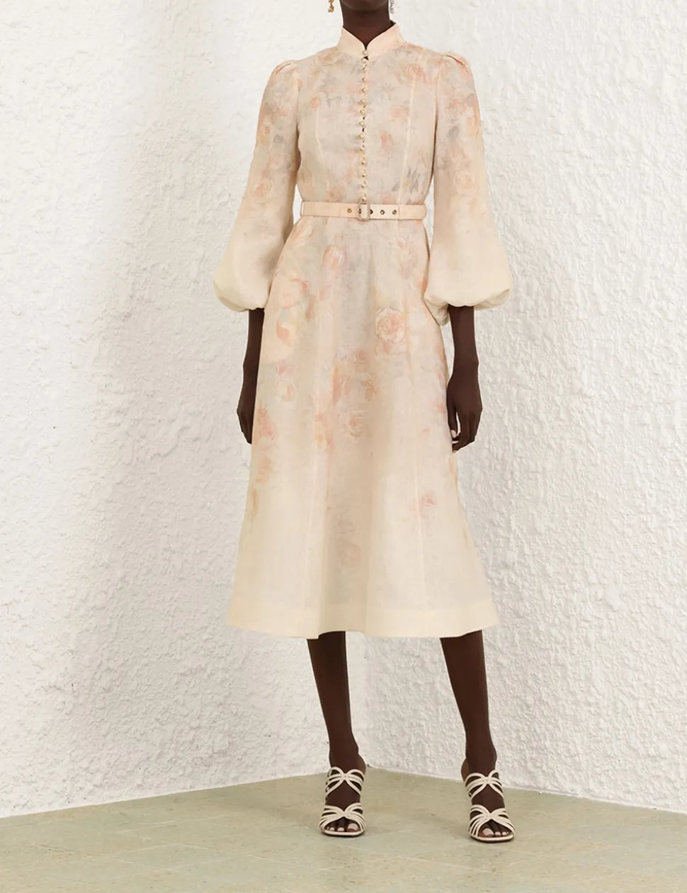 The Crush Buttoned Midi Dress in Ciara Floral from our Resort 2025 Collection, Crush. A linen midi dress featuring long blouson sleeves with an elasticated cuff, buttons down the centre front bodice and a removable self covered belt.