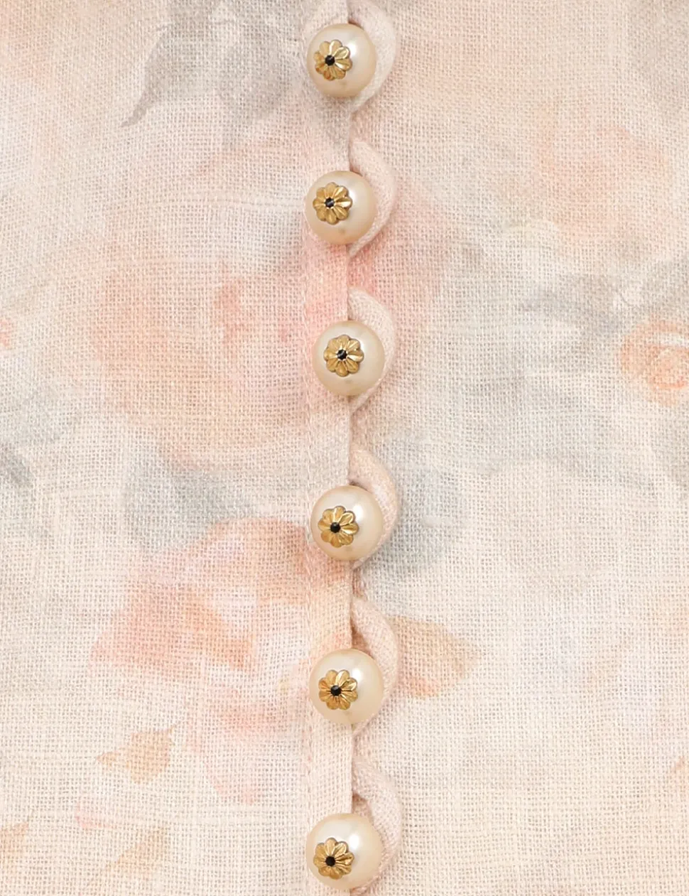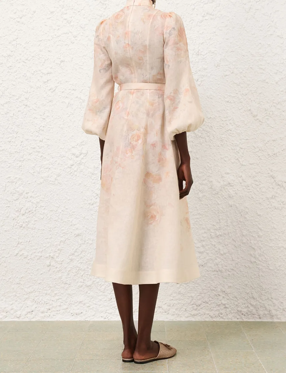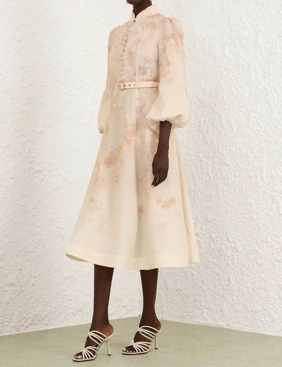 The Crush Buttoned Midi Dress in Ciara Floral from our Resort 2025 Collection, Crush. A linen midi dress featuring long blouson sleeves with an elasticated cuff, buttons down the centre front bodice and a removable self covered belt.
