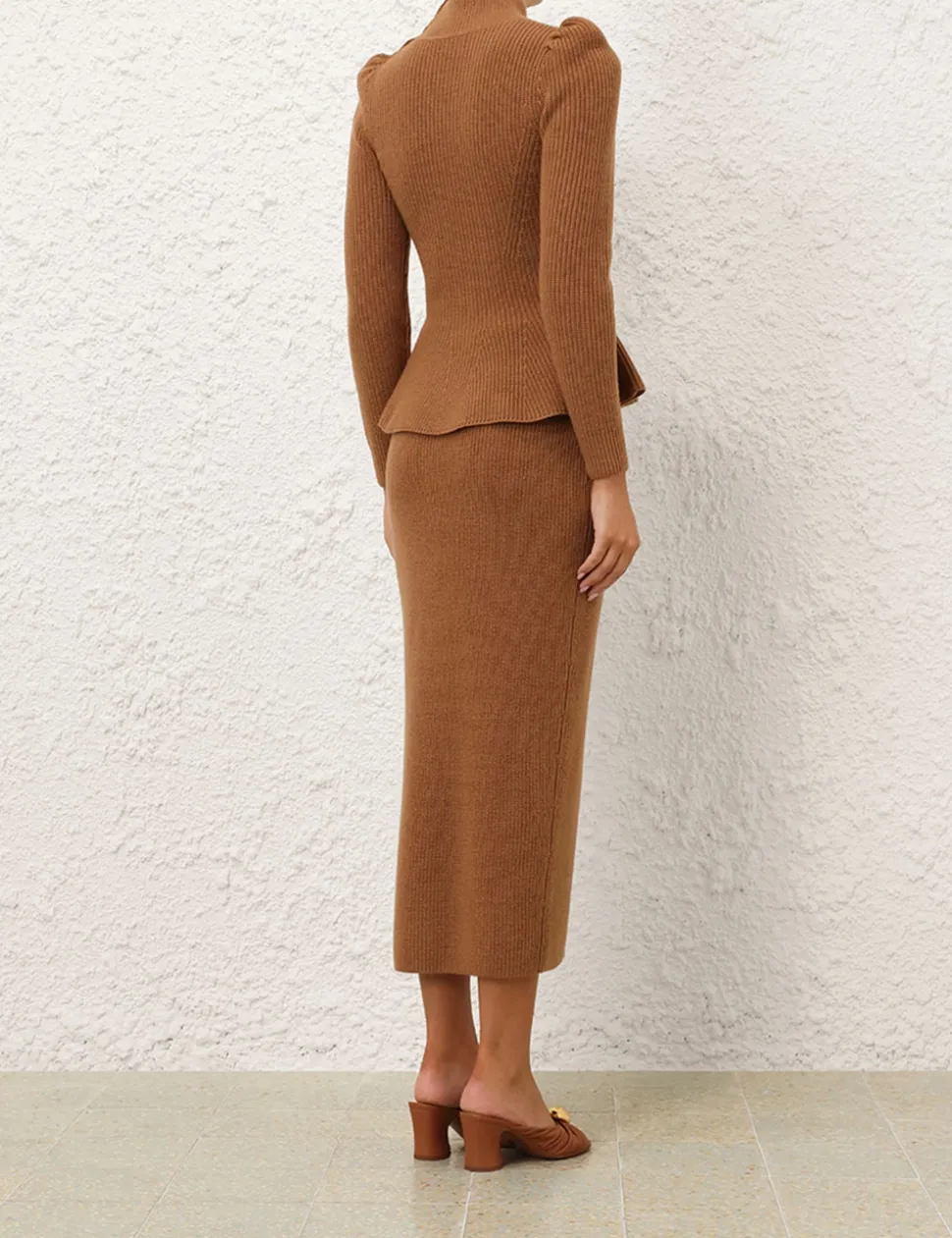 The Crush Buttoned Sweater in Tan from our Resort 2025 Collection, Crush. A ribbed peplum long sleeve sweater featuring a high neck with button detailing.