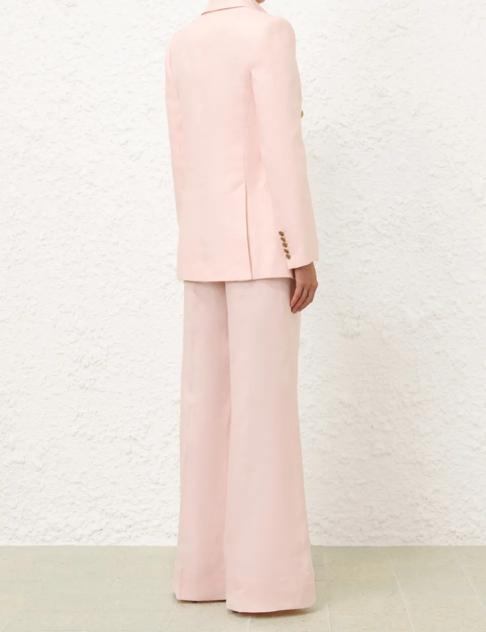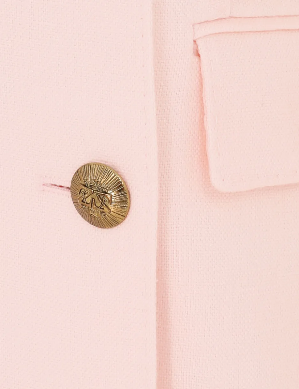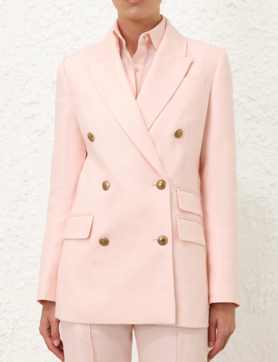 The Crush Double Breasted Jacket in Pink from our Resort 2025 Collection, Crush. A linen long line jacket featuring patch pockets with flaps, double breasted closure and shoulder pads.