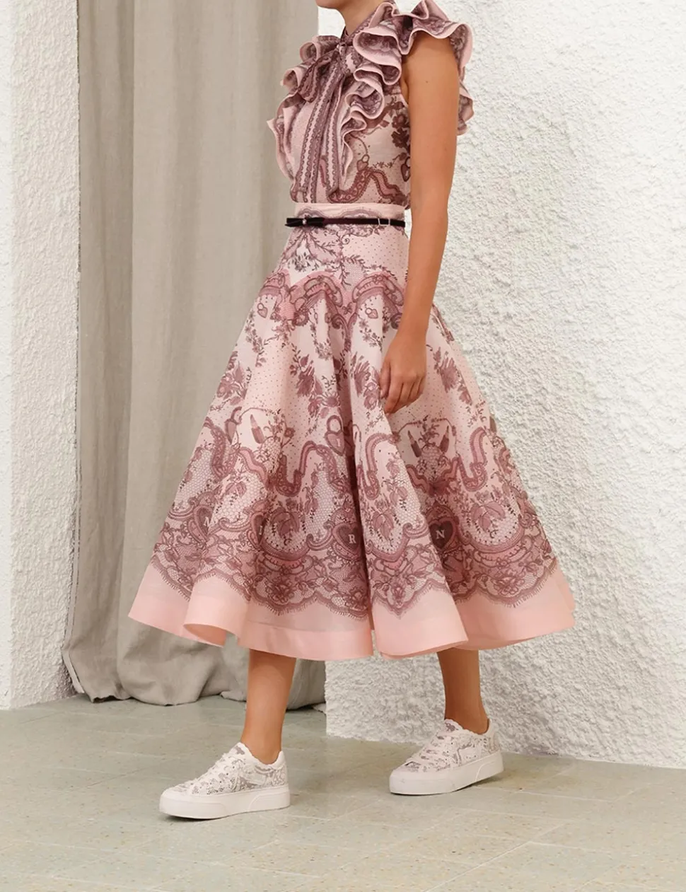 The Crush Frilled Fitted Blouse in Pink Lace Print from our Resort 2025 Collection, Crush. A silk linen organza blouse featuring short sleeves with double layered frills, a stand collar with a neck tie featuring velvet bow detailing; finished with crystal buttons down the centre front.