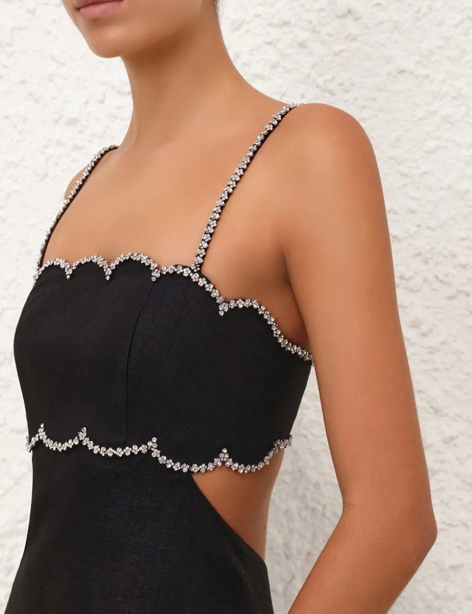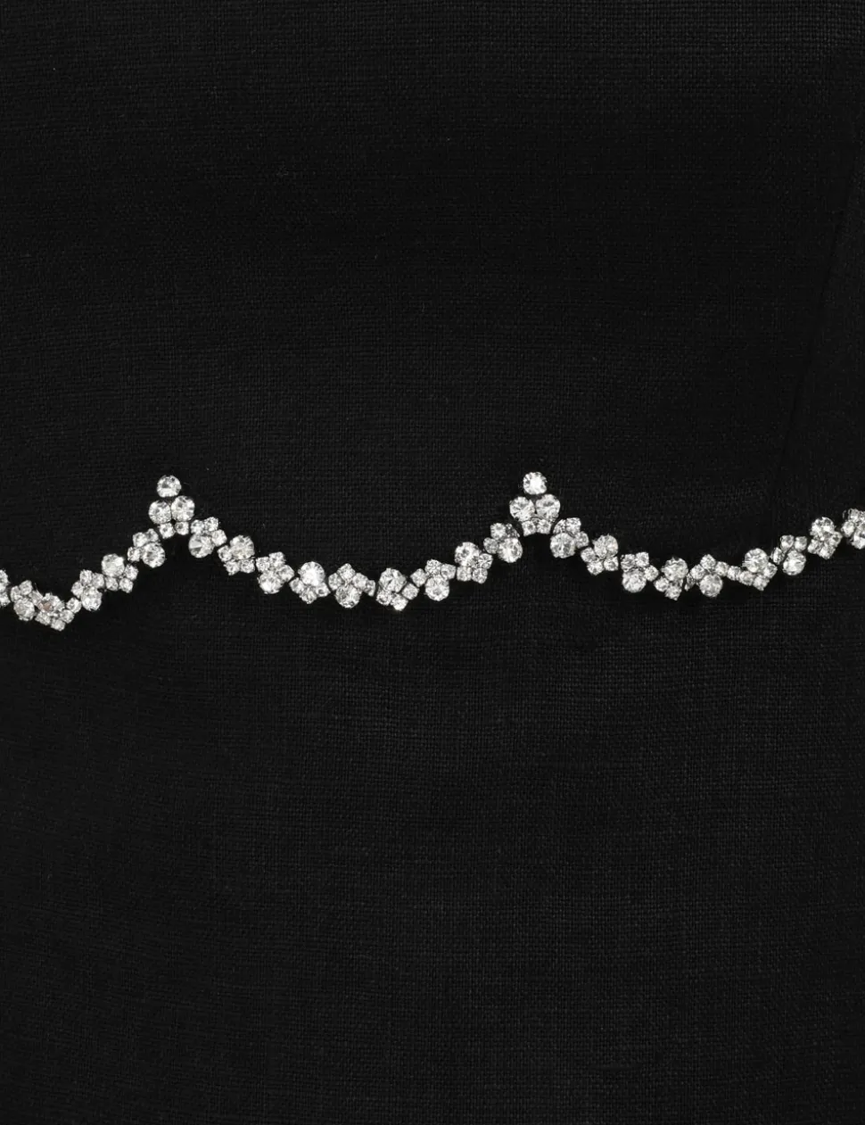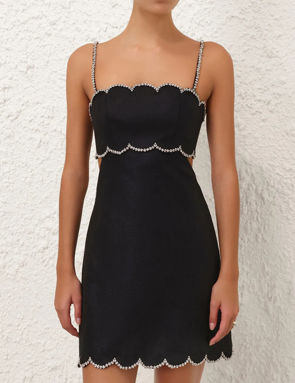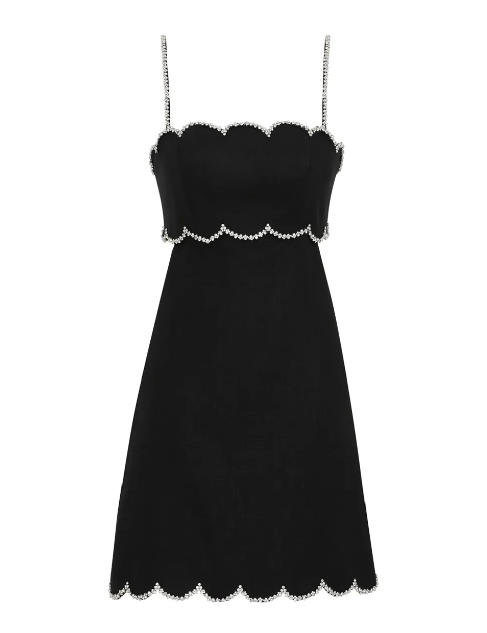 The Crush Scalloped Mini Dress in Black from our Resort 2025 Collection, Crush. A linen mini dress featuring scalloped crystal trims along the bodice and hemline, with a shirred back panel and a center back zip closure.