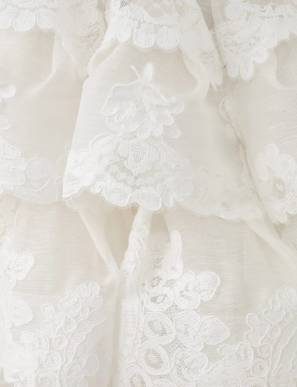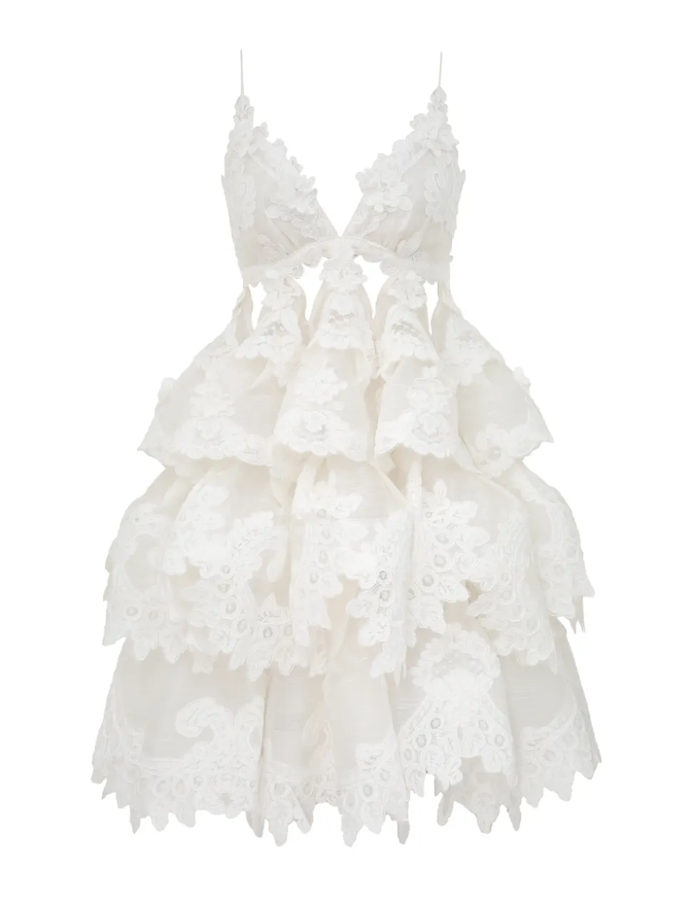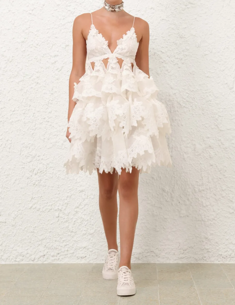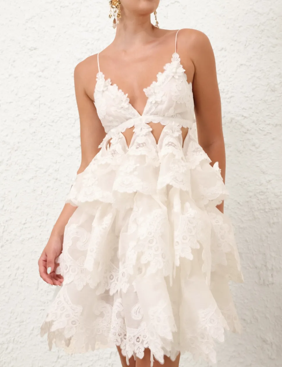 The Crush Tiered Lace Dress in Ivory from our Resort 2025 Collection, Crush. A silk linen tiered mini dress featuring a plunging V-neckline with cutouts under bust, an elastic strap at the centre back with a clasp and lace trim appliques throughout.