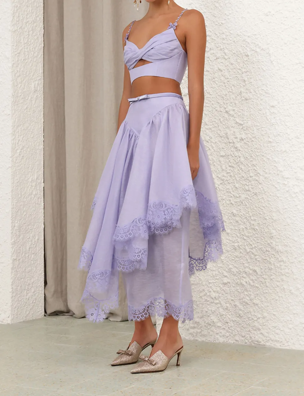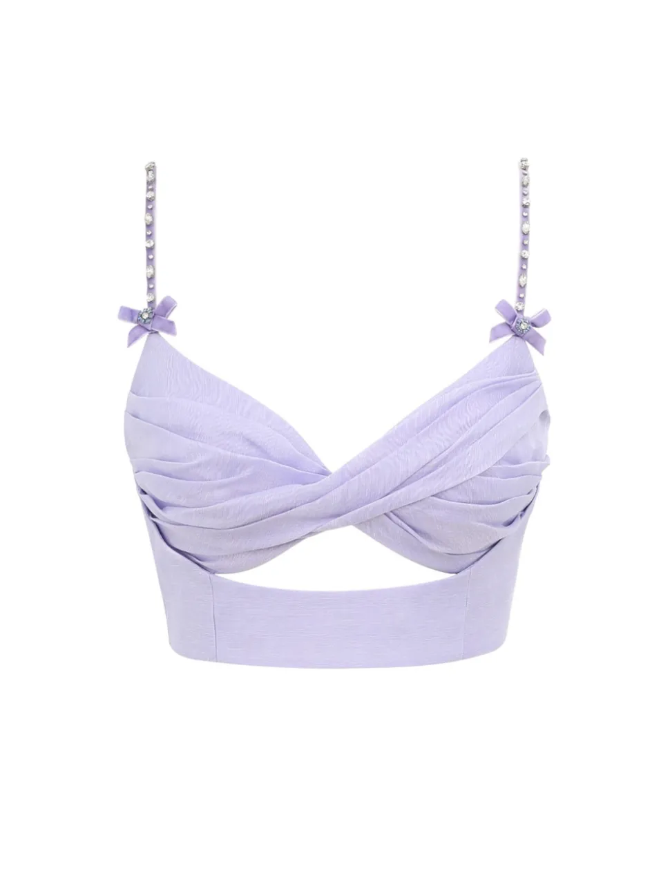 The Crush Twist Front Bralette in Jacaranda from our Resort 2025 Collection, Crush. A silk linen organza bralette featuring a twisted detailing at the centre bust with a cutout underneath, adjustable velvet straps with crystals and bow accents and shirred back with a zip closure.