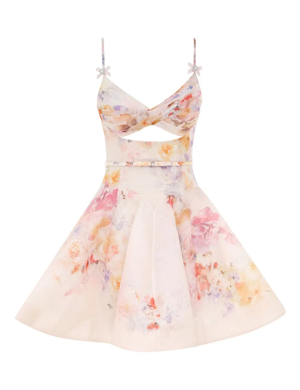 The Crush Twist Front Mini Dress in Multi Floral from our Resort 2025 Collection, Crush. A silk linen mini dress featuring a criss-cross pleat on the bodice, adjustable straps and boning along the front, side and back seam.