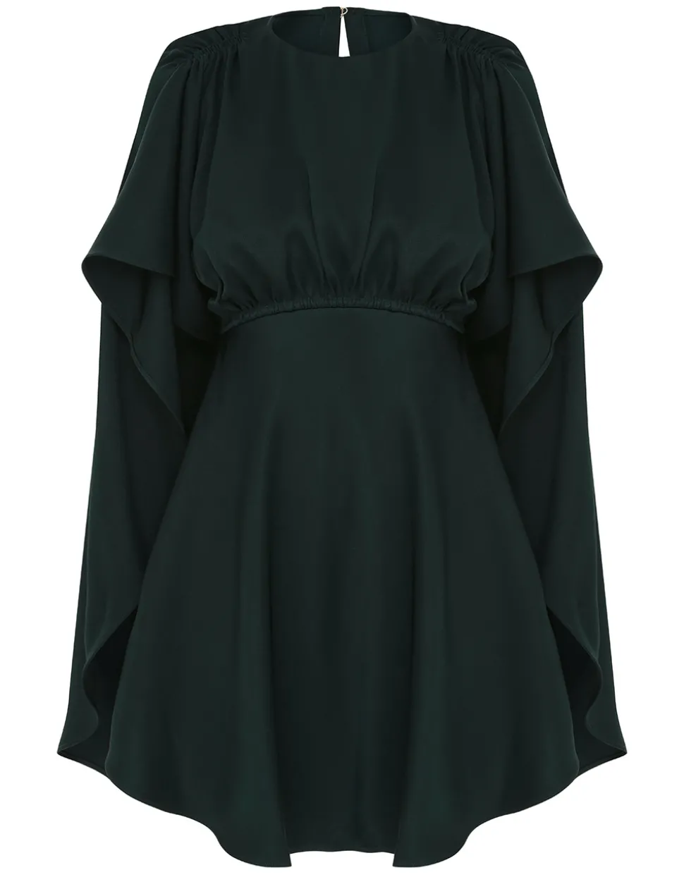 The Eden Cascading Mini Dress in Bottle Green from our Fall 2024 Collection, In Illustration. A mini dress featuring gathered under bust, ruched shoulder detail and cape style sleeves.