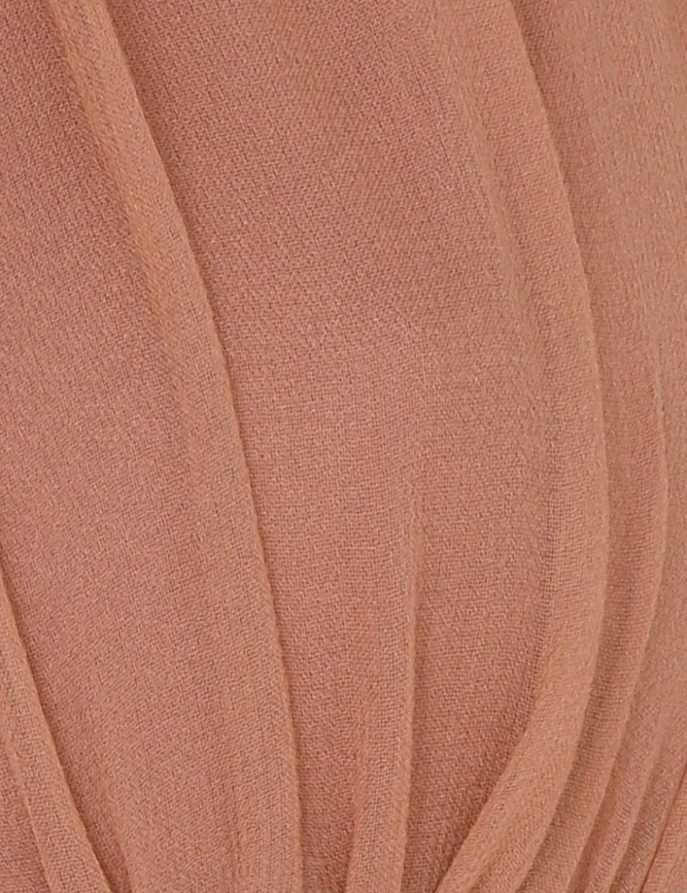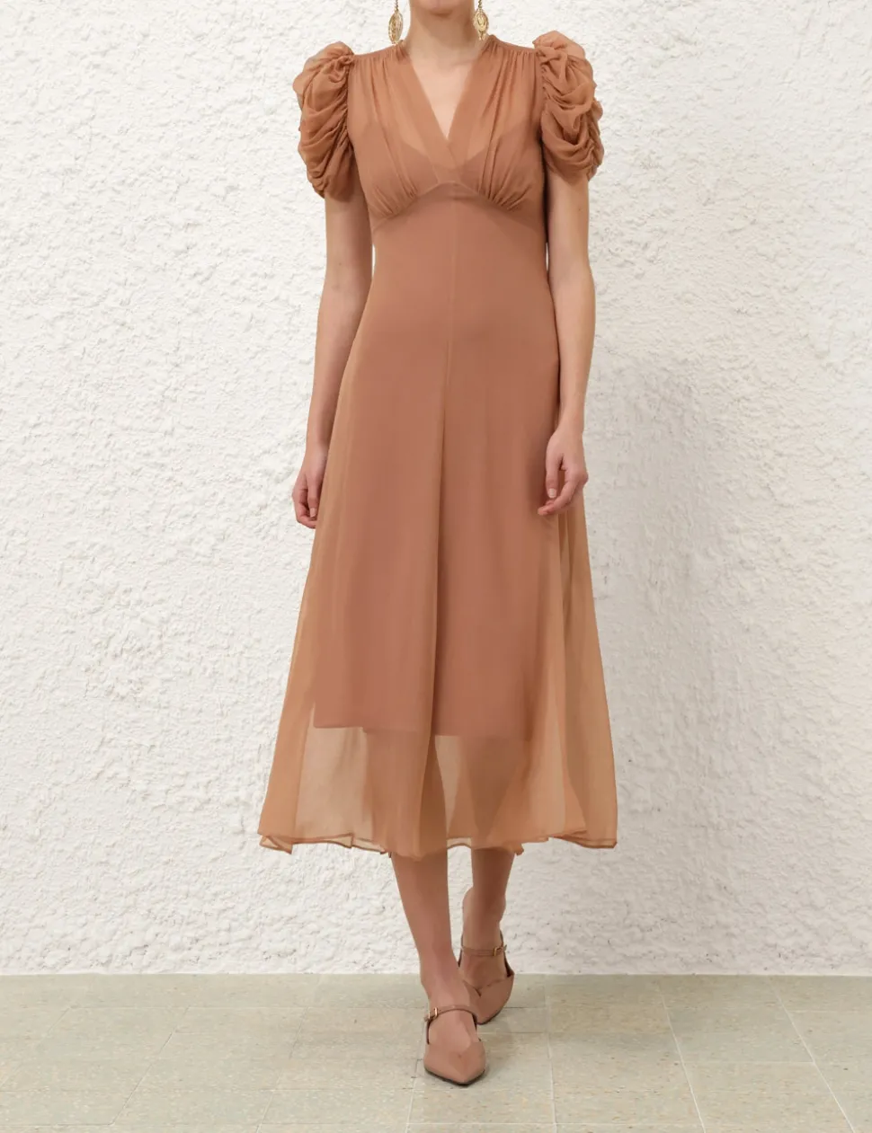 The Eden Gather Sleeve Midi in Biscuit from our Fall 2024 Collection, In Illustration. A silk midi dress featuring a plunging V-neckline and short gathered sleeves.