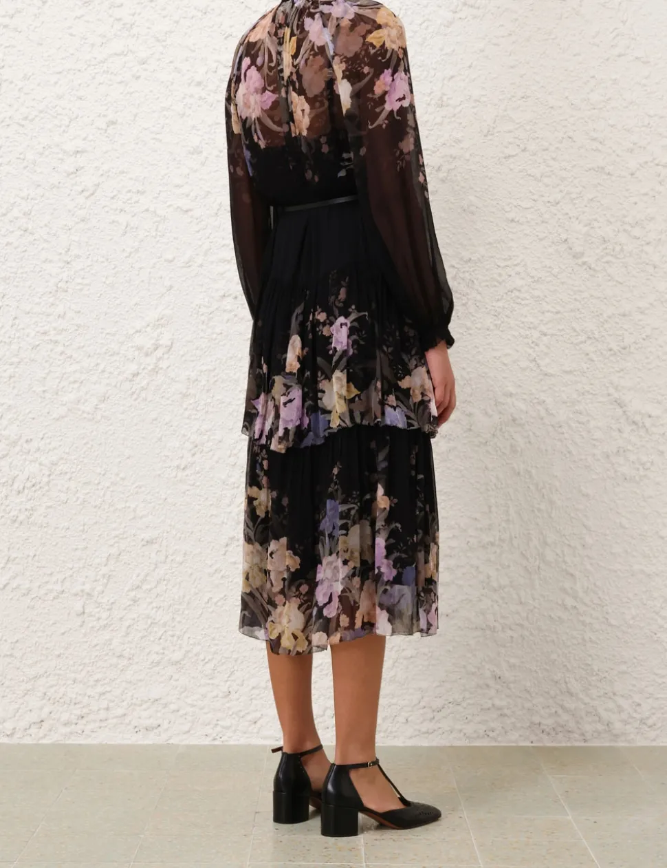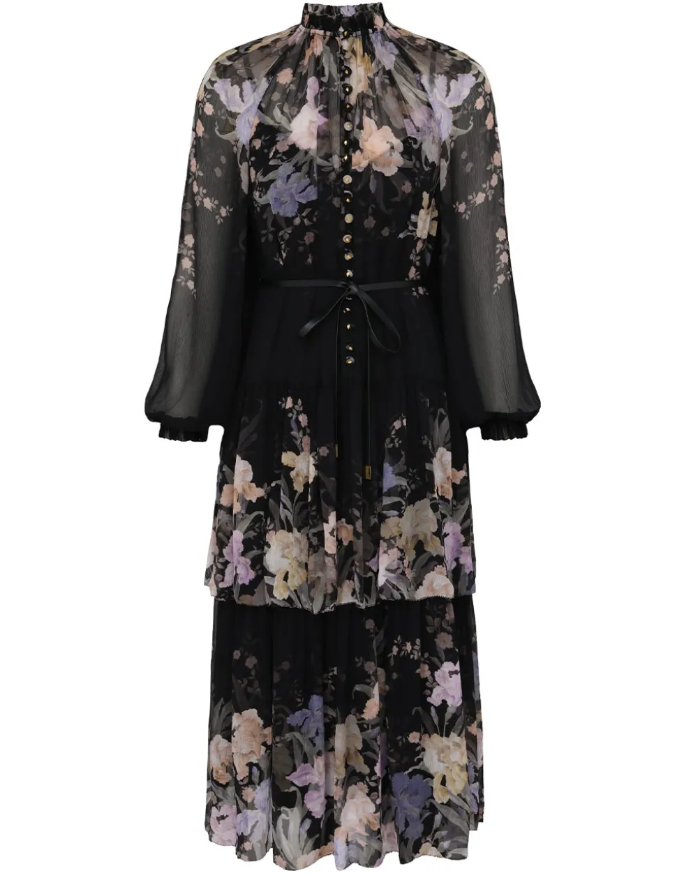 The Eden Tiered Midi Dress in Iris Sherbet from our Fall 2024 Collection, In Illustration. A tiered midi dress featuring a high neckline, elasticated blouson sleeves and a removable belt.