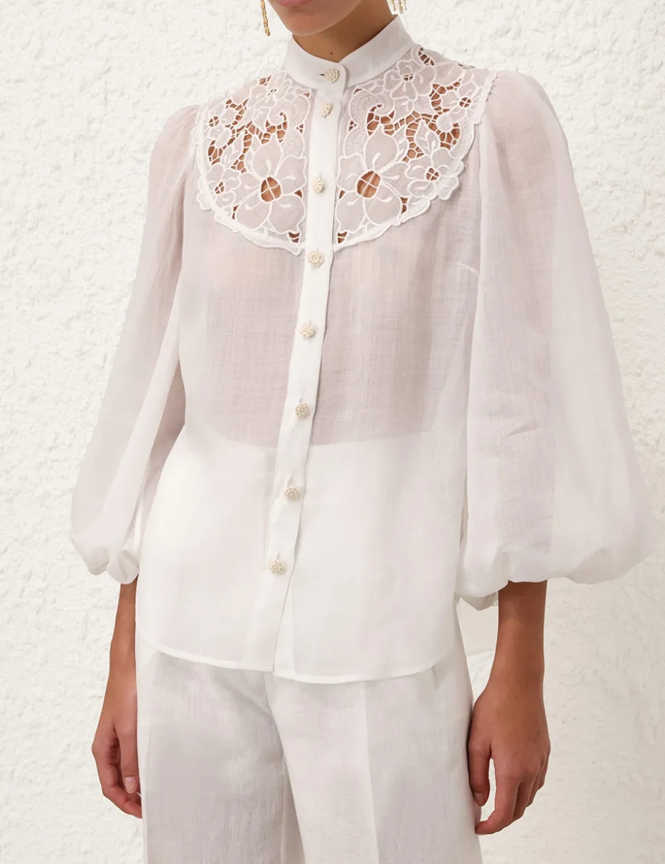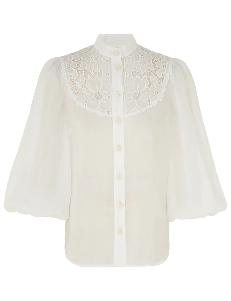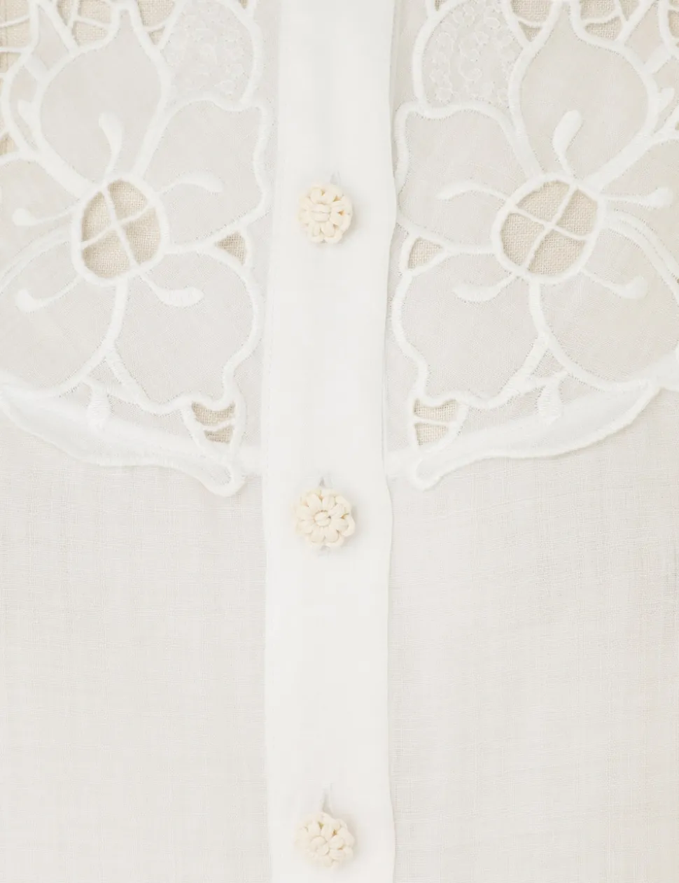 The Golden Embroidered Yoke Blouse in Ivory/Ivory from our Summer Swim 2024 Collection. A ramie long sleeve blouse featuring placement embroidery and a mandarin collar.