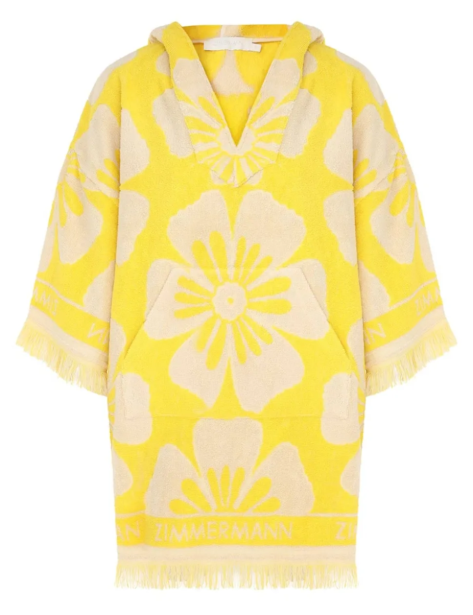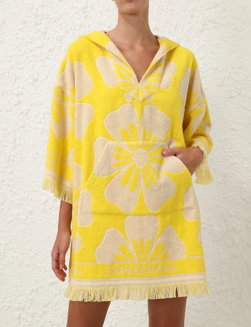 The Golden Hooded Towel Mini Dress in Yellow/Ivory from our Summer Swim 2024 Collection. A terry towelling mini dress featuring a deep V-neckline, a hood and a kangaroo pouch pocket.
