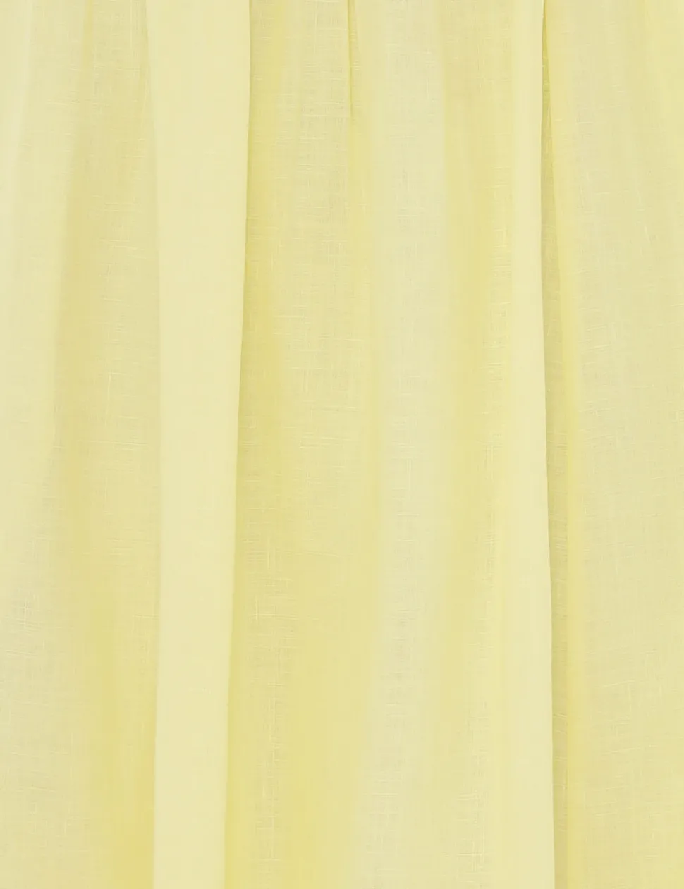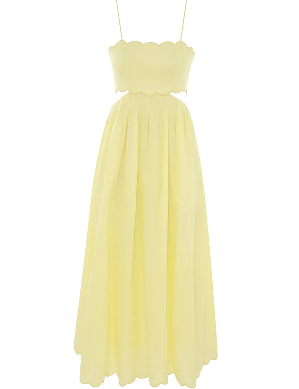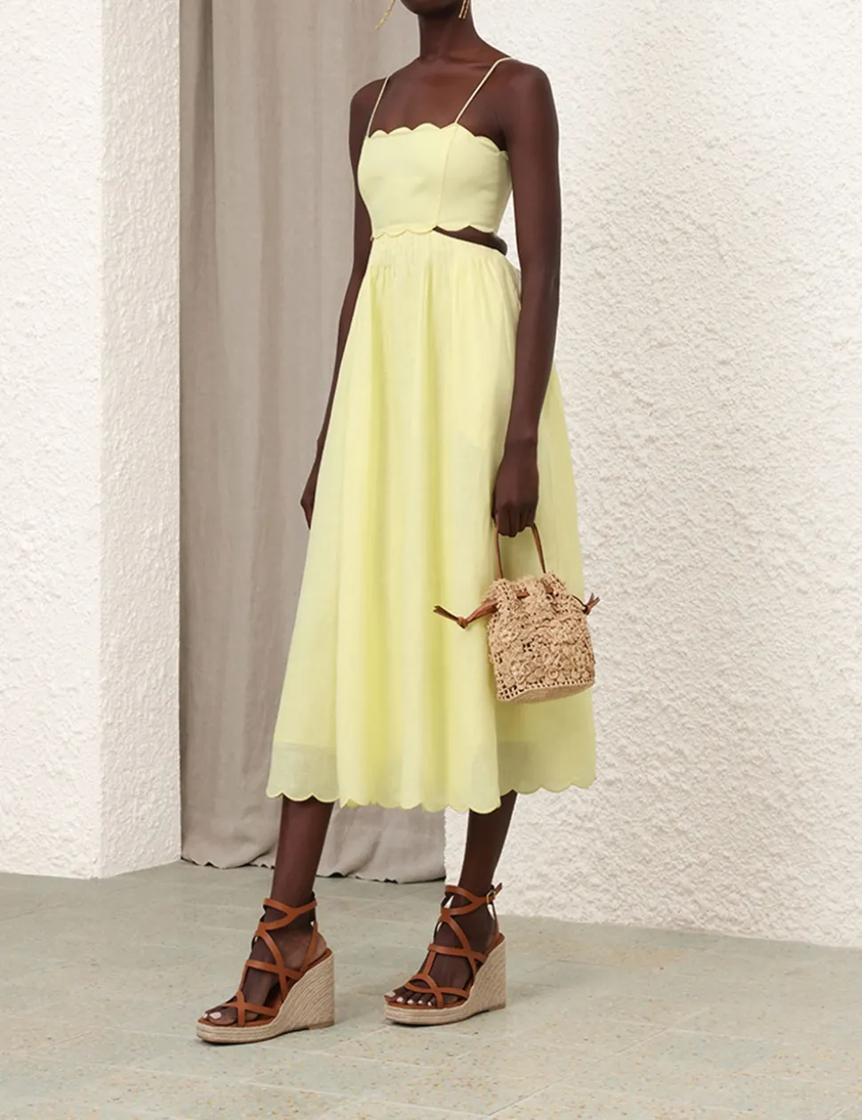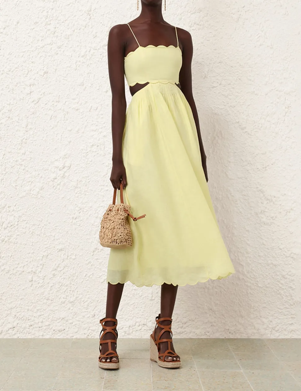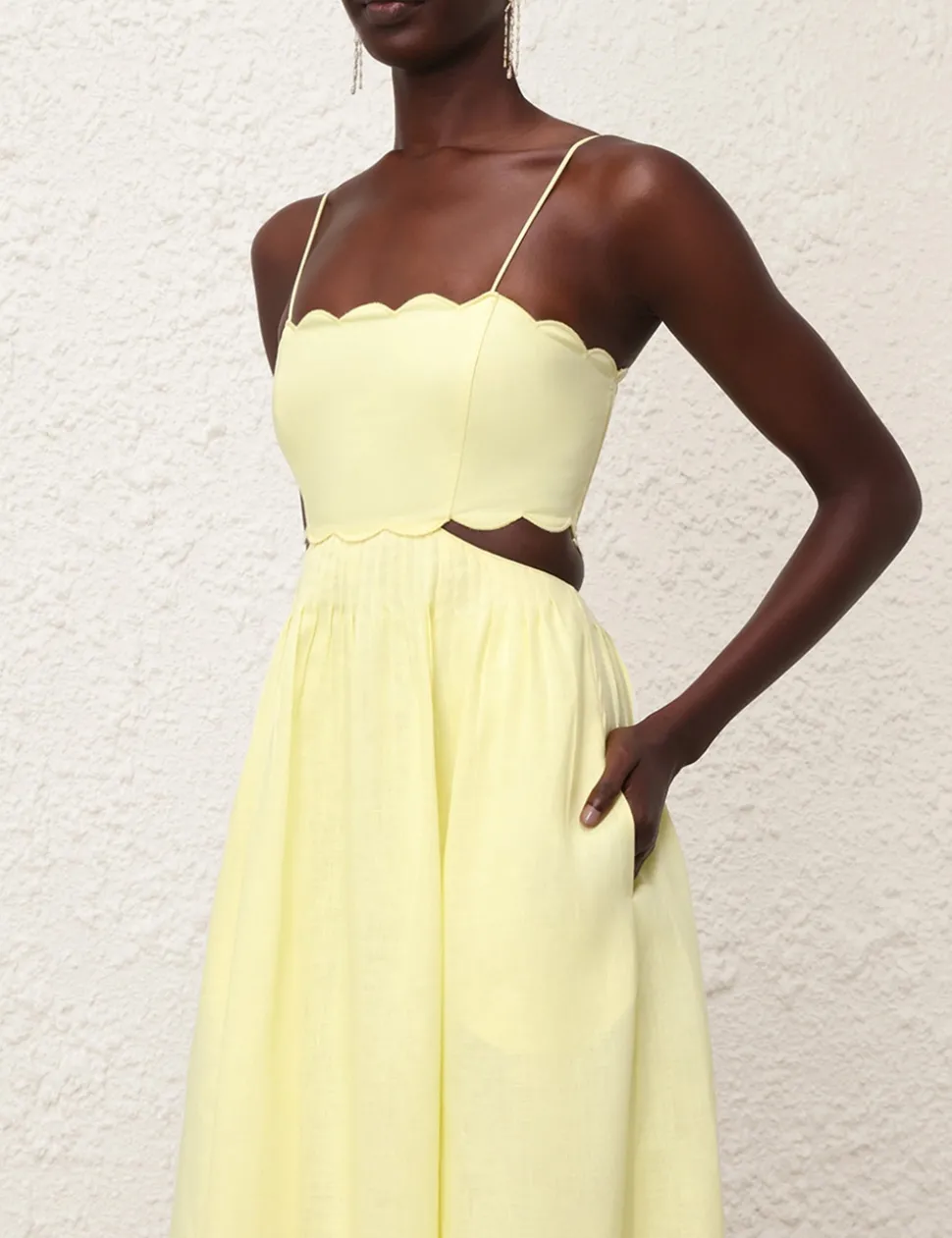 The Halliday Scallop Midi Dress in Yellow from our Summer Swim 2024 Collection. A linen midi dress featuring waist cut outs, side seam pockets and lace up back bodice, finished with embroidered scalloped edging throughout.