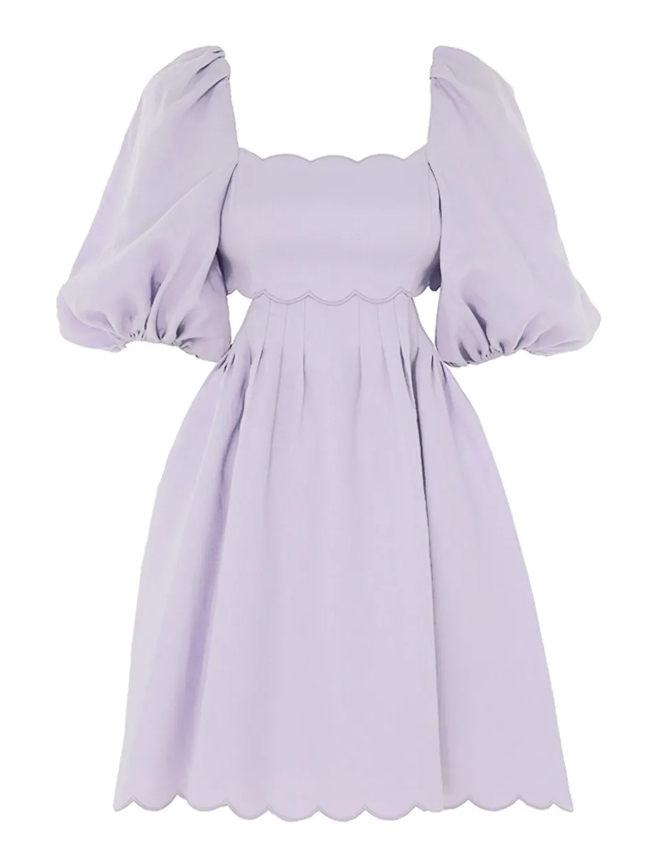 The Halliday Scallop Mini Dress in Lilac from our Summer Swim 2024 Collection. A linen mini dress featuring an off the shoulder silhouette with blouson sleeves and bonding at the side seam.