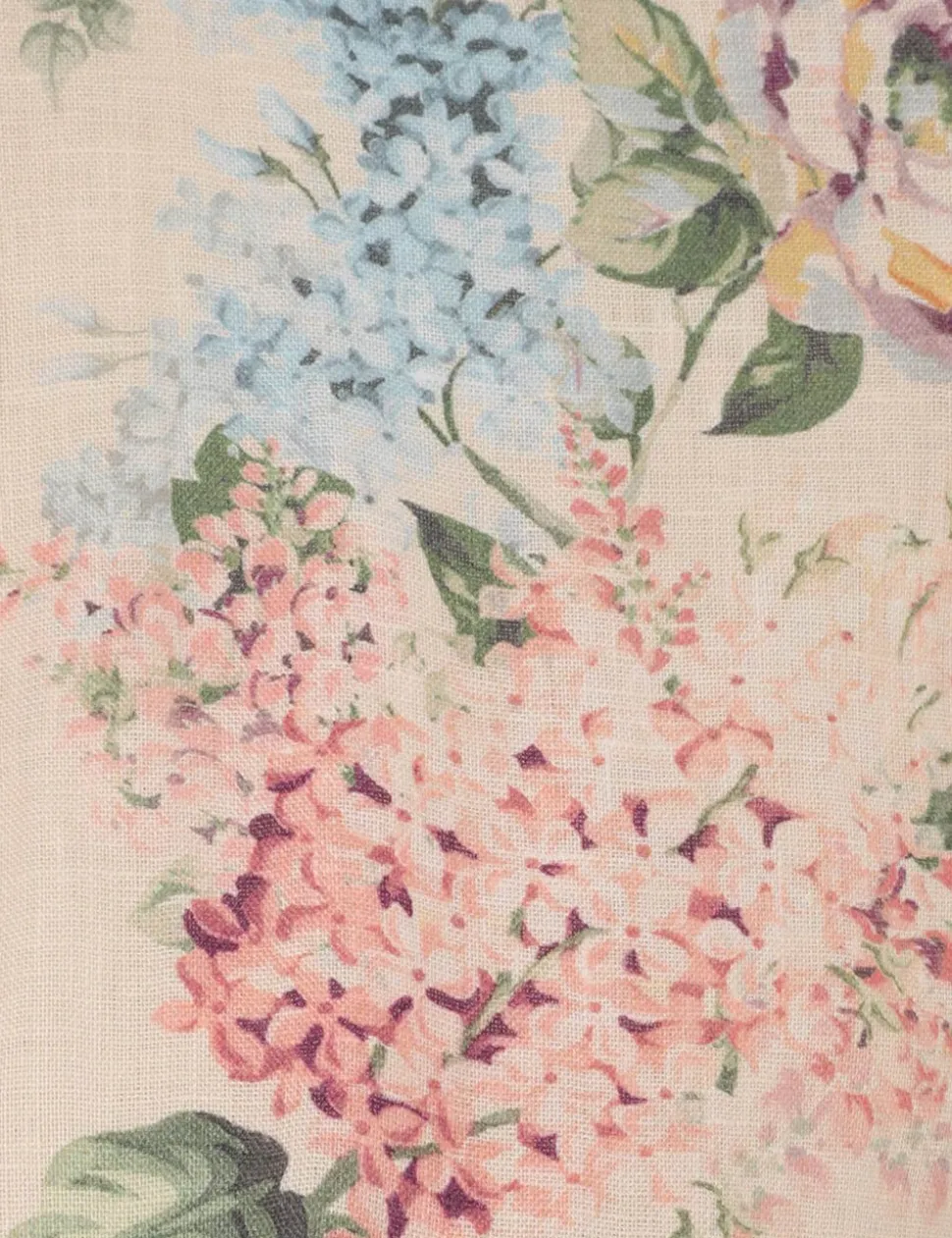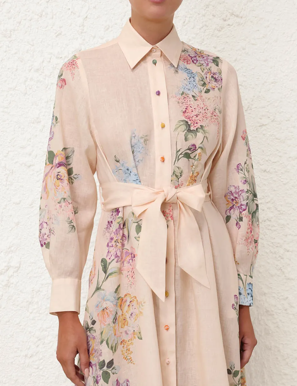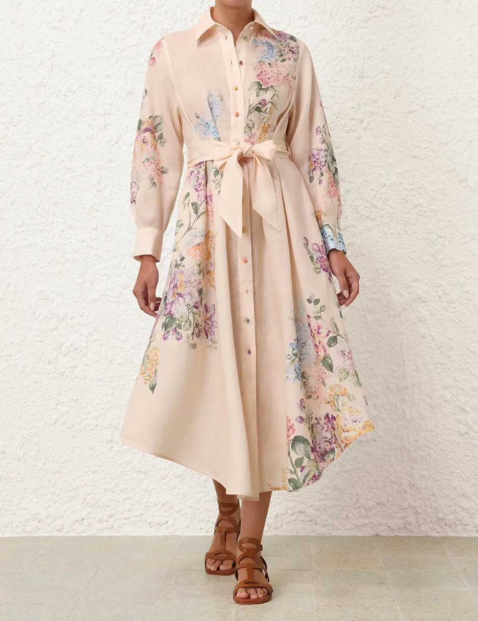 The Halliday Tucked Shirt Dress in Cream Watercolour Floral from our Summer Swim 2024 Collection. A linen midi dress featuring placement artwork and a self tie belt.
