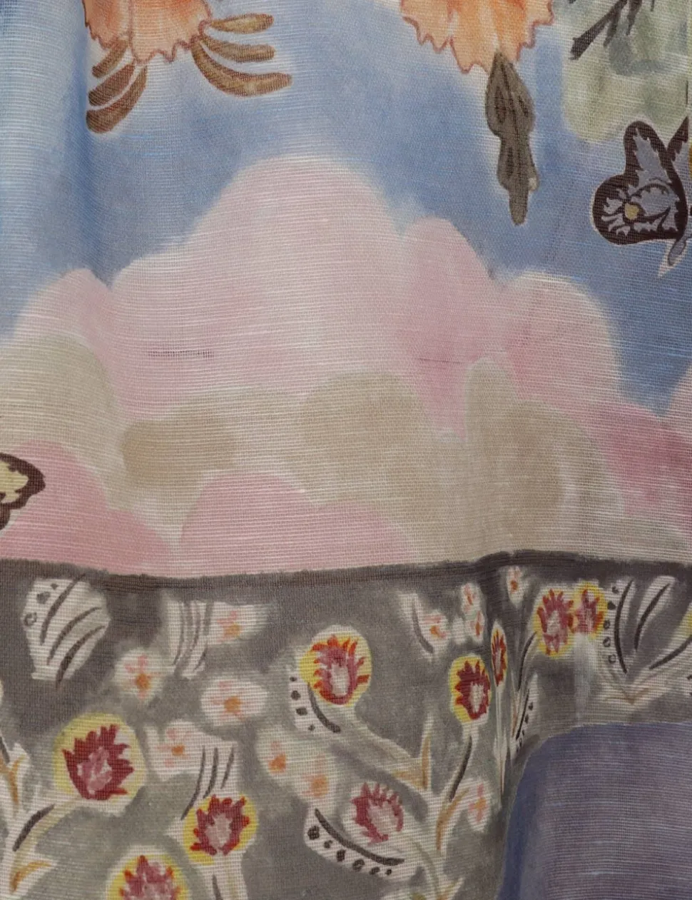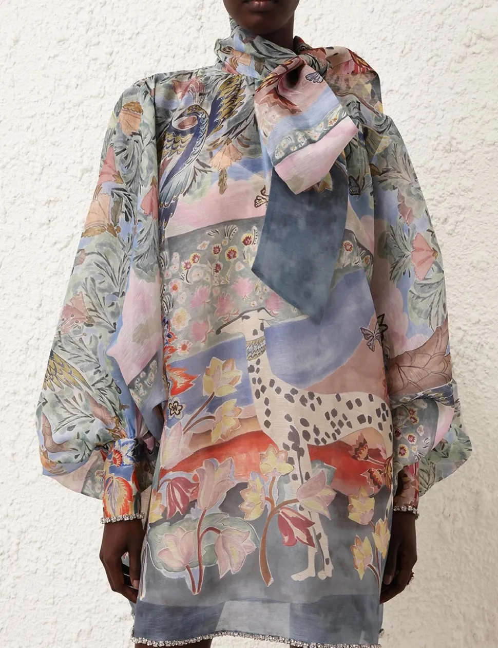 The Illustration Billow Shift in Eden Garden from our Fall 2024 Collection, In Illustration. A silk linen mini dress featuring a crystal trim detailing, gathered front and back neckline with a self tie neck tie.