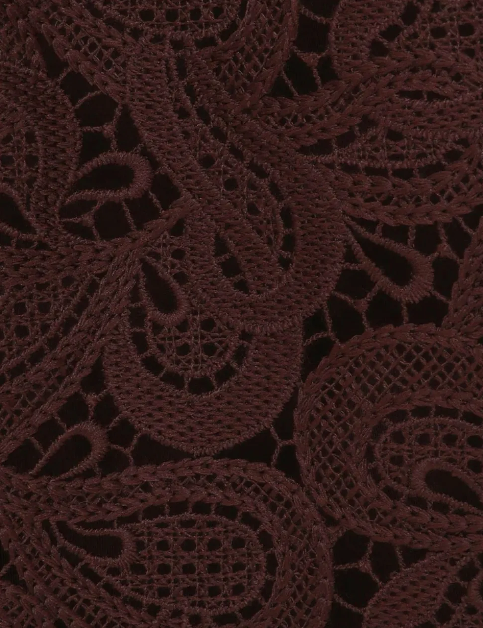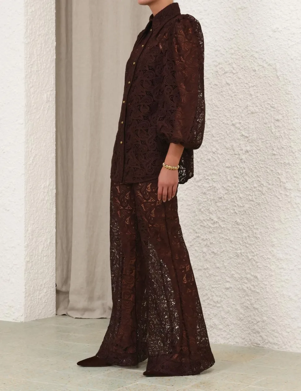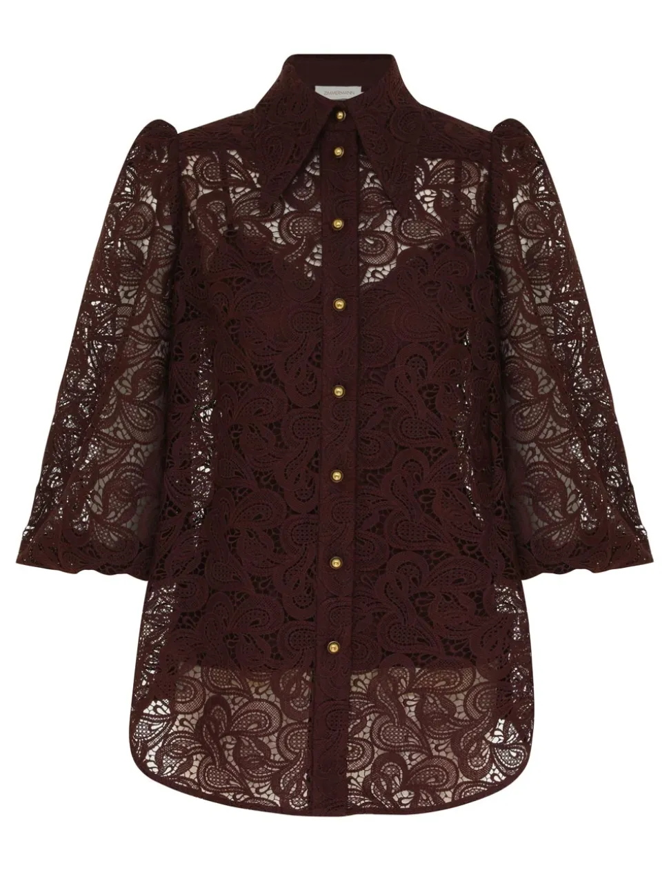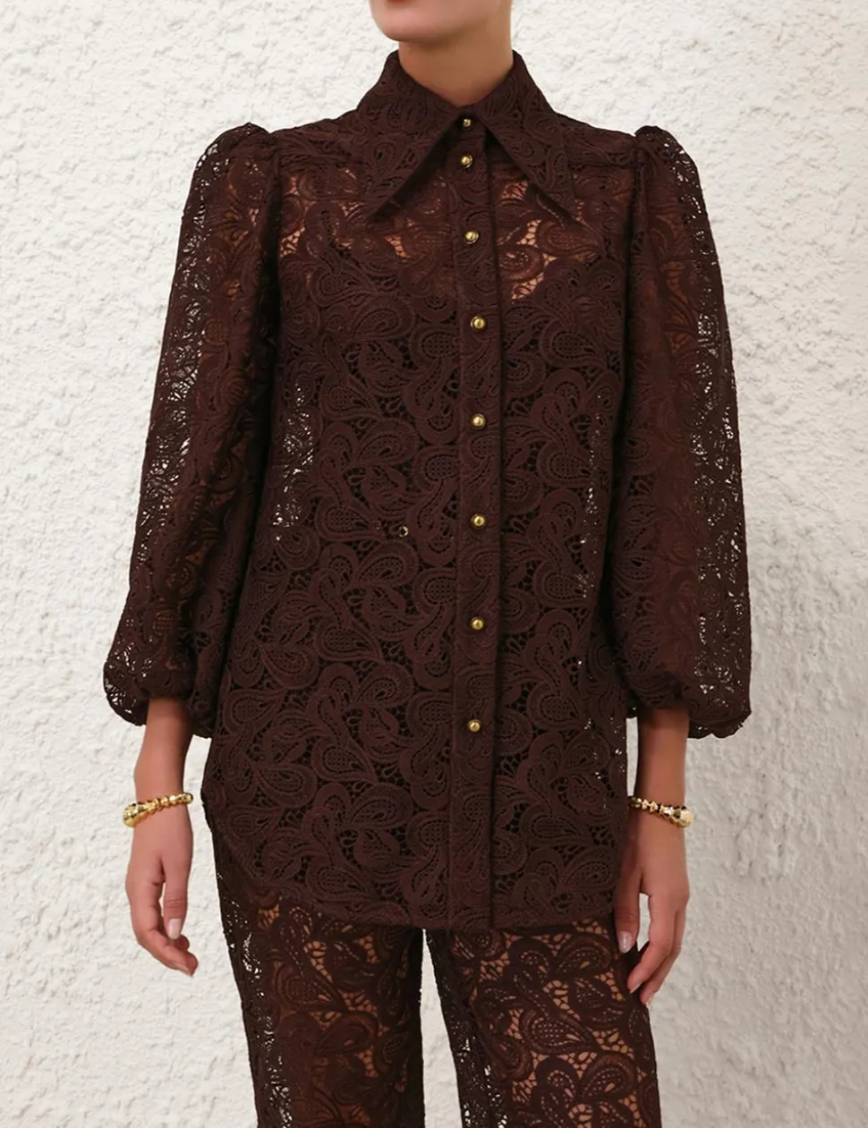 The Illustration Lace Blouse in Chocolate from our Fall 2024 Collection, In Illustration. A relaxed blouse featuring lace detailing throughout with long sleeves and buttons down the centre front.