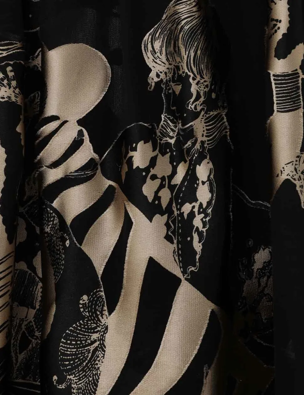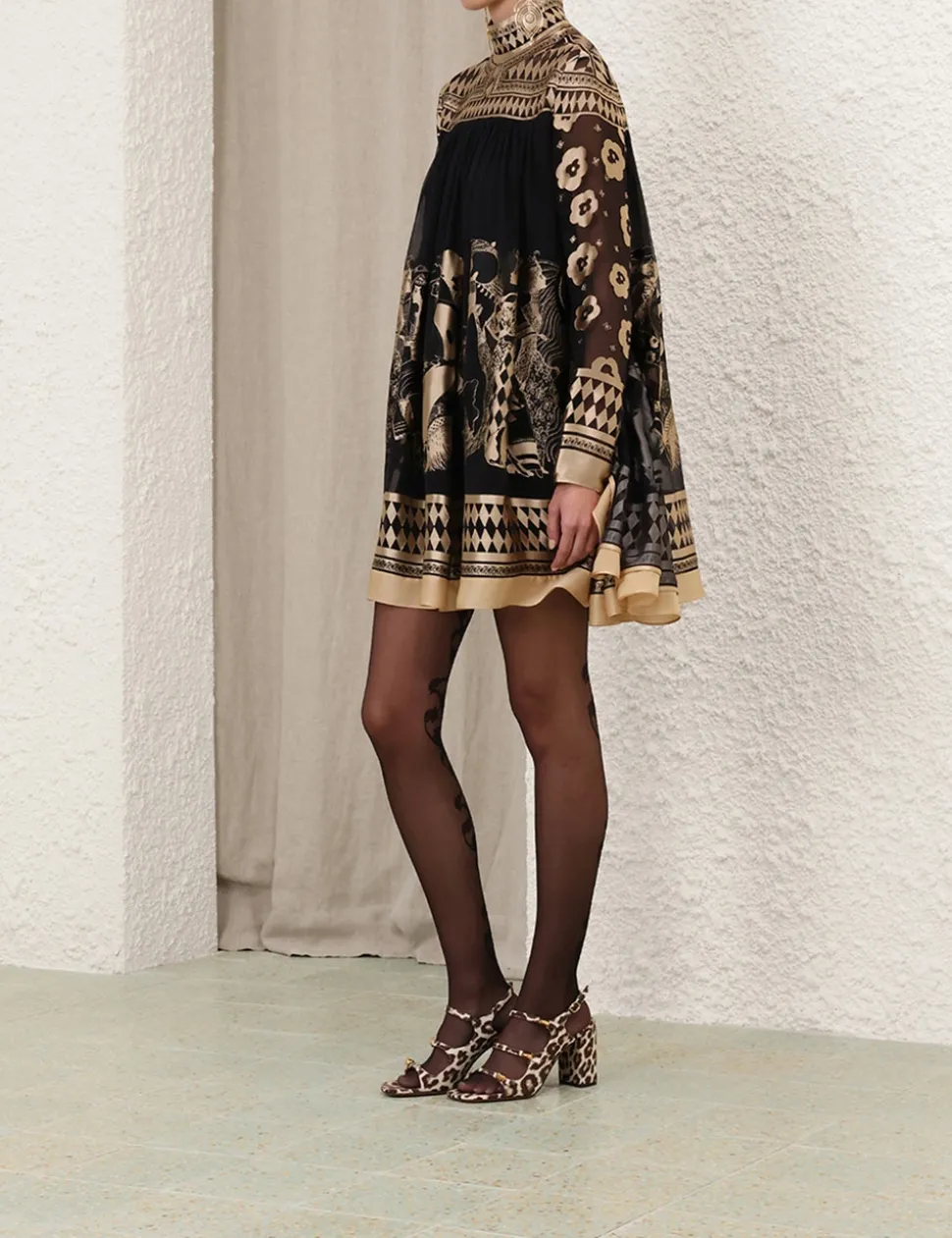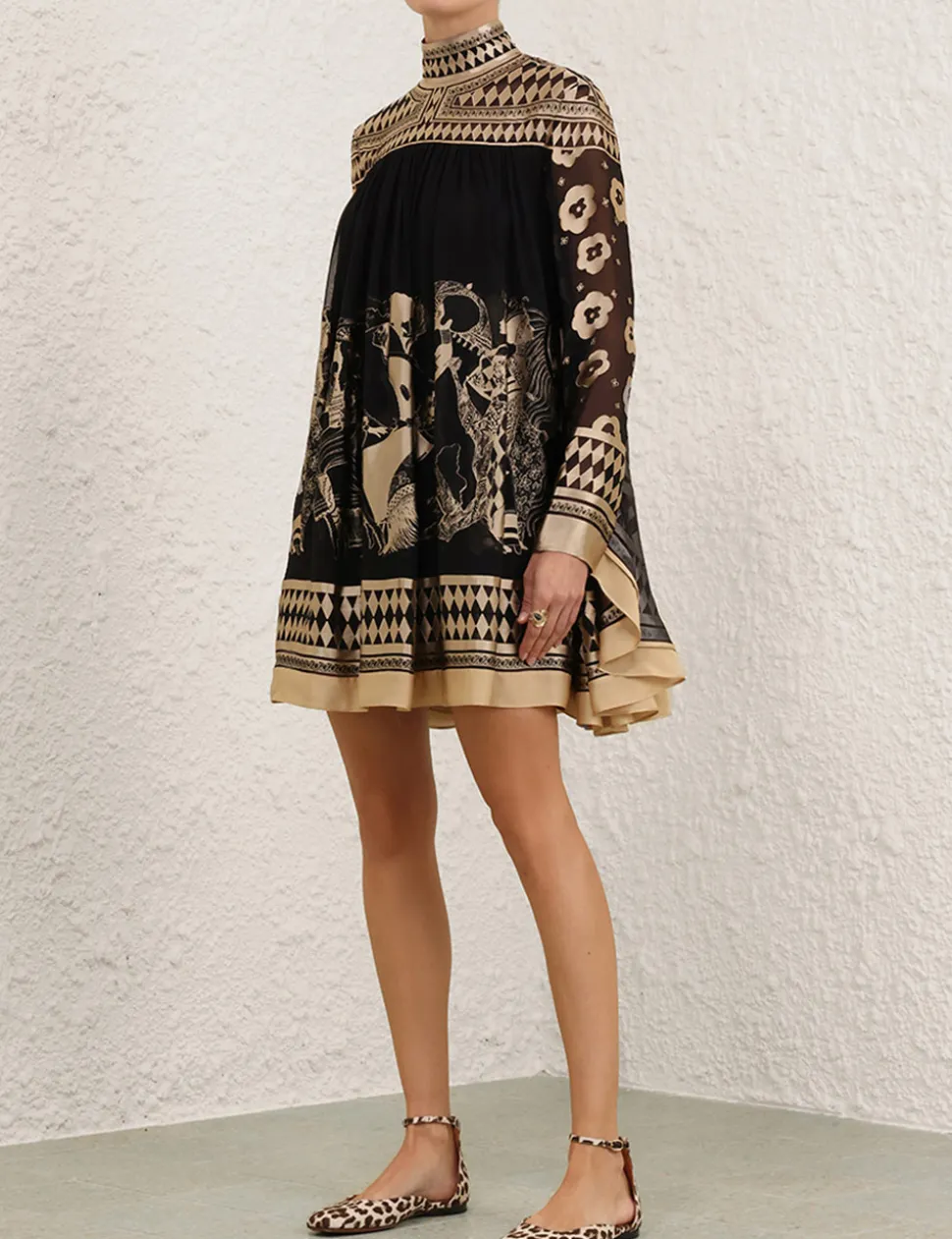 The Illustration Otto Mini Dress in Black/Tea from our Fall 2024 Collection, In Illustration. A mini dress featuring long batwing sleeves, rouleau waist tie with toggle ends and an invisible centre back zip closure.