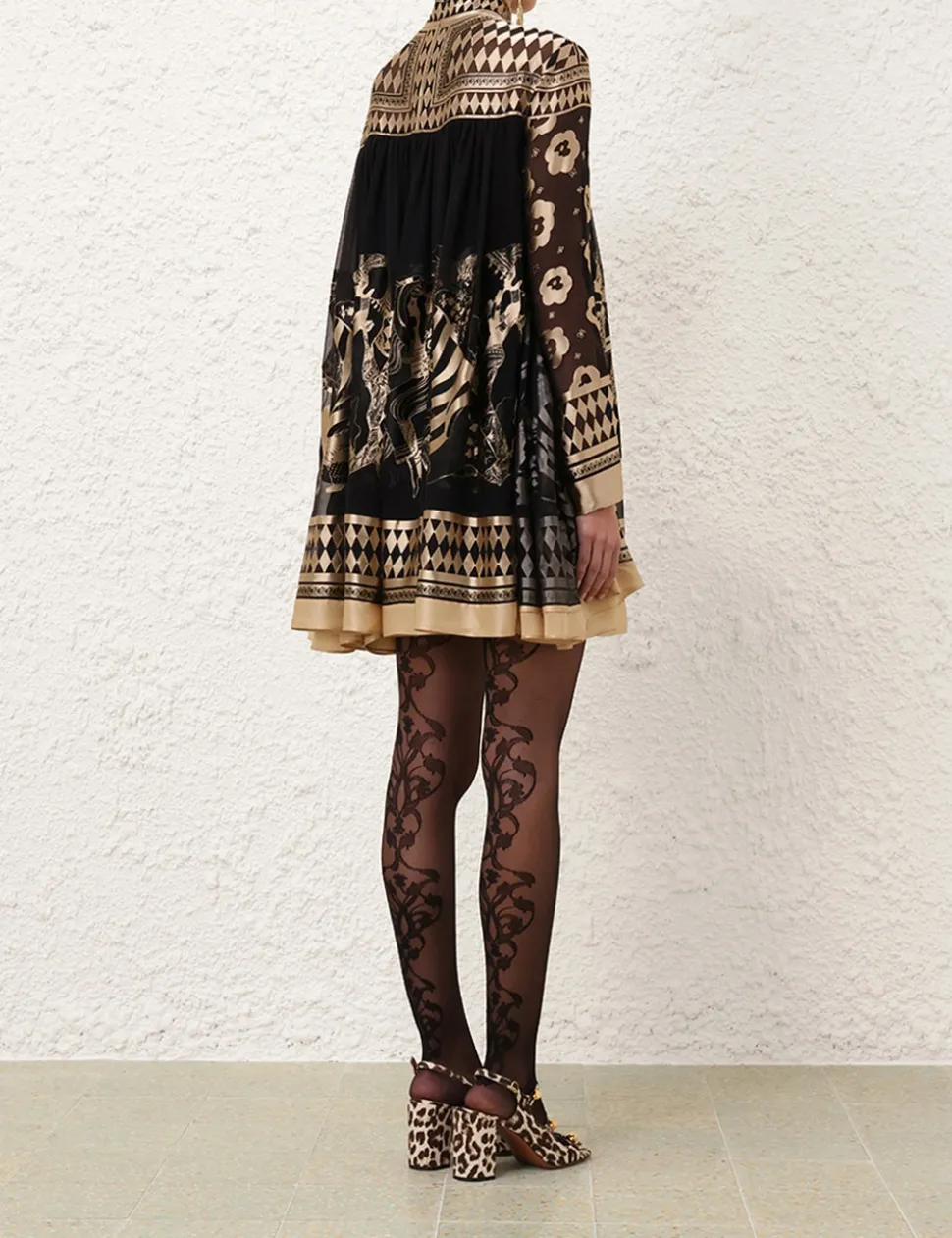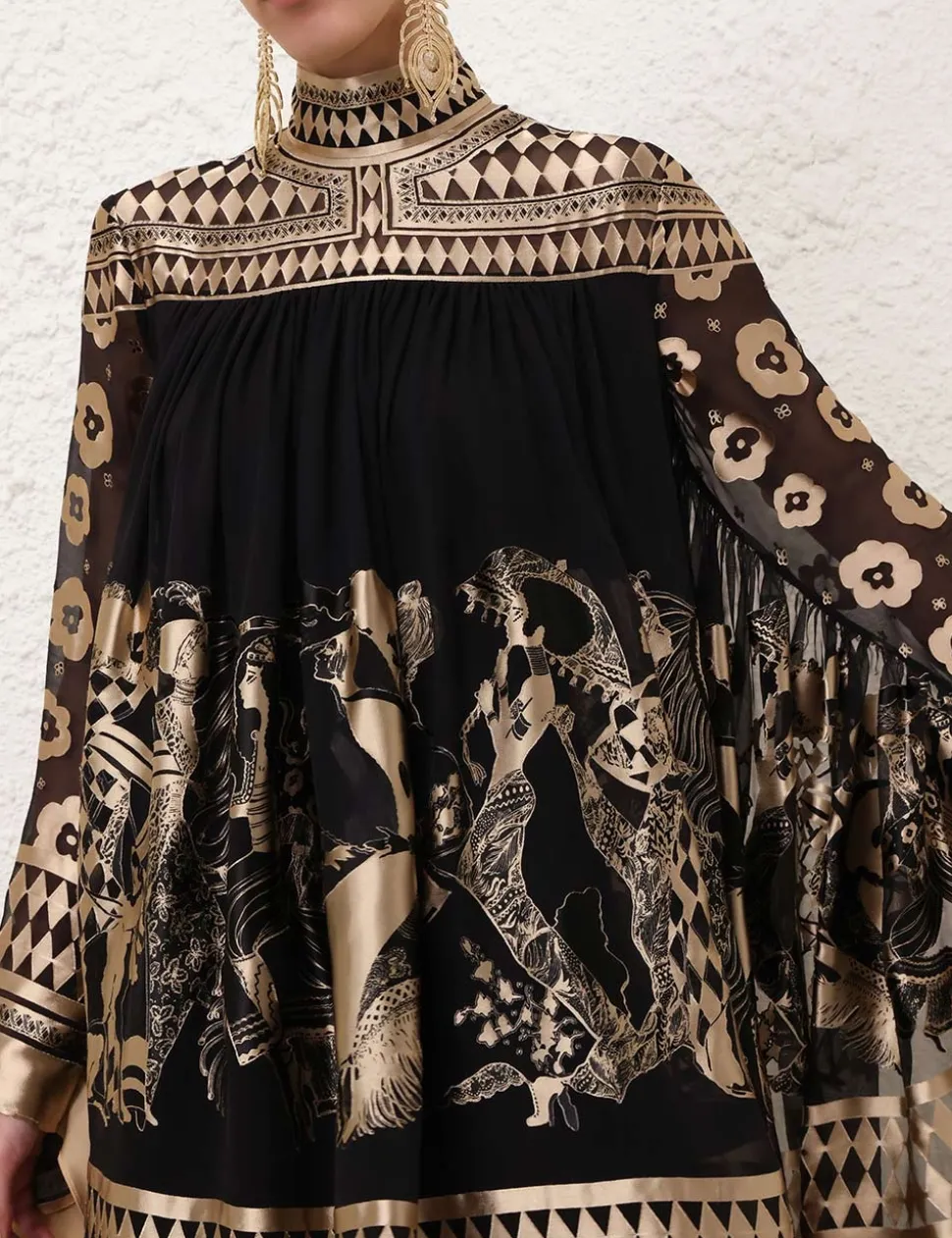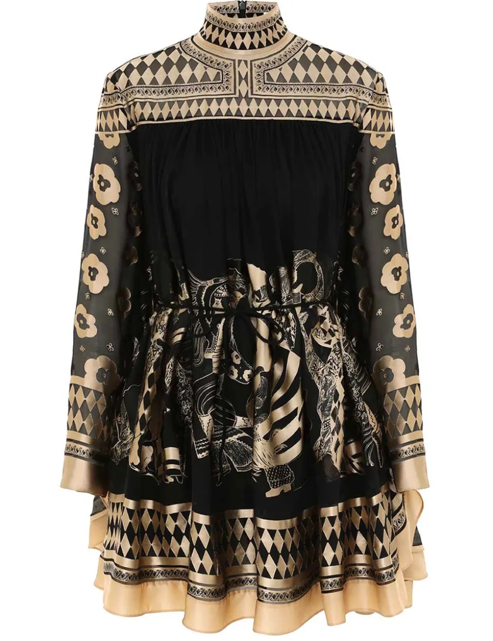 The Illustration Otto Mini Dress in Black/Tea from our Fall 2024 Collection, In Illustration. A mini dress featuring long batwing sleeves, rouleau waist tie with toggle ends and an invisible centre back zip closure.