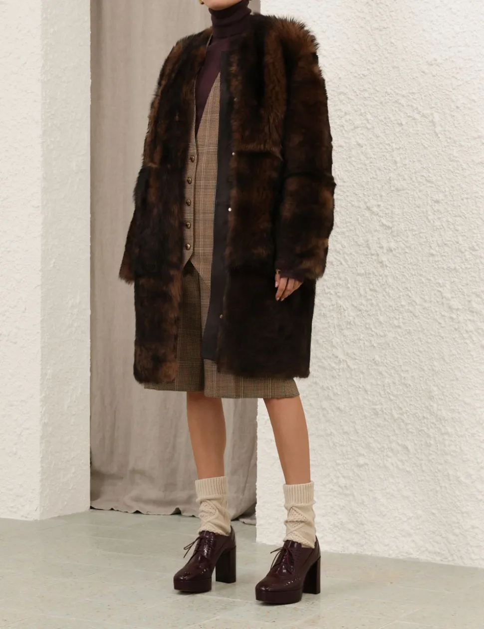 The Illustration Shearling Coat in Chocolate from our Fall 2024 Collection, In Illustration. A shearling fur coat featuring invisible snap closures at the front opening and front pockets.
