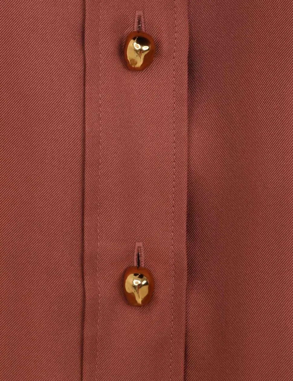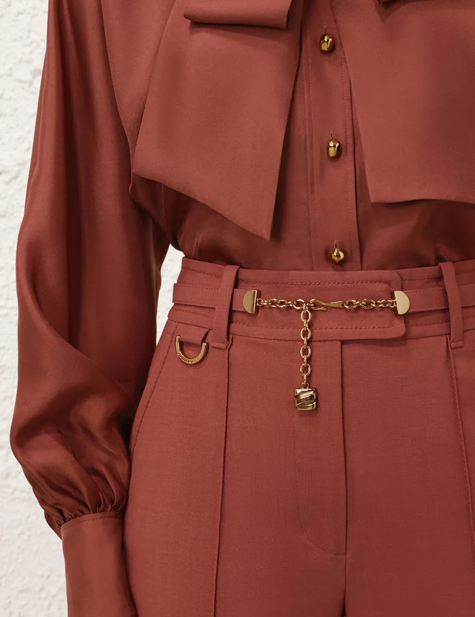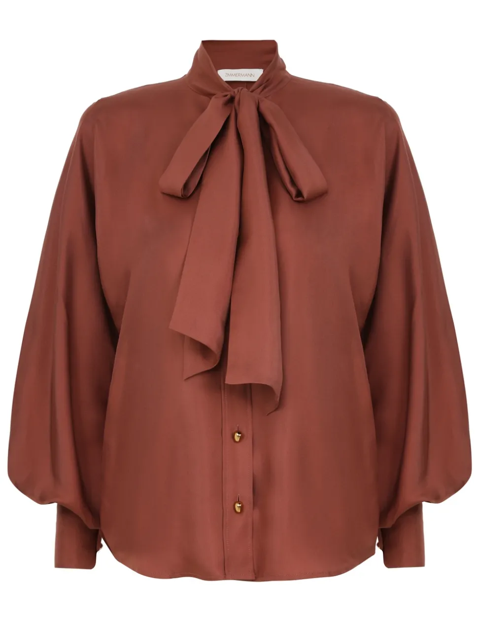 The Illustration Tie Neck Blouse in Lipstick from our Fall 2024 Collection, In Illustration. A silk long sleeve blouse featuring a statement neck tie and buttons down the centre front.