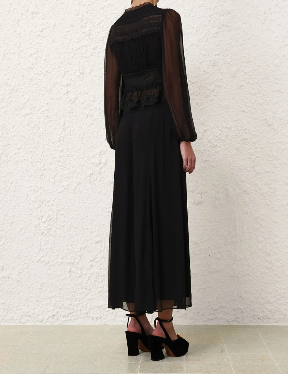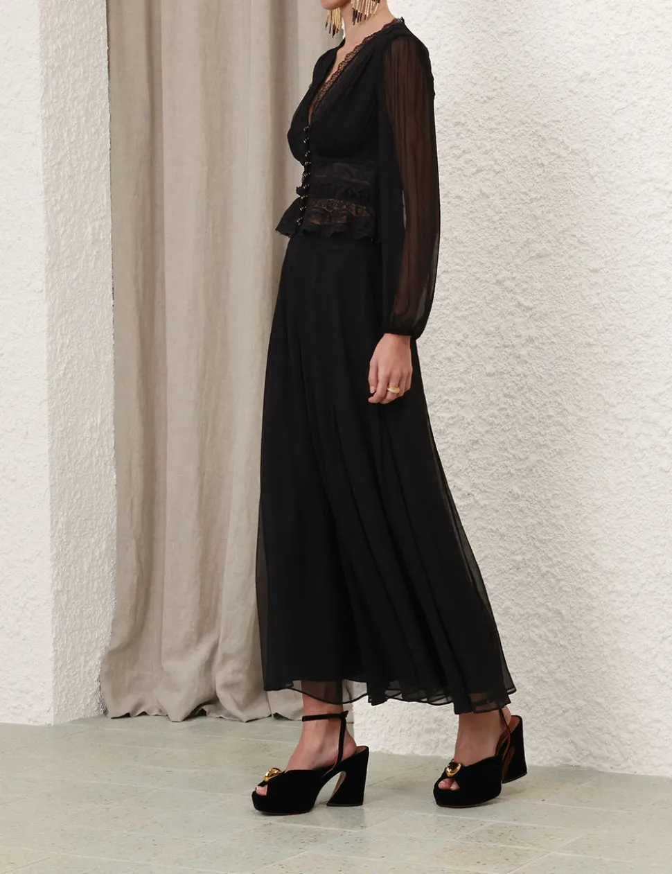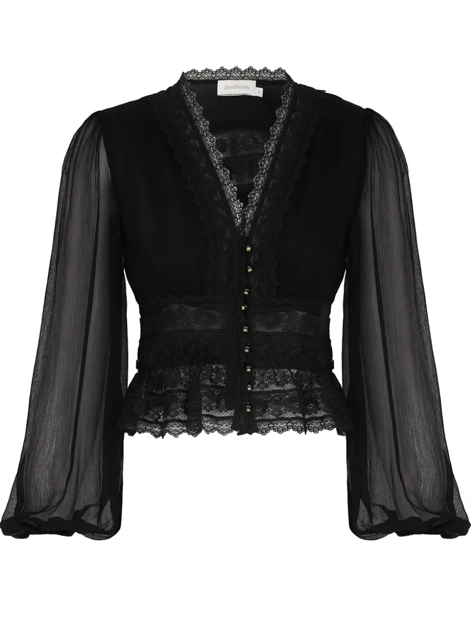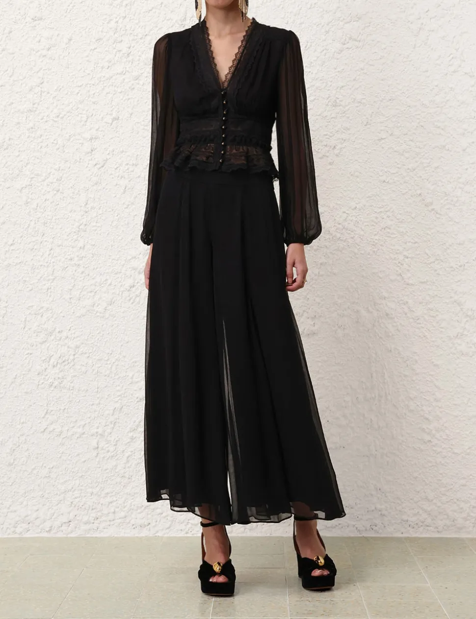 The Illustration V Neck Blouse in Black from our Fall 2024 Collection, In Illustration. A long sleeve blouse featuring a plunging V-neckline, frills around the waist and blouson sleeves with elasticated cuffs.