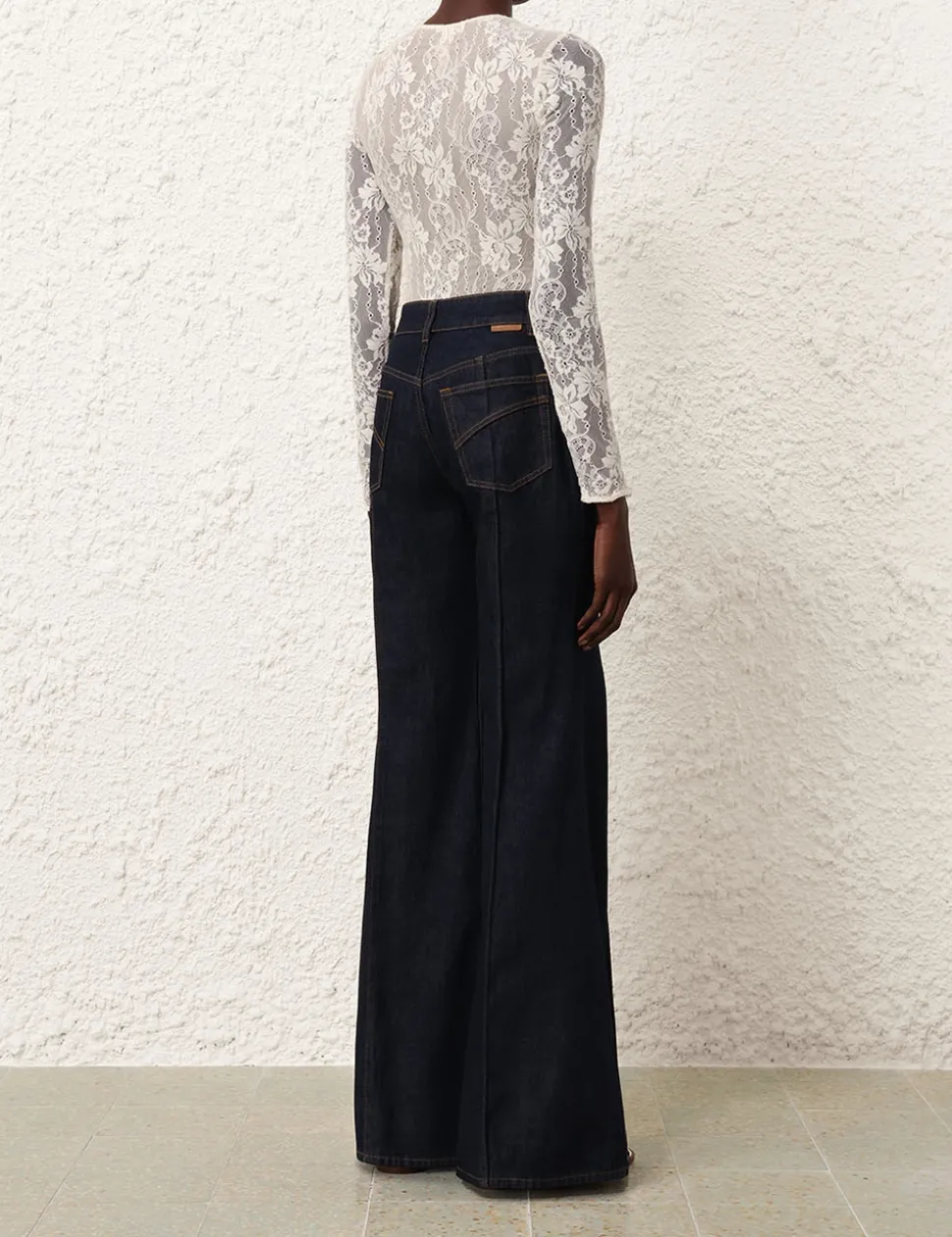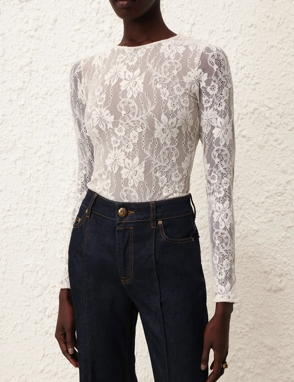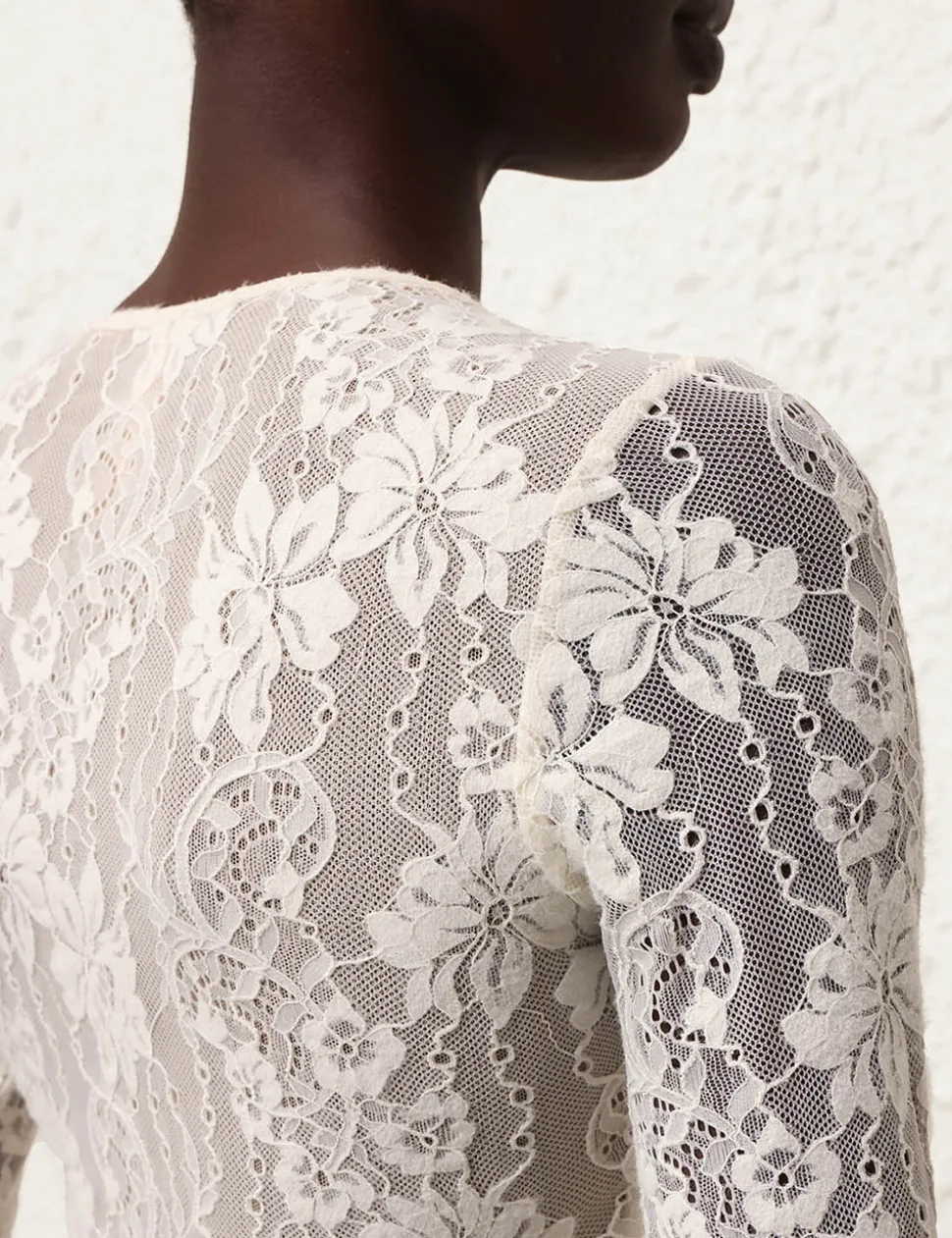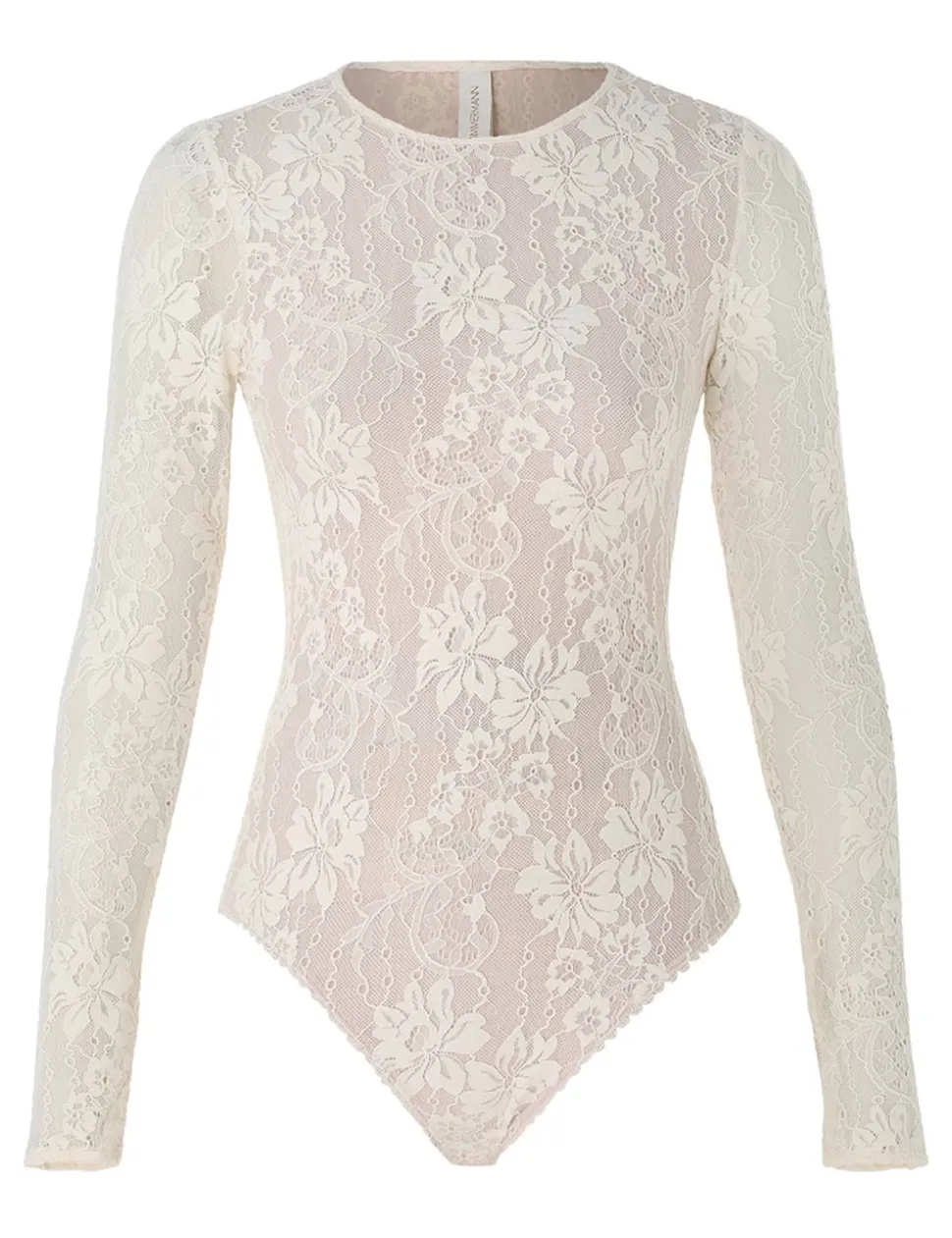 The Lace Bodysuit in Cream from our Fall 2024 Collection, In Illustration. A lace bodysuit featuring a crew neck and long sleeves.