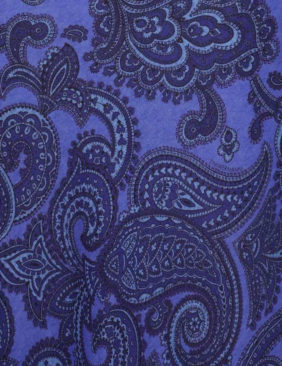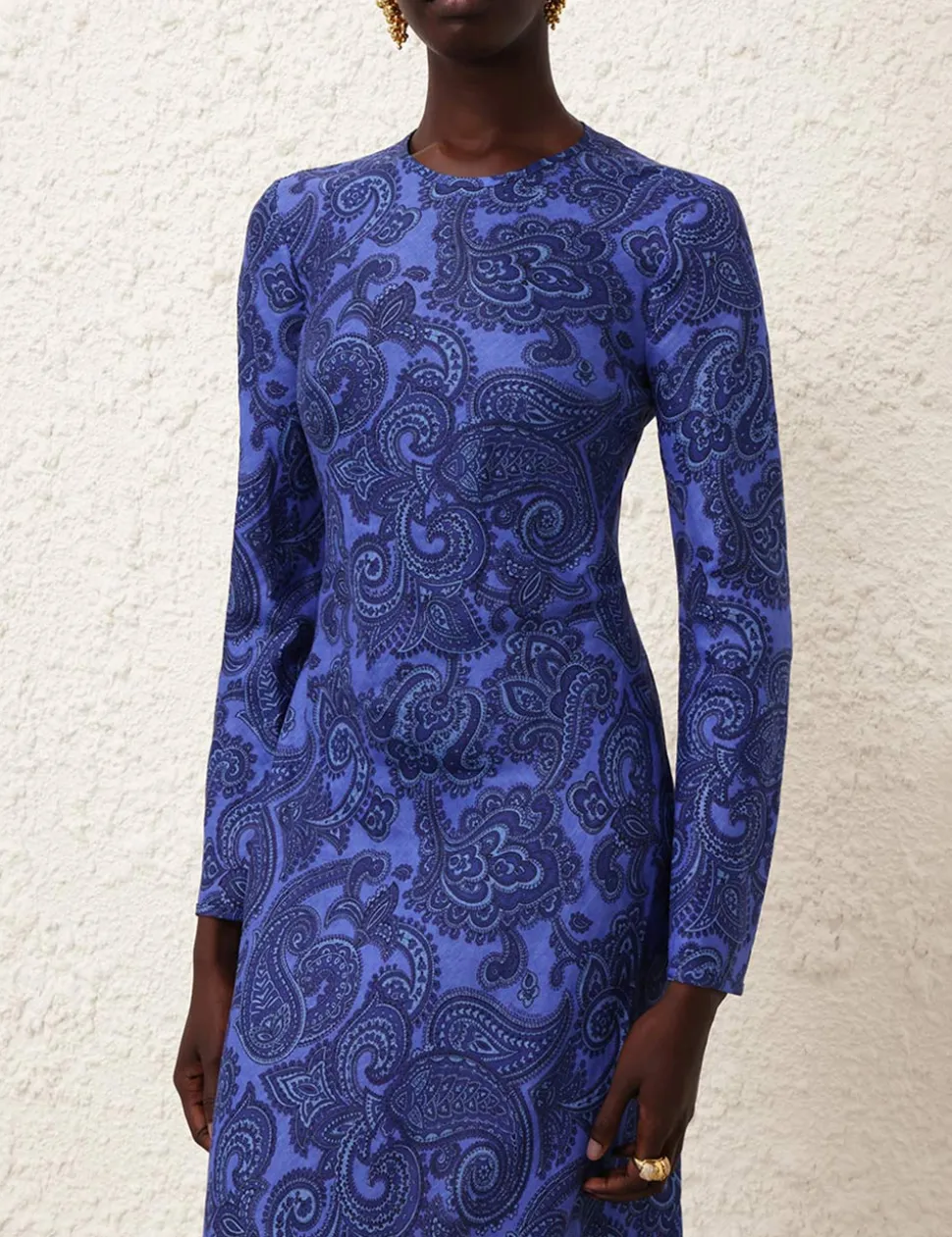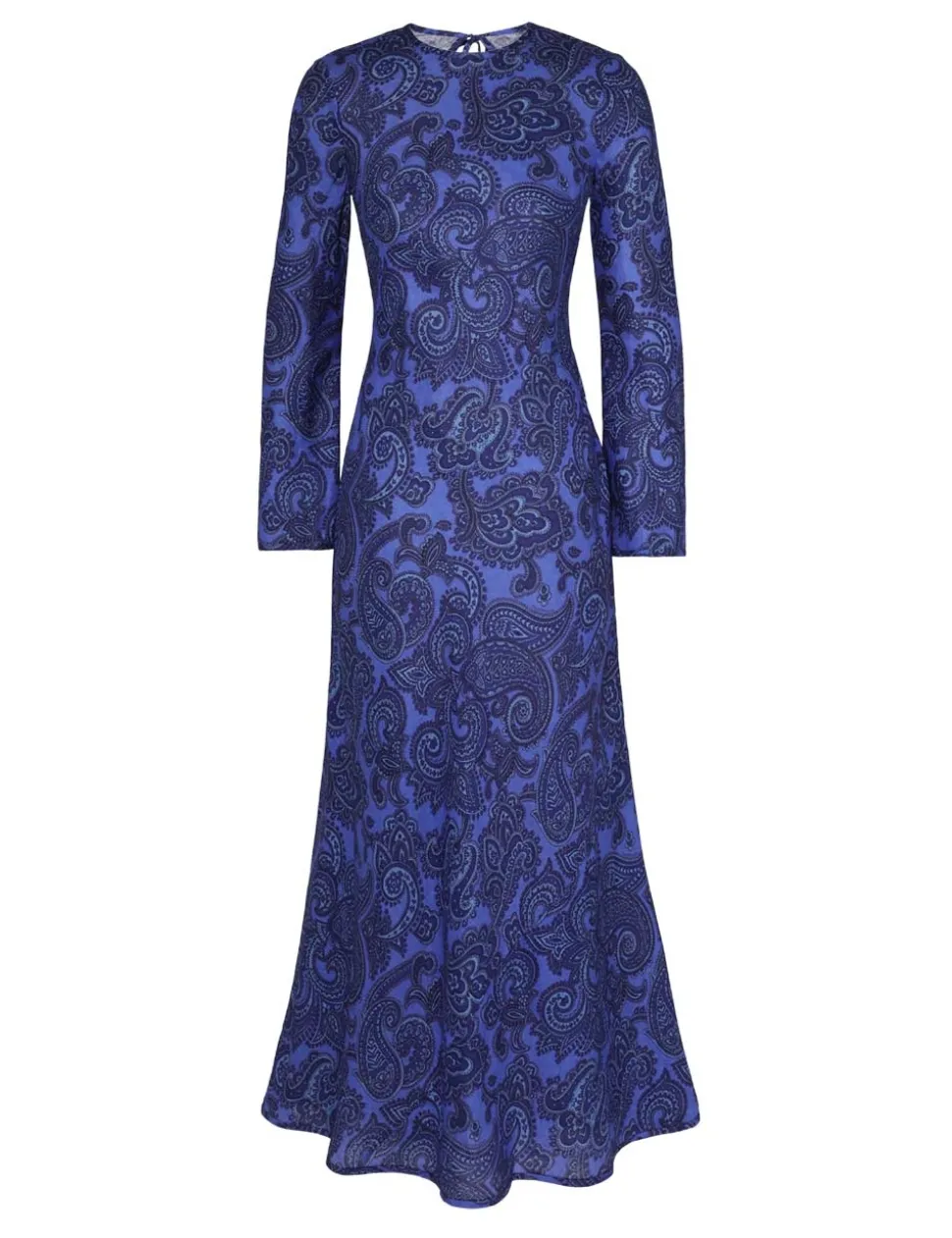 The Ottie Bias Backless Dress in Blue Paisley from our Summer Swim 2024 Collection. A linen long sleeve dress featuring an open back detail.