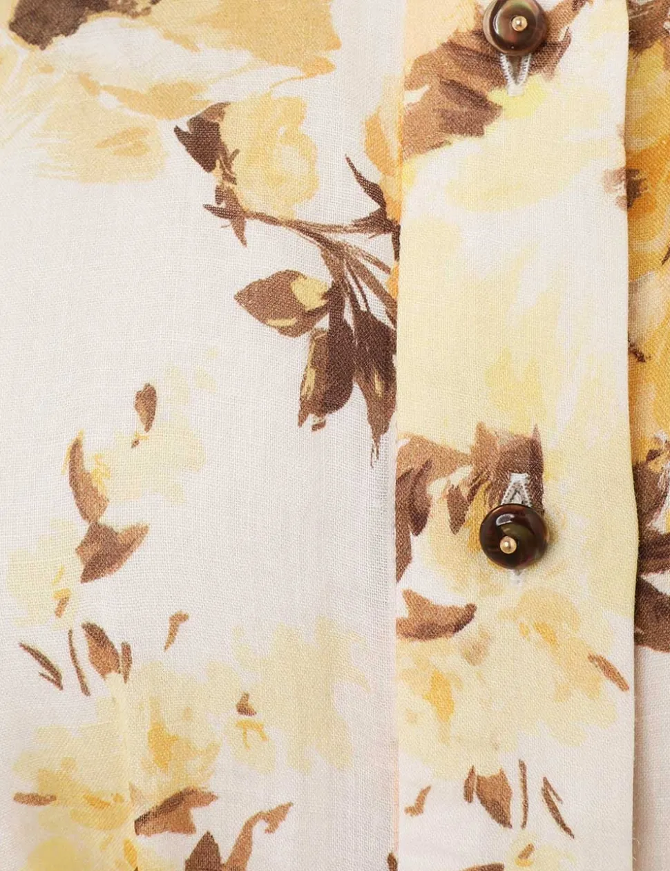The Ottie Tuck Shirt Dress in Orange Floral from our Summer Swim 2024 Collection. A long sleeve ramie midi dress featuring a contrast stitch leather belt, finished with buttons down the centre front.