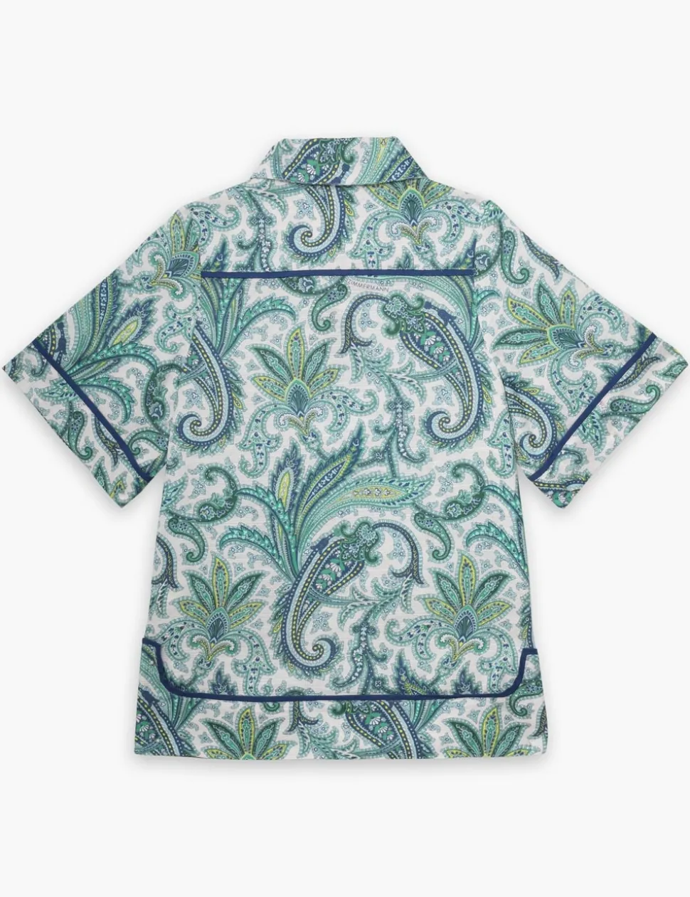 The Ottie Tunic Dress in Green Paisley from our Summer Swim 2024 Collection. A printed kids dress featuring a buttoned down collar and a contrast bind.