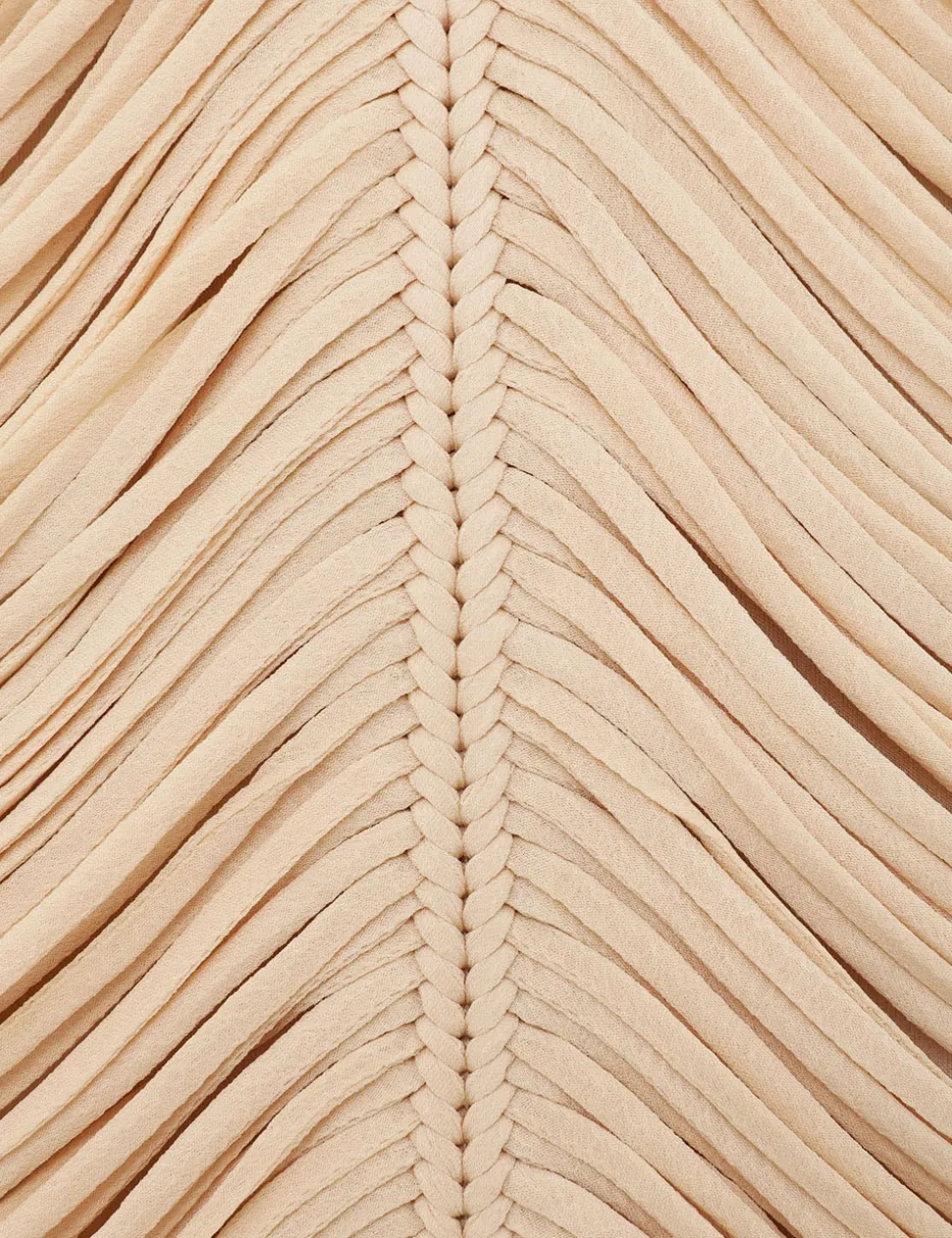 The Pavilion Rouleaux Midi Dress in Cream from our Fall 2024 Collection, In Illustration. A midi dress featuring a crew neckline, long sleeves and draped knotted rouleaux trim throughout.