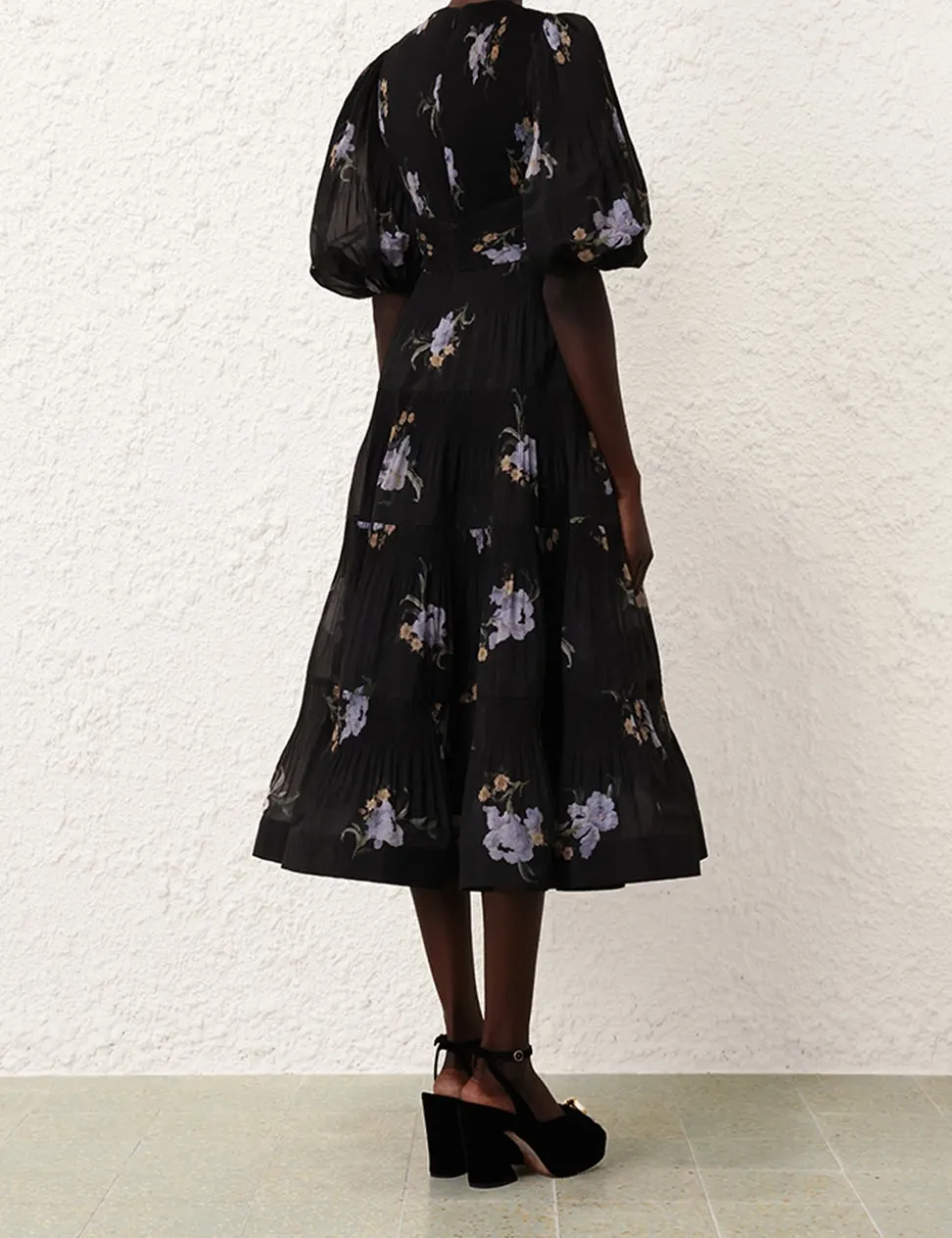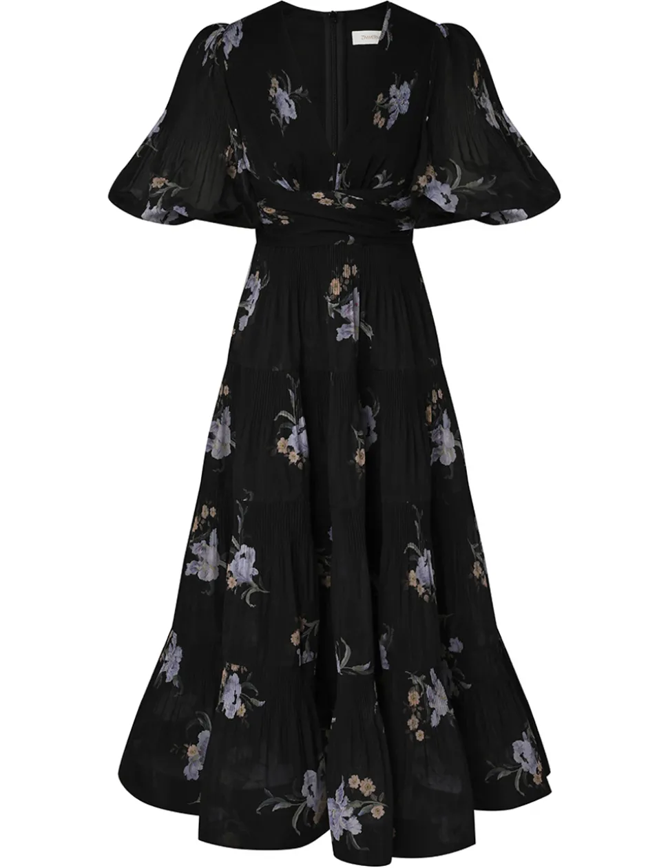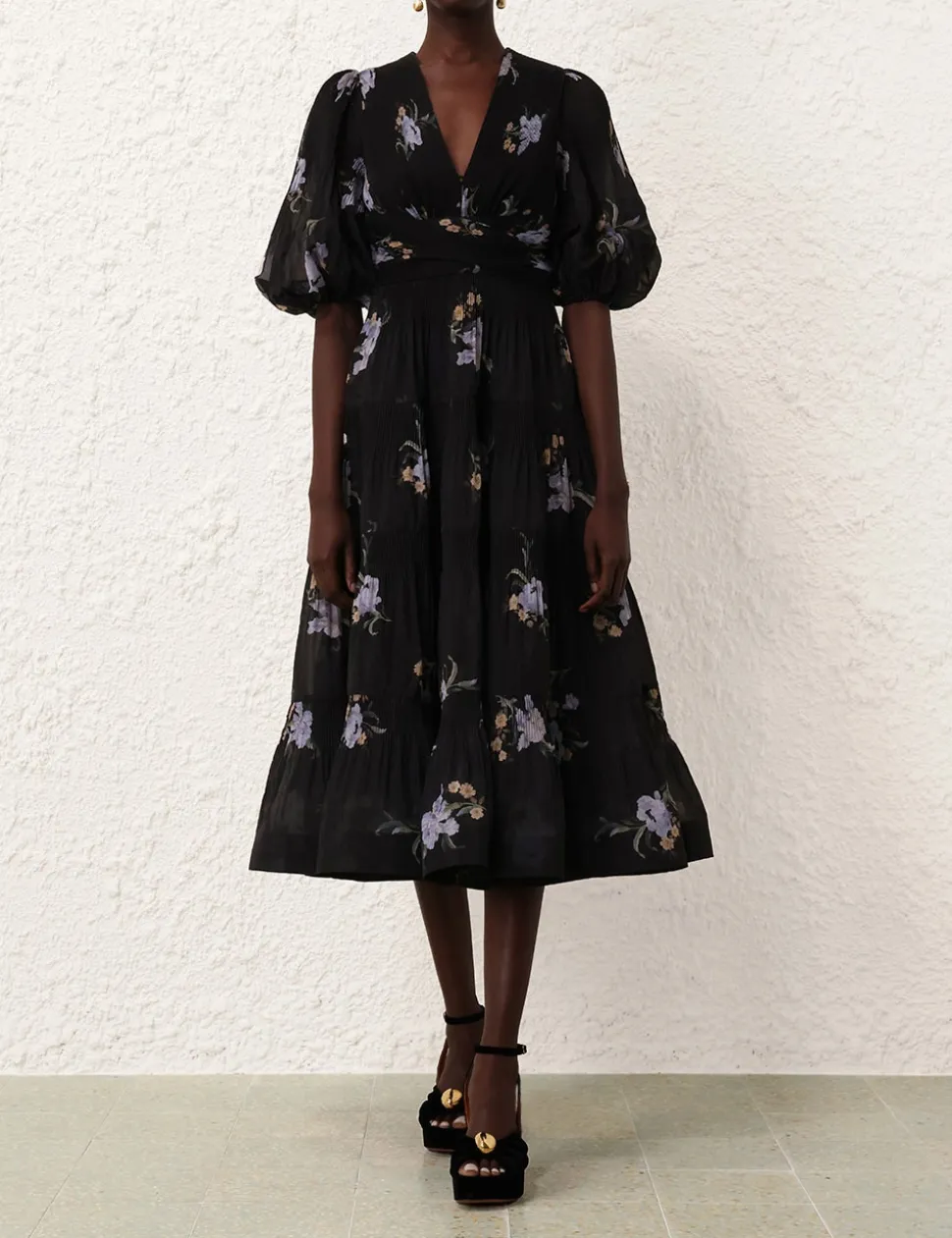 The Pleated Midi Dress in Black Iris Floral from our Fall 2024 Collection, In Illustration. A midi dress featuring a plunging V-neckline, short blouson sleeves and a gathered under bust.