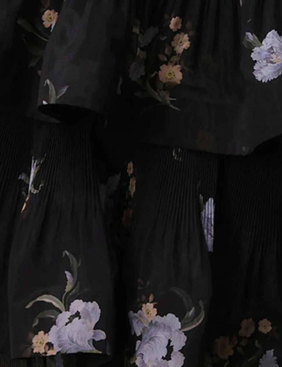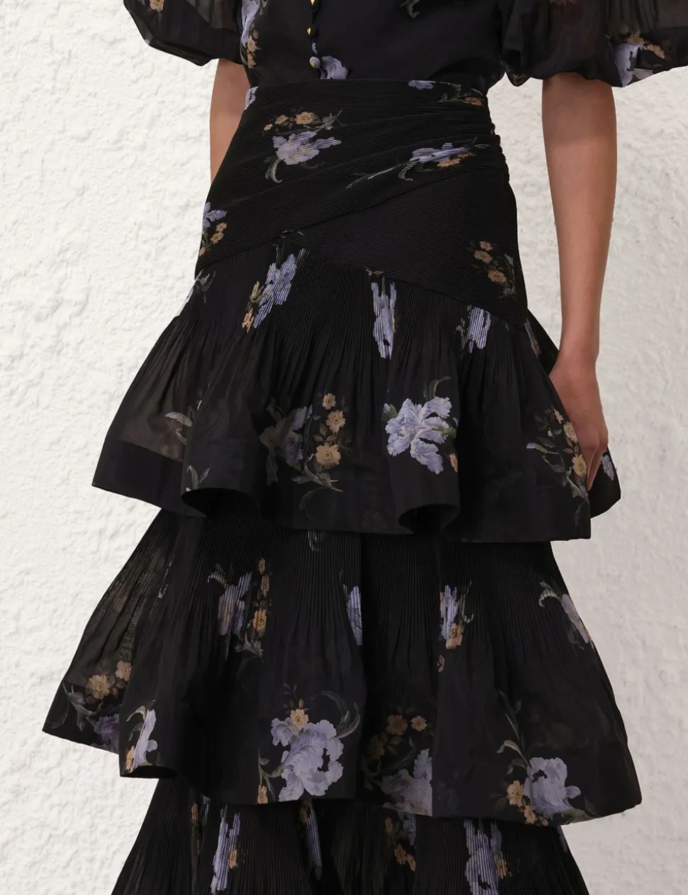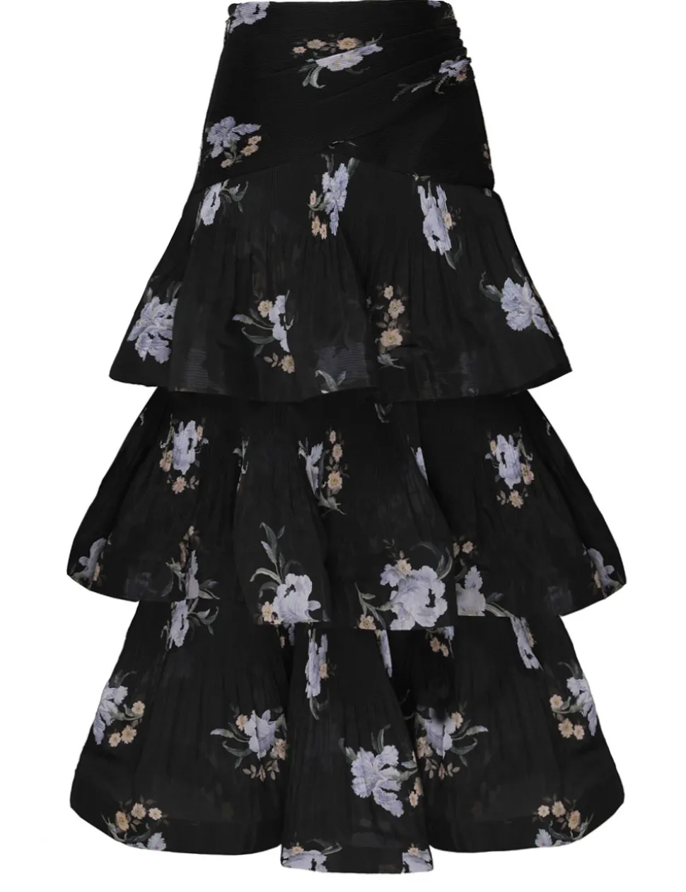 The Pleated Tiered Skirt in Black Iris Floral from our Fall 2024 Collection, In Illustration. A high waisted midi skirt featuring a pleated waist band and tiers throughout.