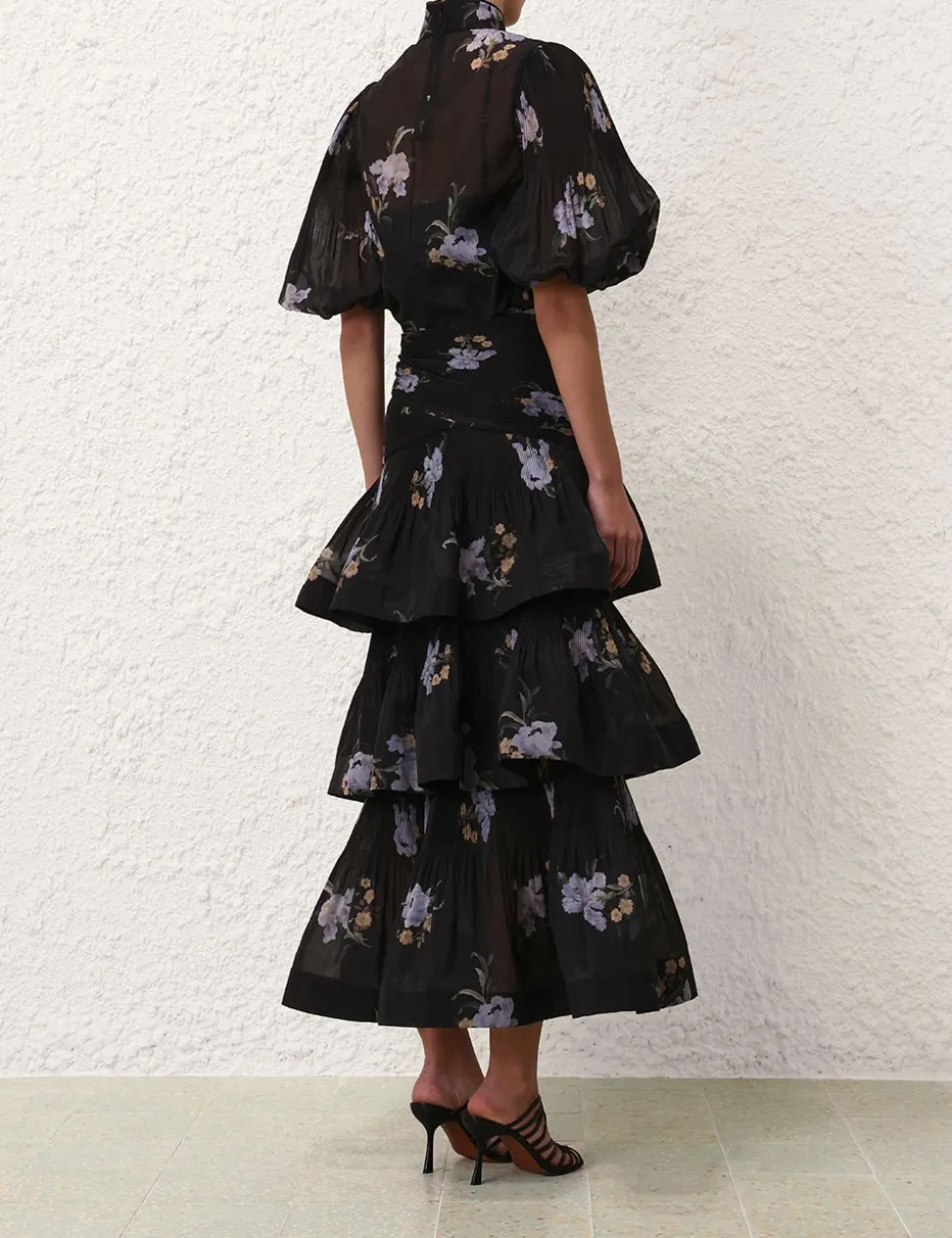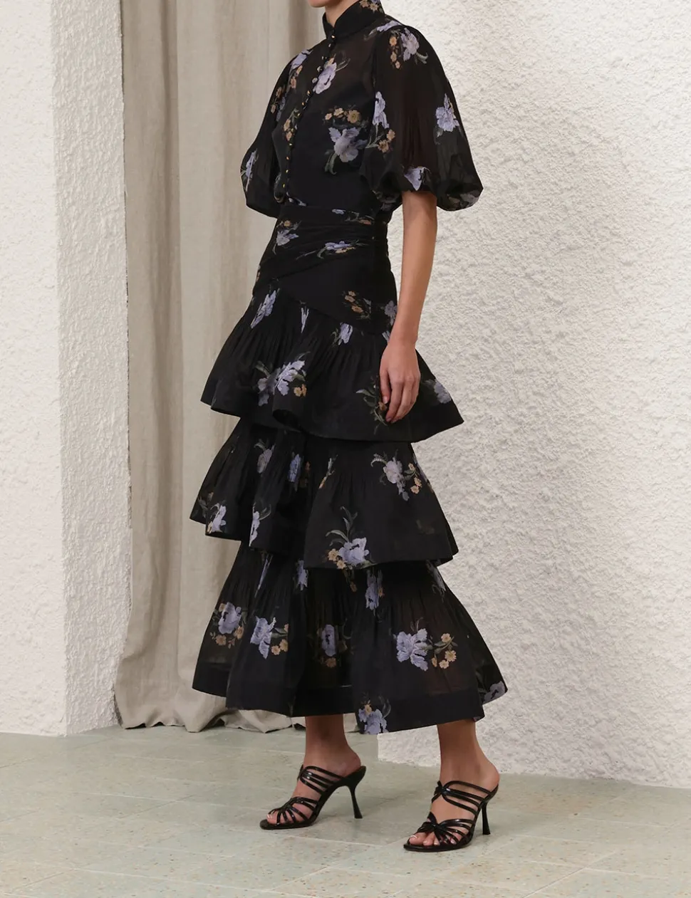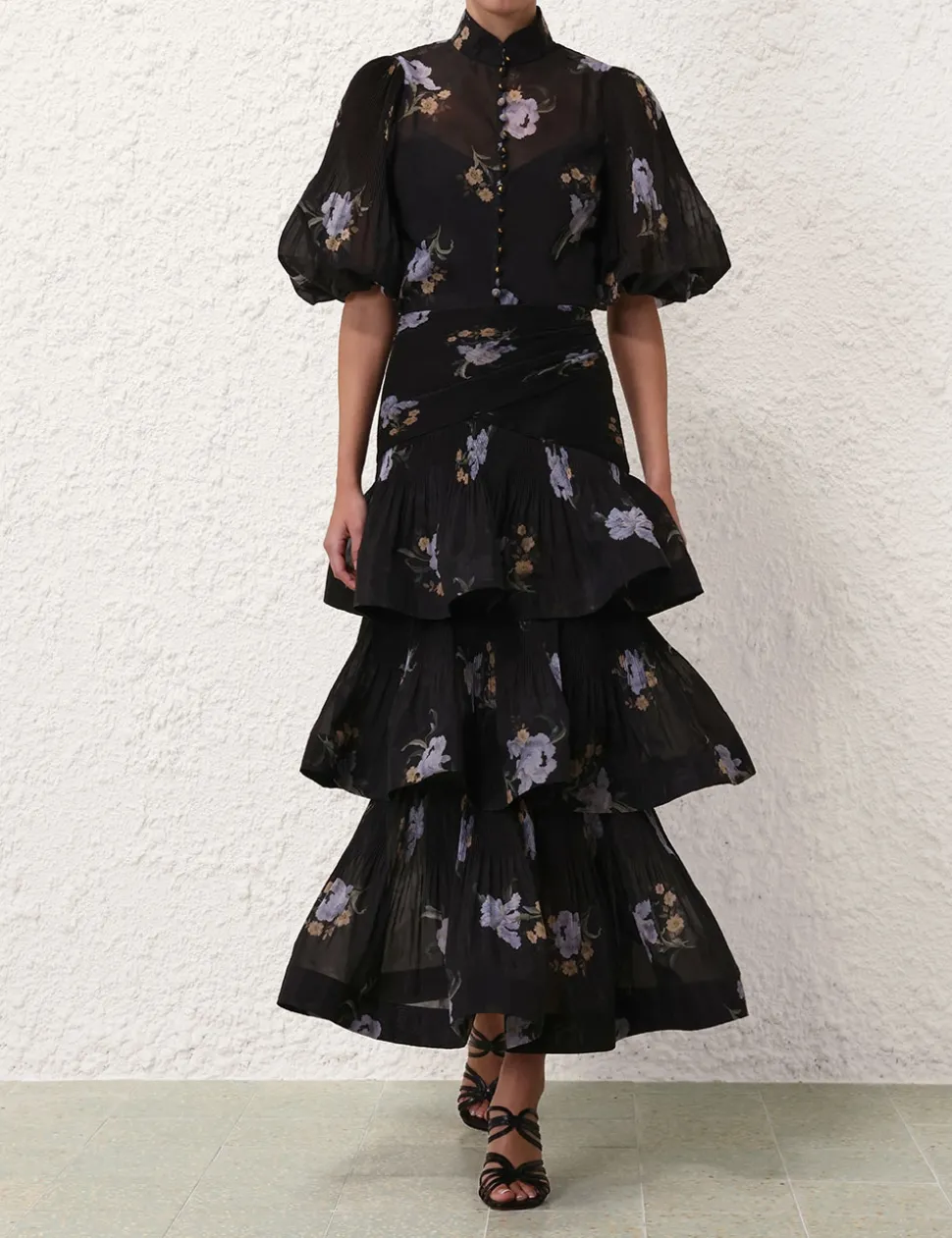 The Pleated Tiered Skirt in Black Iris Floral from our Fall 2024 Collection, In Illustration. A high waisted midi skirt featuring a pleated waist band and tiers throughout.