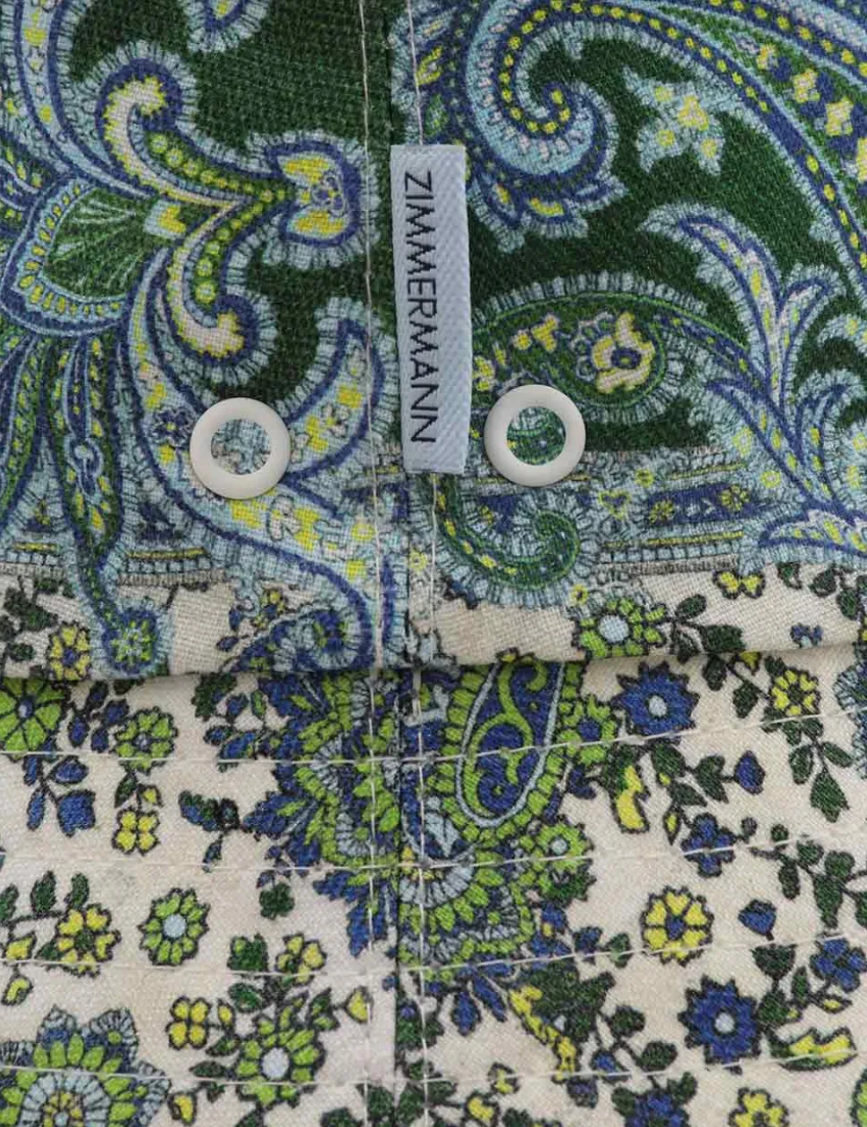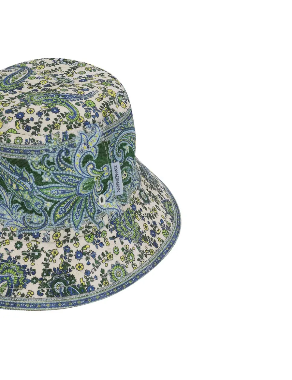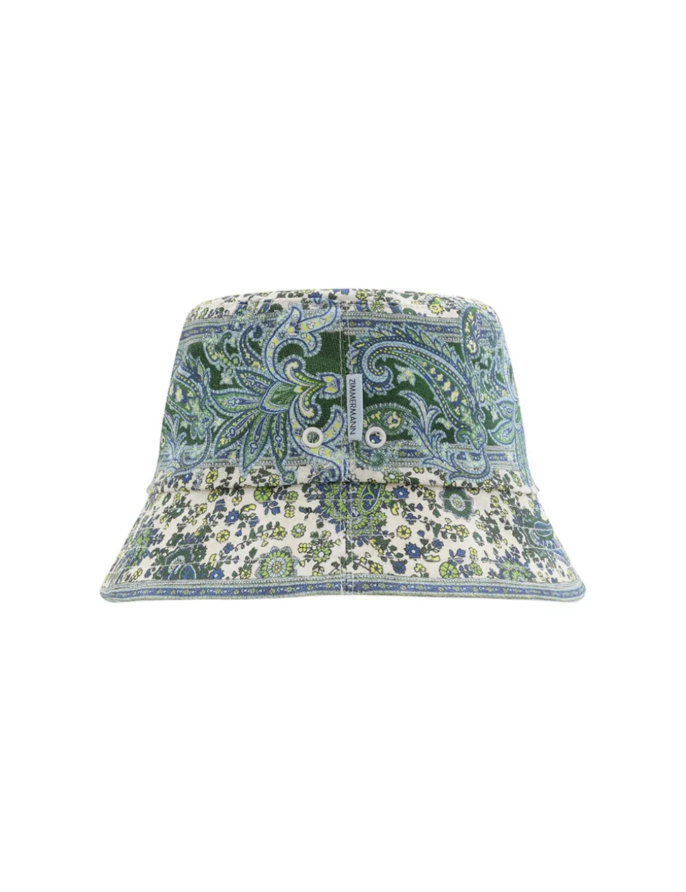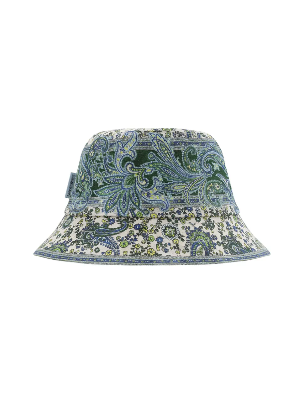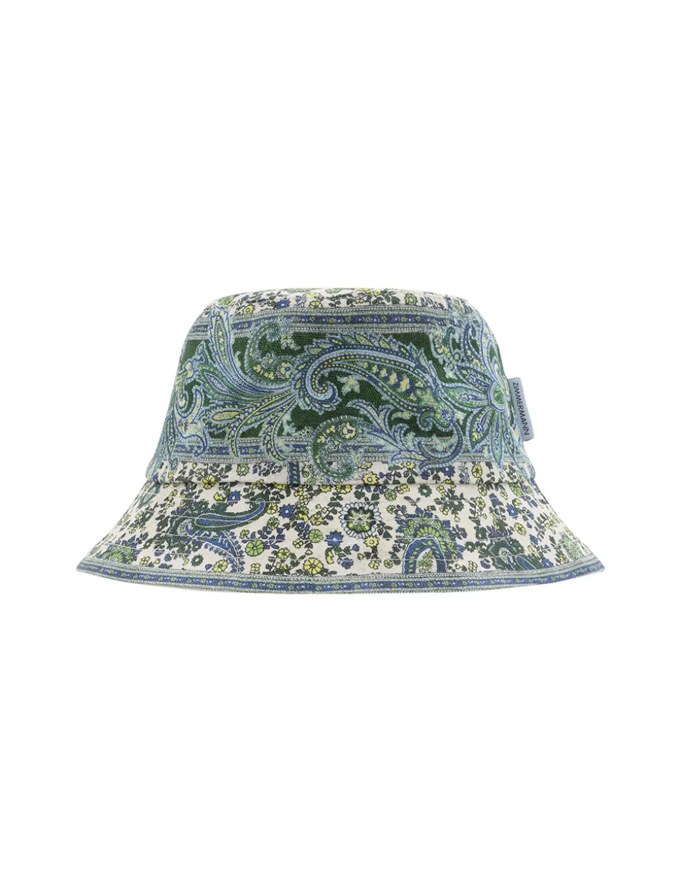The Printed Canvas Bucket Hat in Green Paisley from our Summer Swim 2024 Collection. A cotton bucket hat featuring topstitching around the brim and ventilation in the crown.