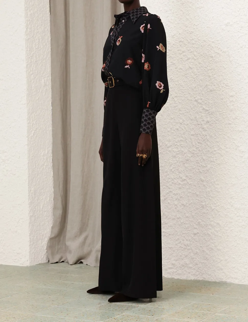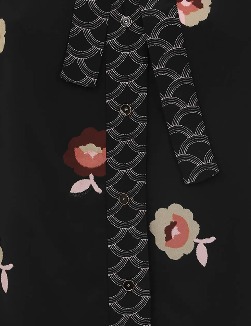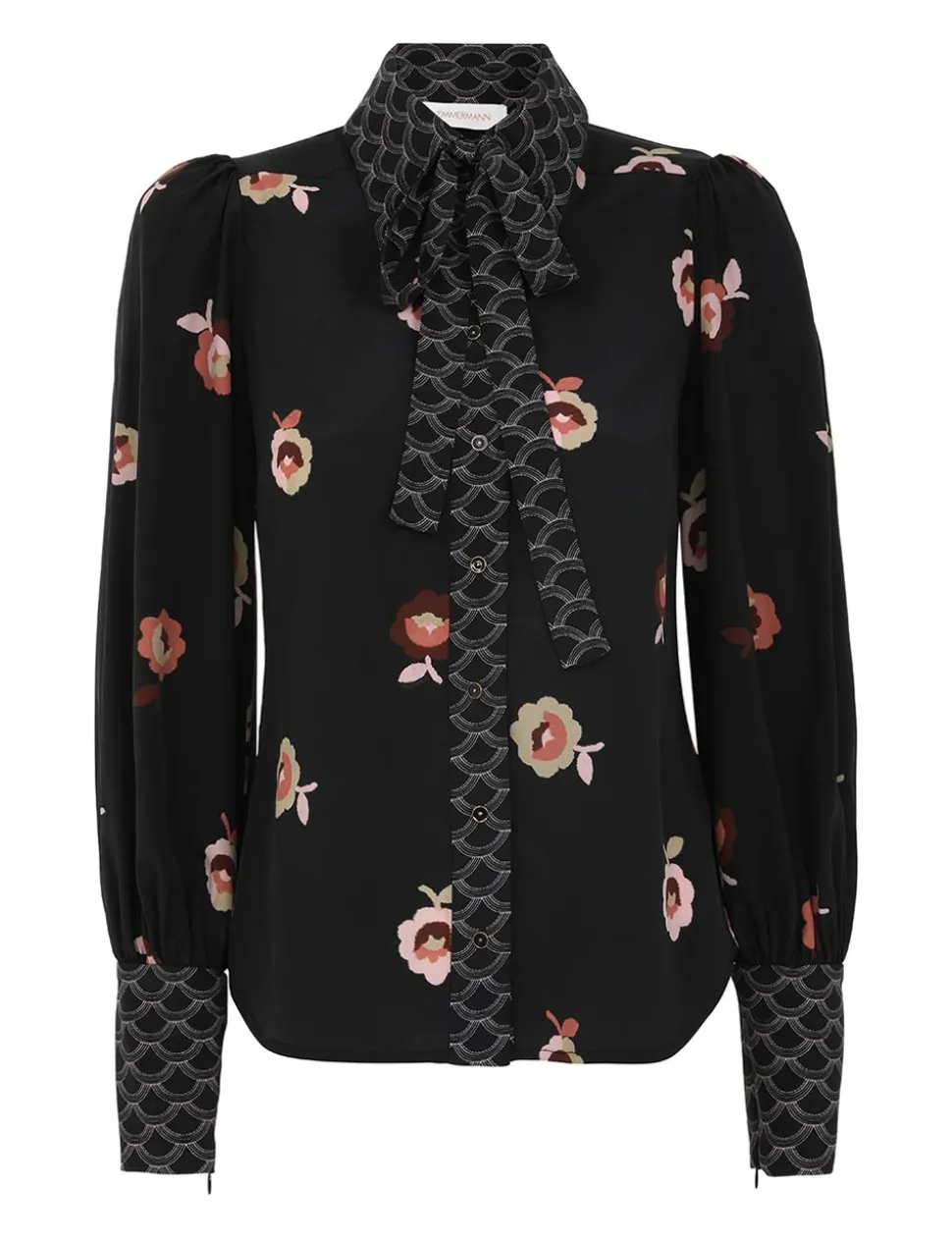 The Pussybow Shirt in Black Floral from our Fall 2024 Collection, In Illustration. A printed shirt featuring a contrast detailing on neckline, placket and cuffs with long blouson sleeves and a removable neck tie.