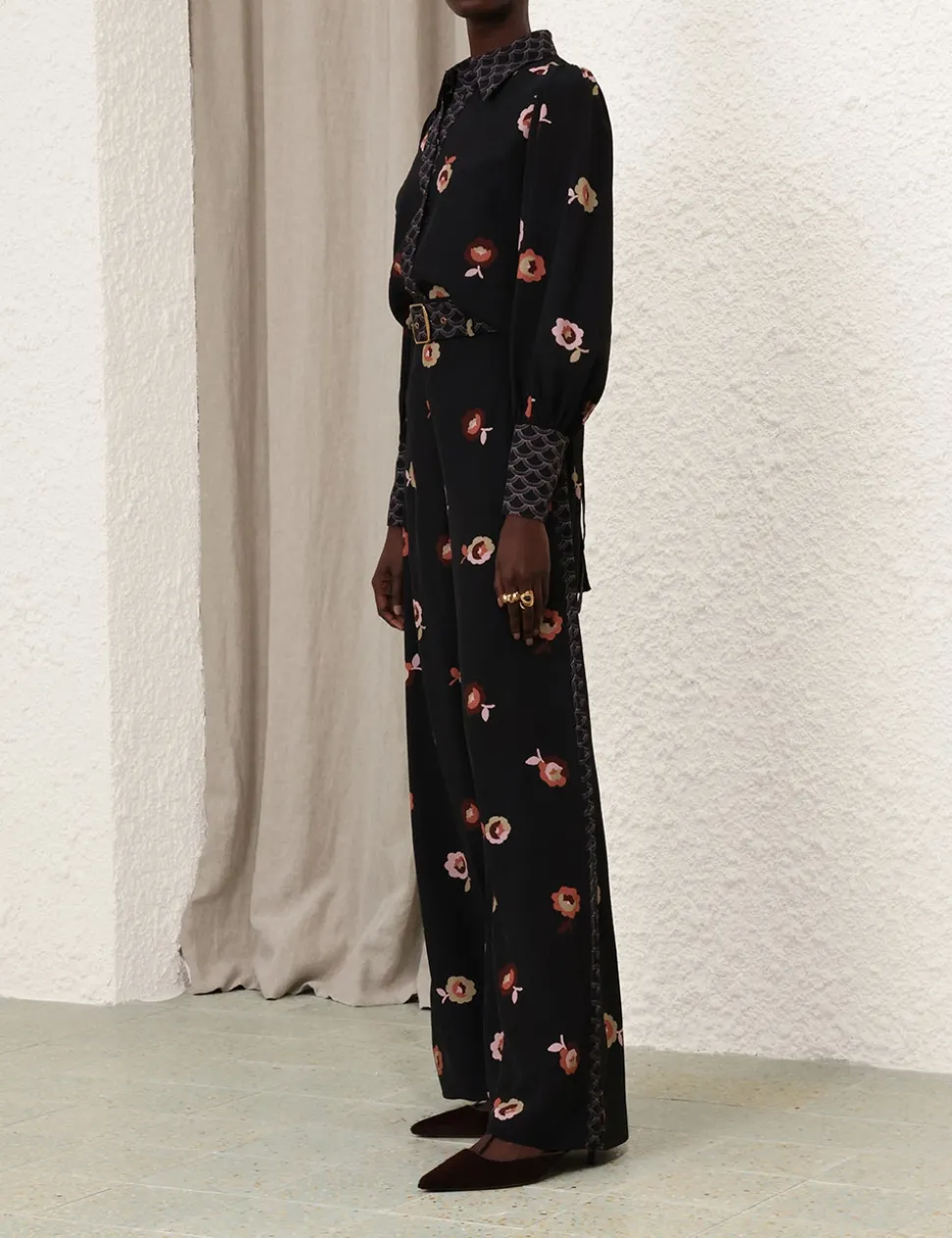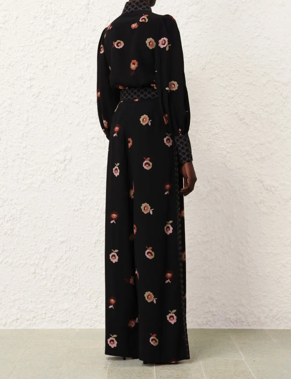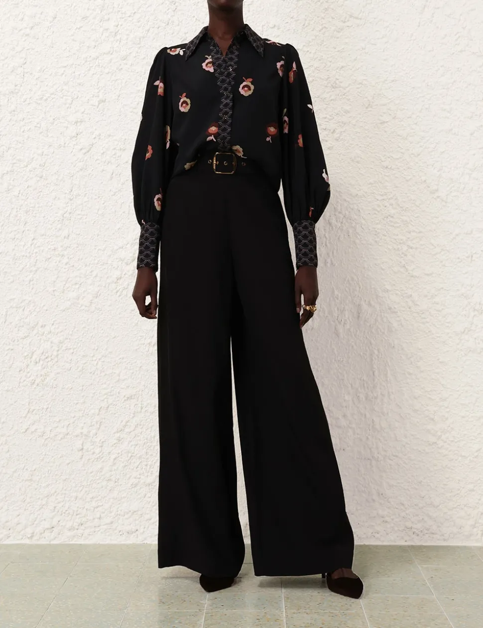 The Pussybow Shirt in Black Floral from our Fall 2024 Collection, In Illustration. A printed shirt featuring a contrast detailing on neckline, placket and cuffs with long blouson sleeves and a removable neck tie.