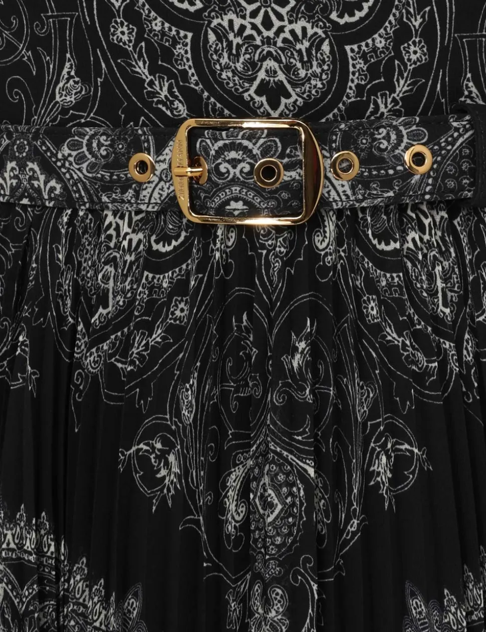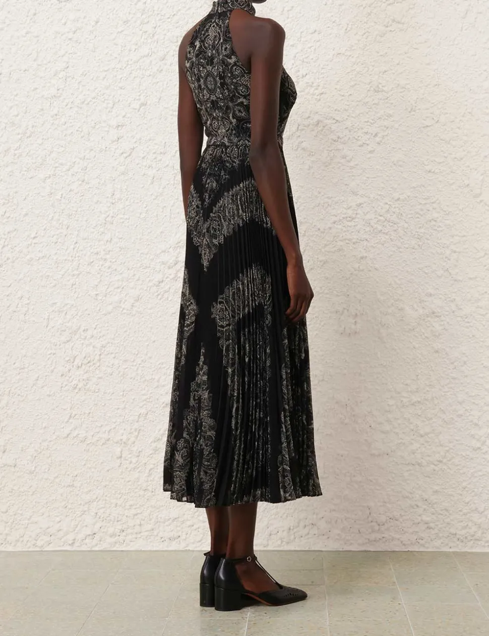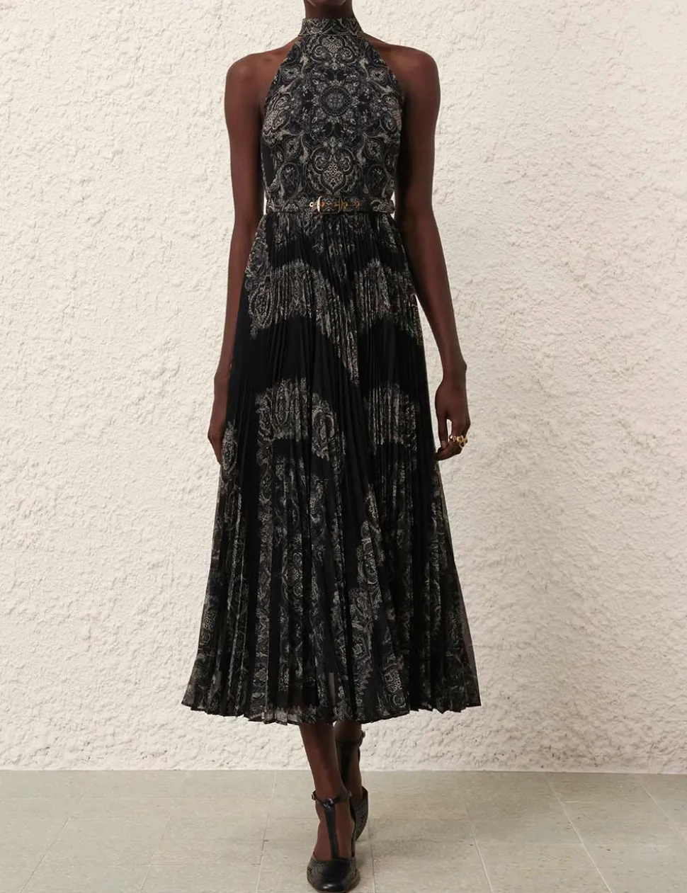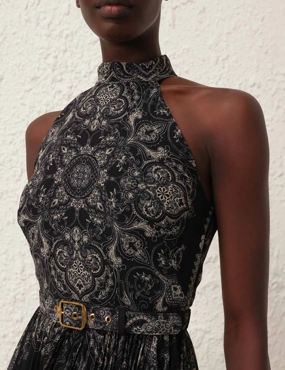 The Sunray Halter Picnic Dress in Black Paisley from our Fall 2024 Collection, In Illustration. A high neck midi dress featuring a pleated skirt and belted waist.
