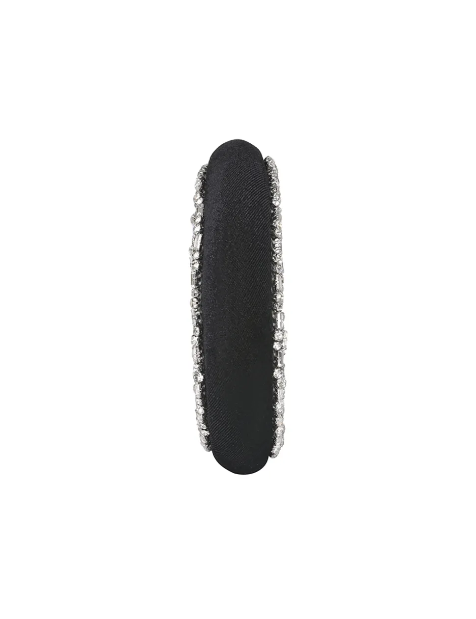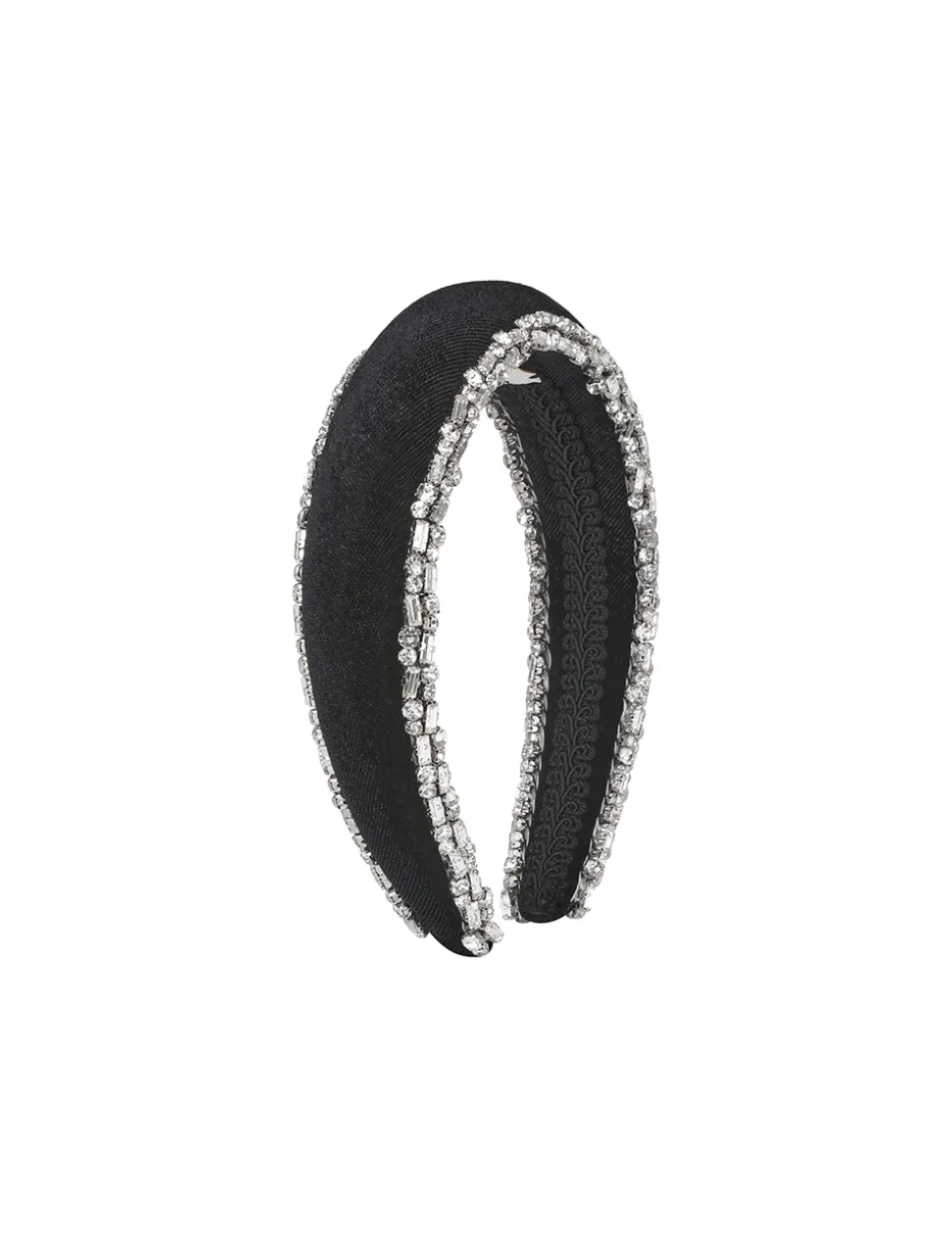 The Velvet Rhinestone Headband in Black from our Fall 2024 Collection, In Illustration. A velvet headband featuring a rhinestone trim.