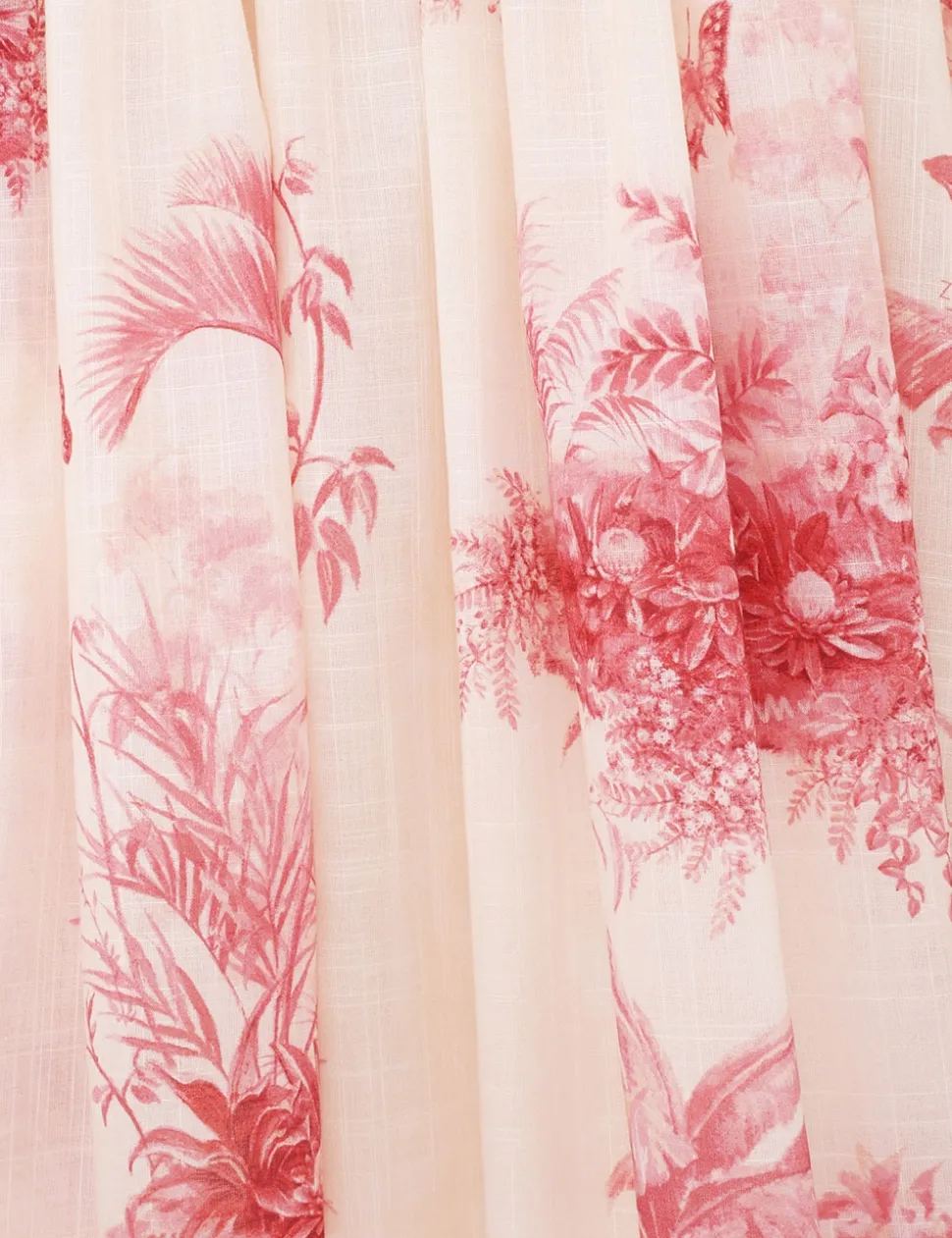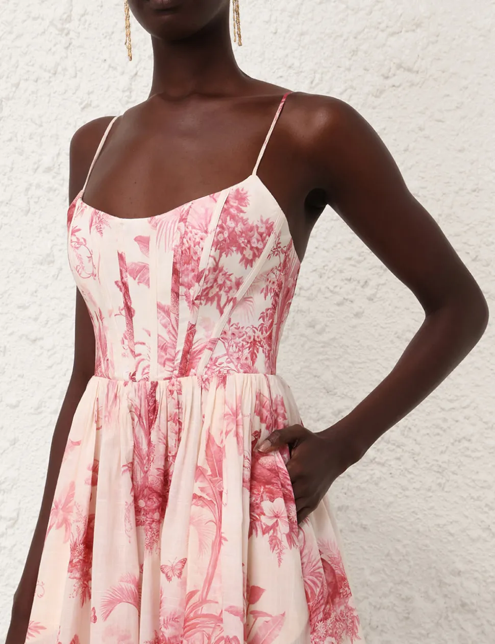 The Waverly Corset Midi Dress in Pink Palm from our Summer Swim 2024 Collection. A cotton midi dress featuring a corset bodice and full skirt with adjustable straps and side seam pockets.