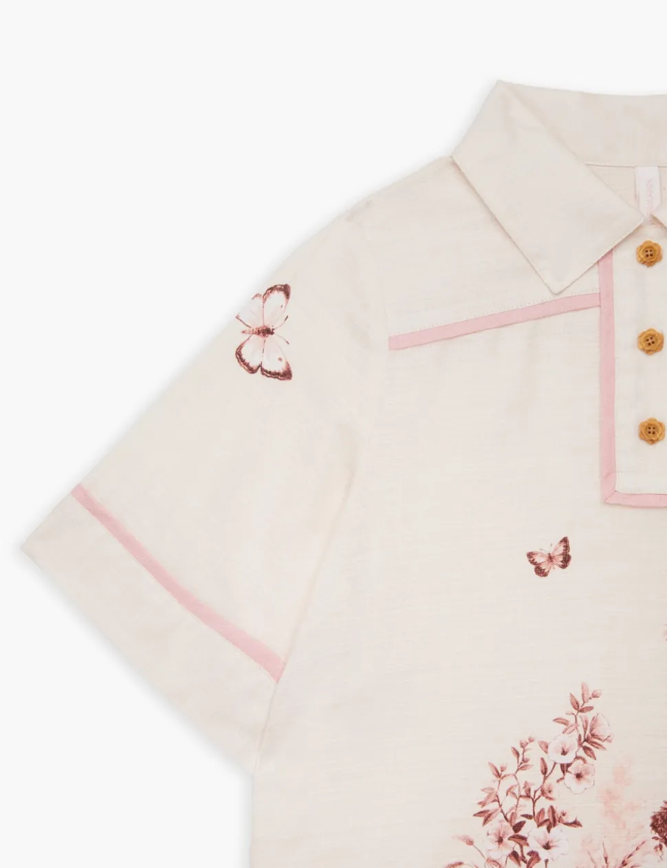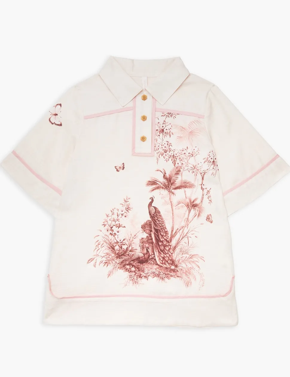 The Waverly Tunic Dress in Pink Palm from our Summer Swim 2024 Collection. A cotton tunic dress featuring a classic collar and buttons down the front opening.