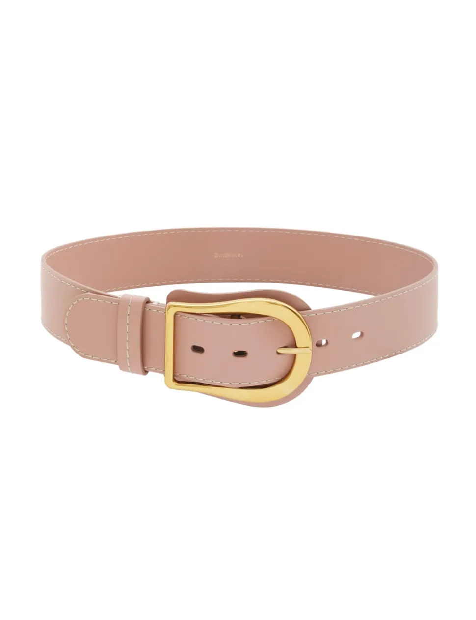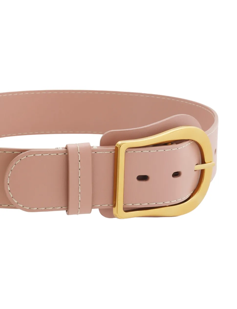 The Wide Leather Belt 40 in Rose from our Summer Swim 2024 Collection. A leather belt featuring a twisted gold buckle and custom branding.