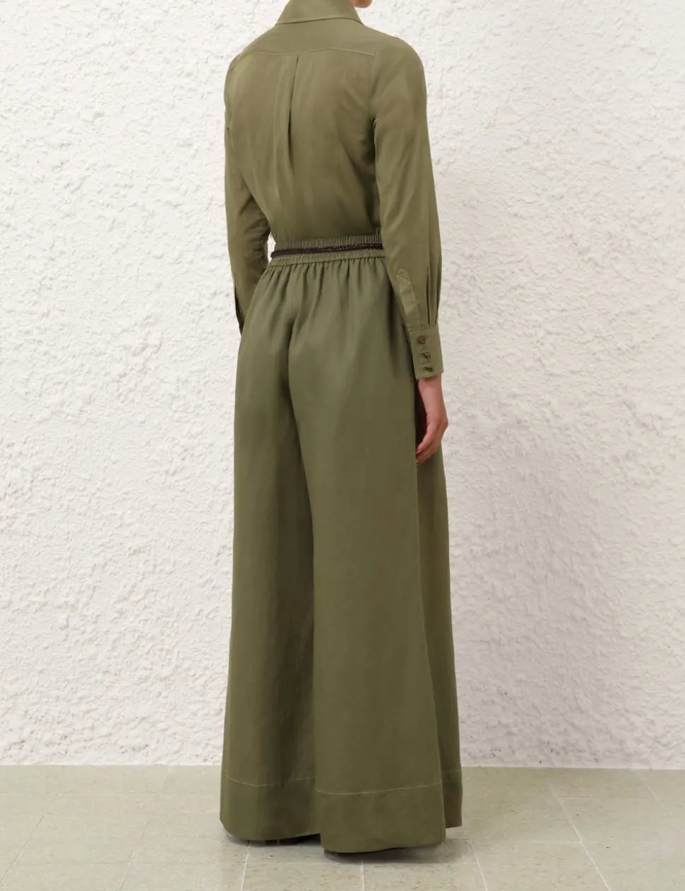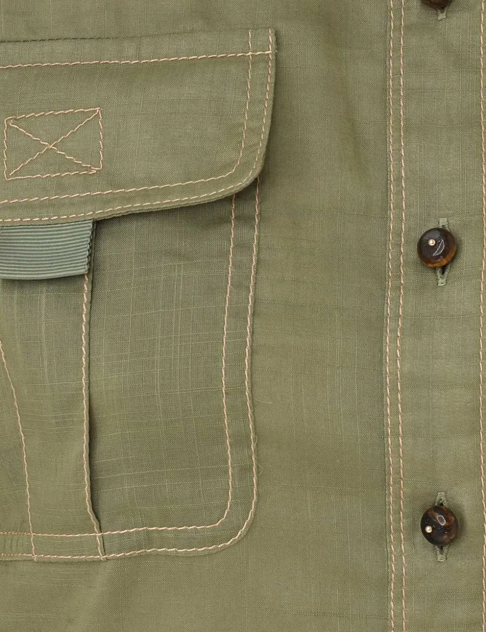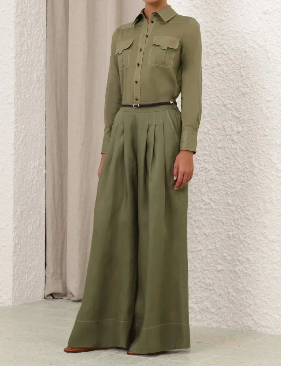 The Wylie Body Shirt in Olive from our Resort Swim 2025 Collection. A long sleeve cotton shirt featuring a classic collar, chest pockets and centre front button closure.