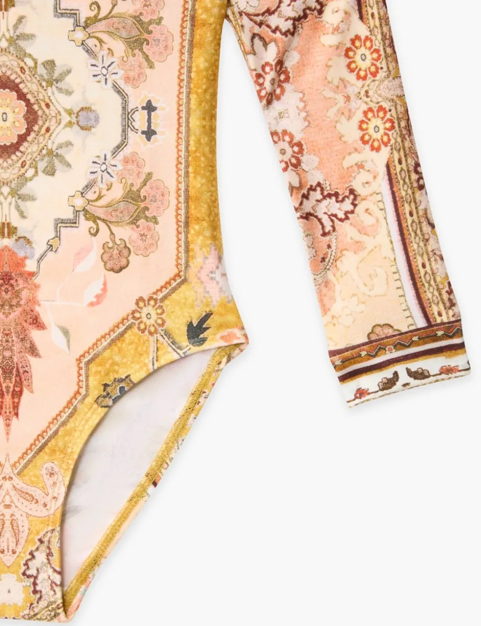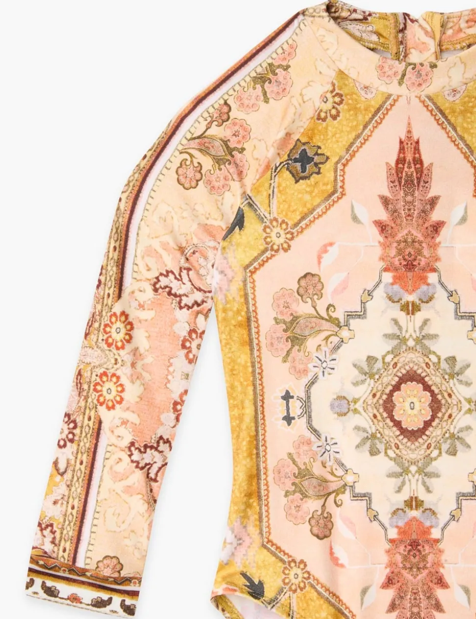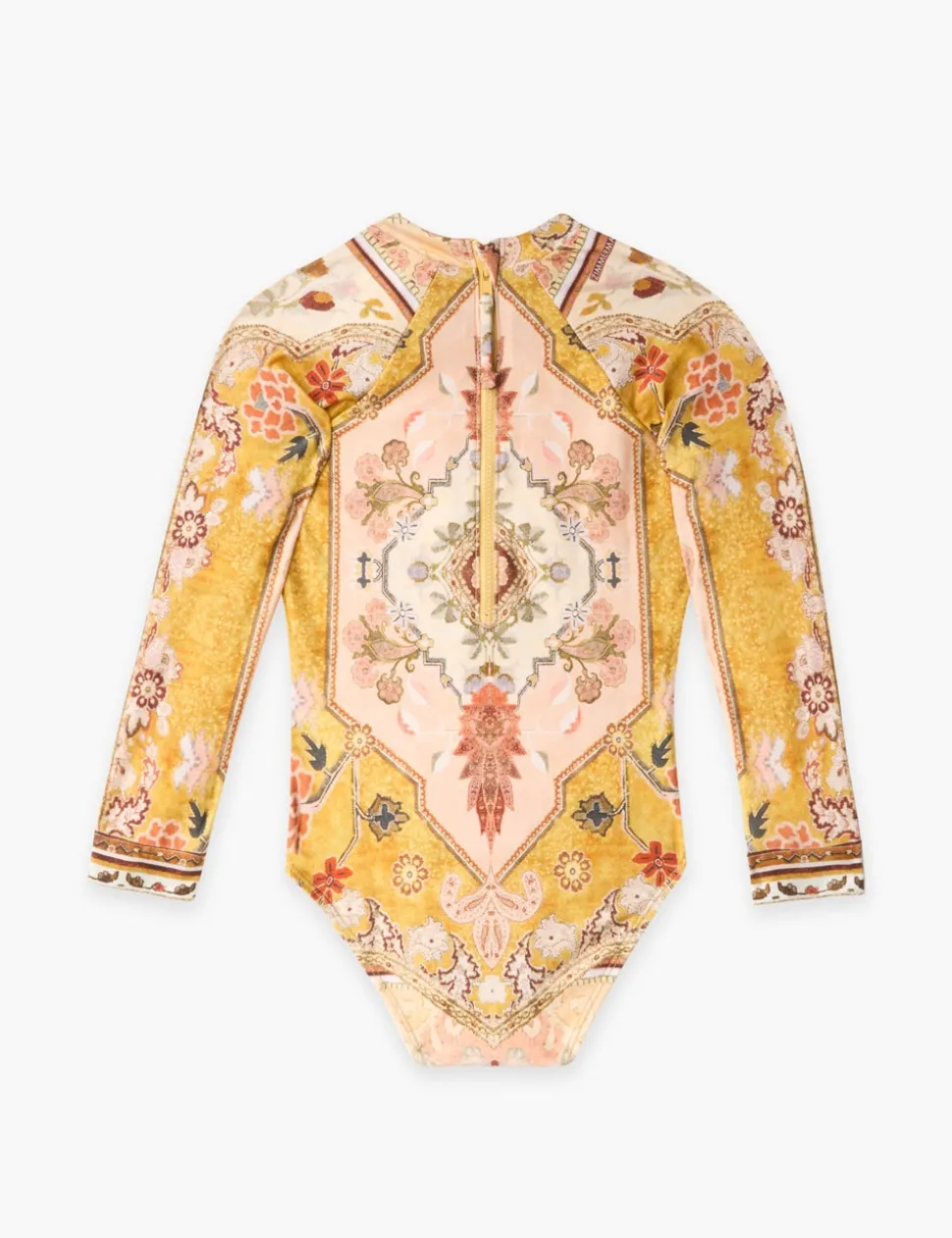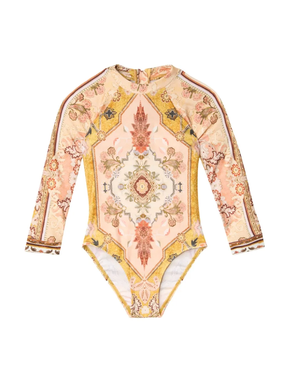 The Wylie Long Sleeve 1PC in Mustard Multi from our Resort Swim 2025 Kids Collection. A long sleeve one piece featuring a high neck and centre back zip.